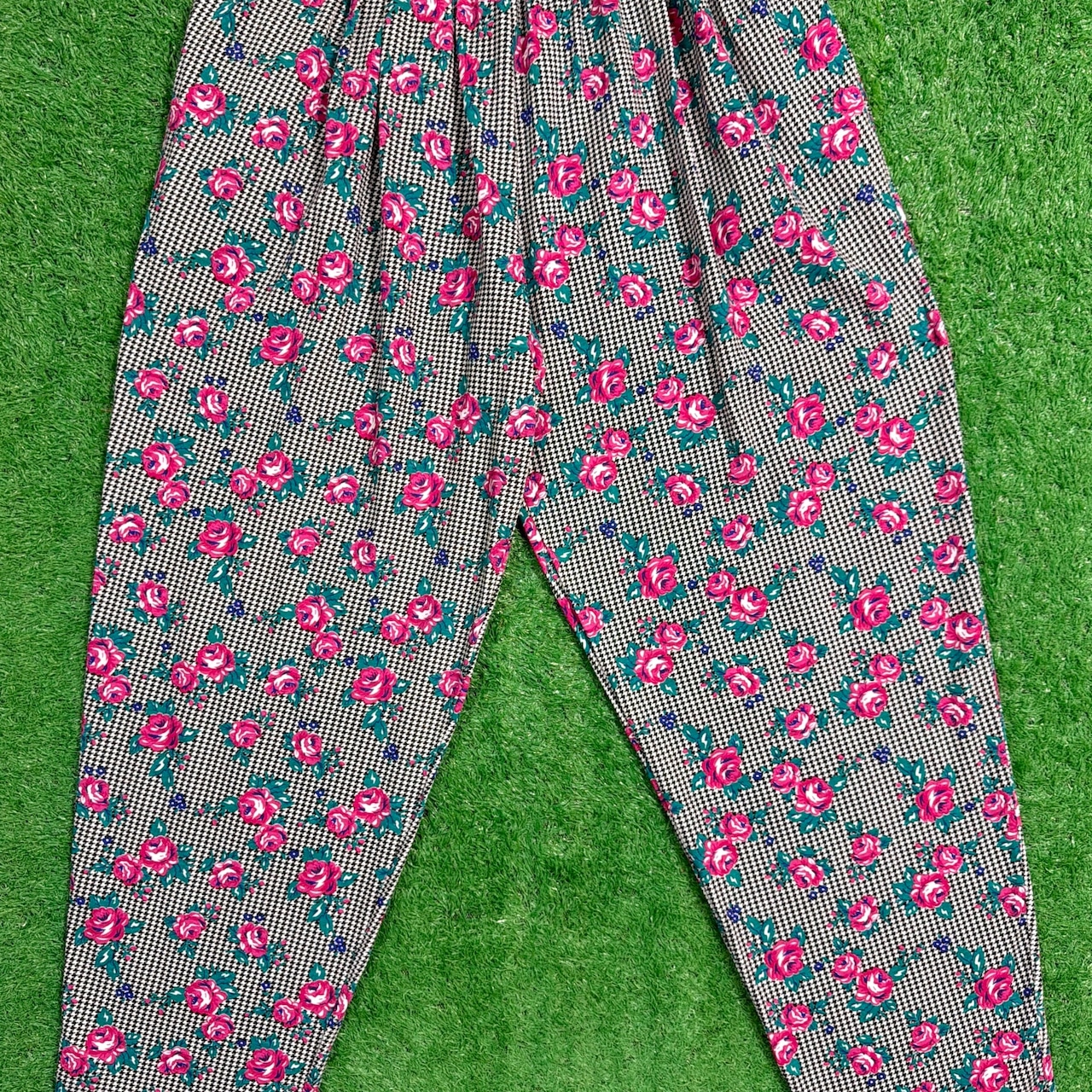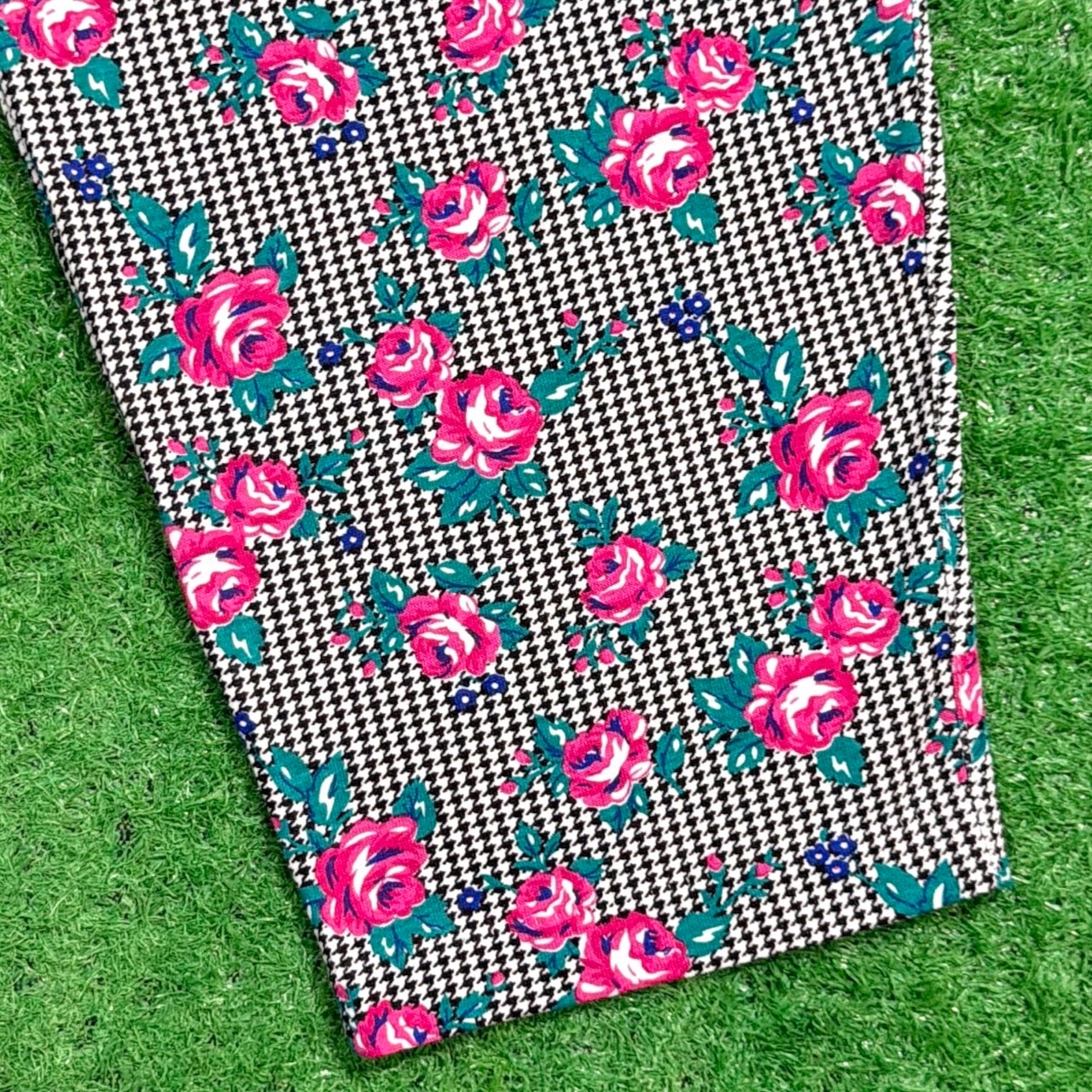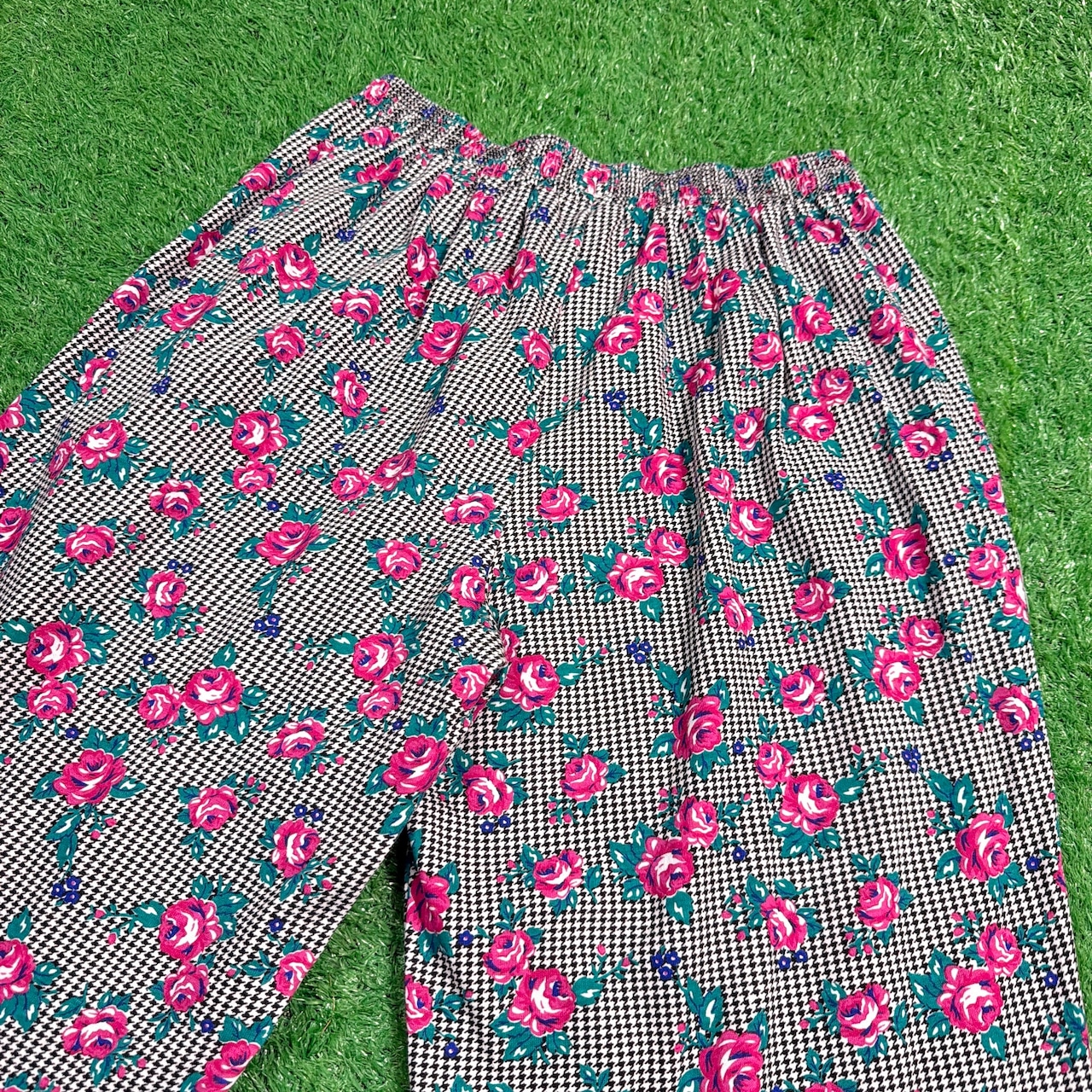 ブラック×ホワイトの細かいチェックのベースに、鮮やかなピンクのローズ柄が全面にあしらわれた華やかなデザイン。薄手のポリコットン素材で軽やかに穿ける一本です。ウエストはゴム仕様でリラックスした履き心地が魅力です。