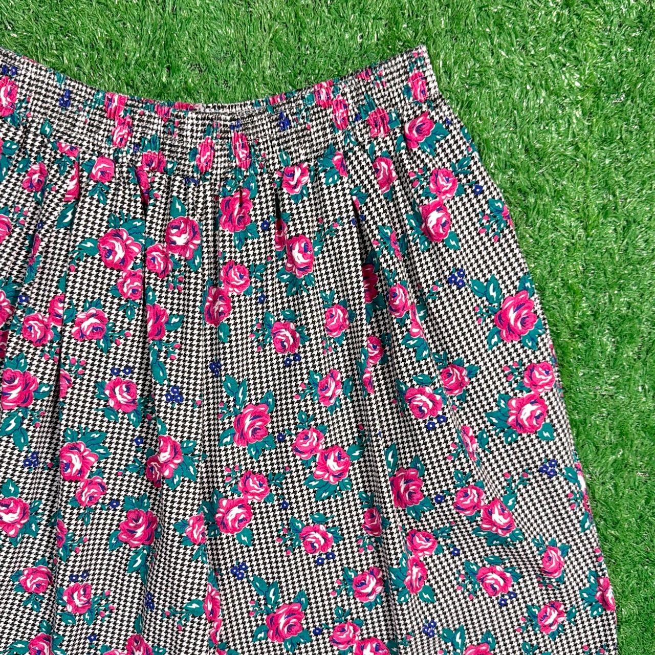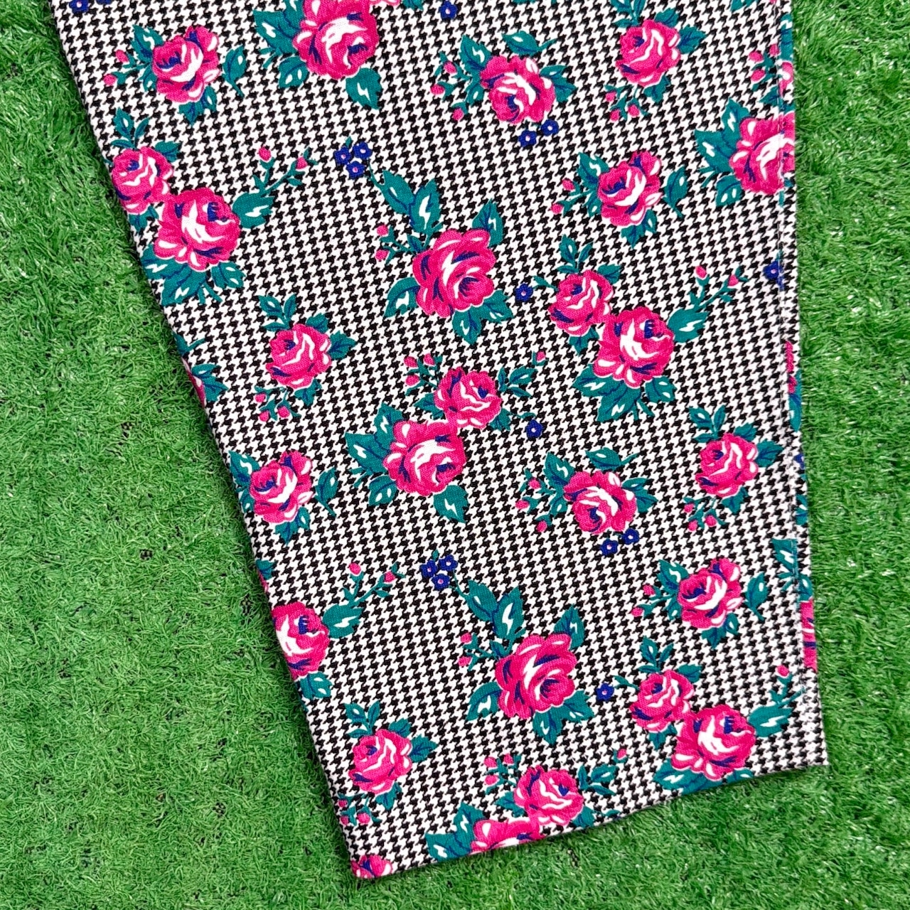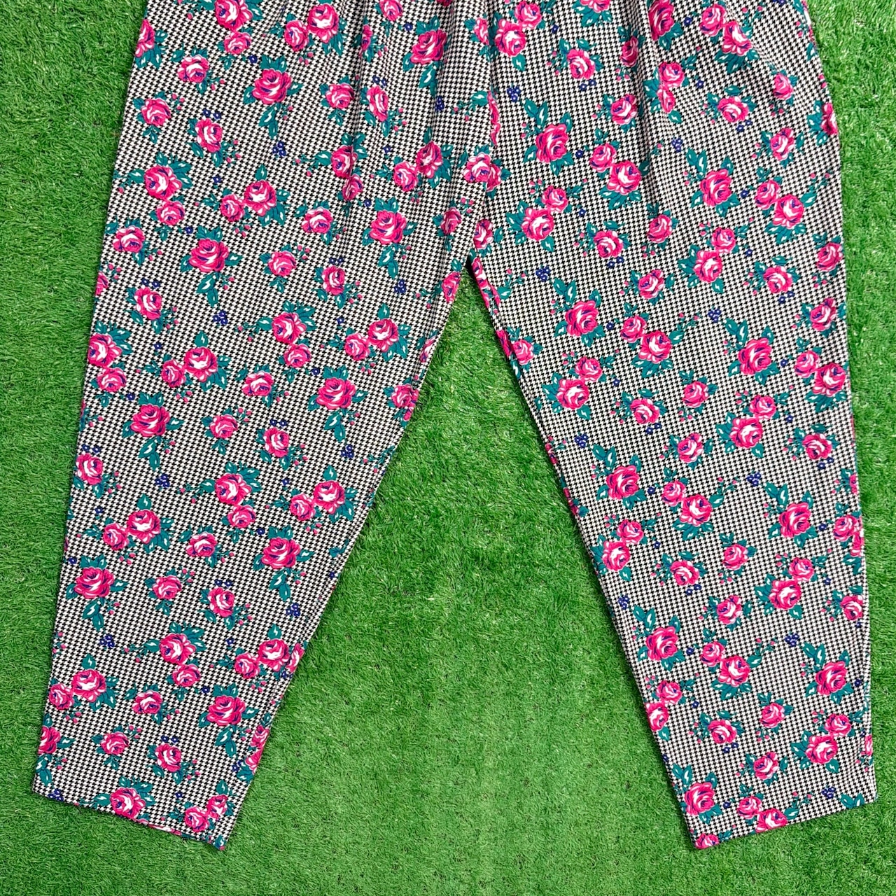 ブラック×ホワイトの細かいチェックのベースに、鮮やかなピンクのローズ柄が全面にあしらわれた華やかなデザイン。薄手のポリコットン素材で軽やかに穿ける一本です。ウエストはゴム仕様でリラックスした履き心地が魅力です。