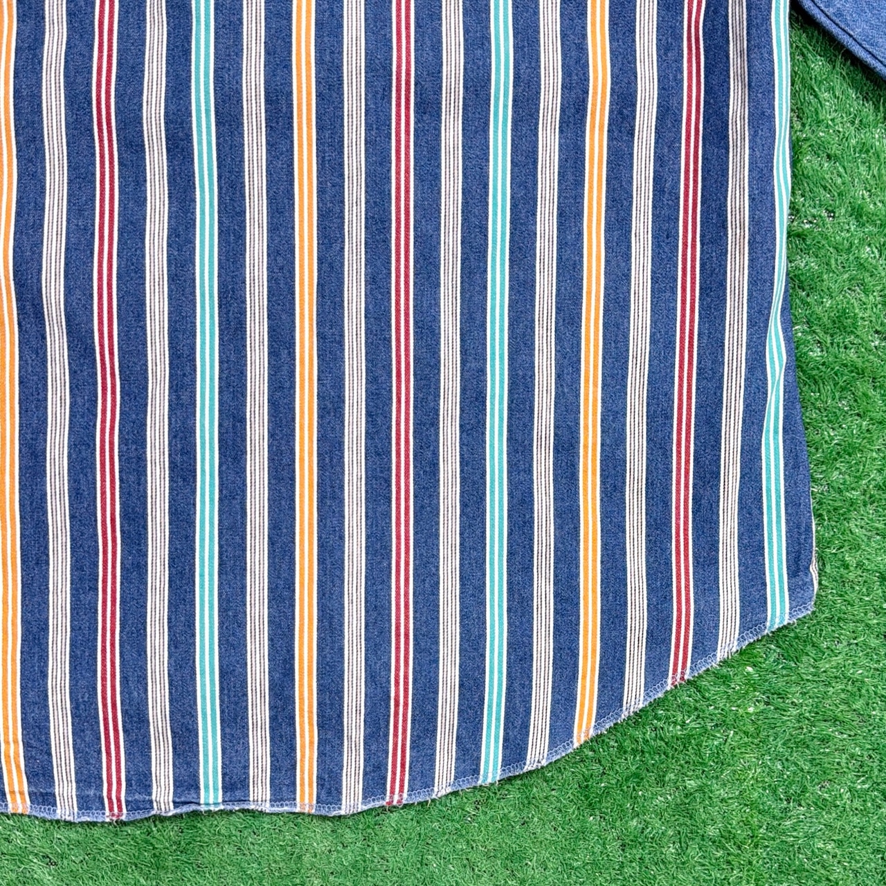 フロントとバックマルチカラーのストライプ生地を切り替えたデザインで、ウエスタンシャツらしいスナップボタン仕様。デニムのボディに鮮やかなストライプが映える存在感ある一枚です。胸ポケットも切り替え部分に配置され、デザイン性と実用性を兼ね備えています。