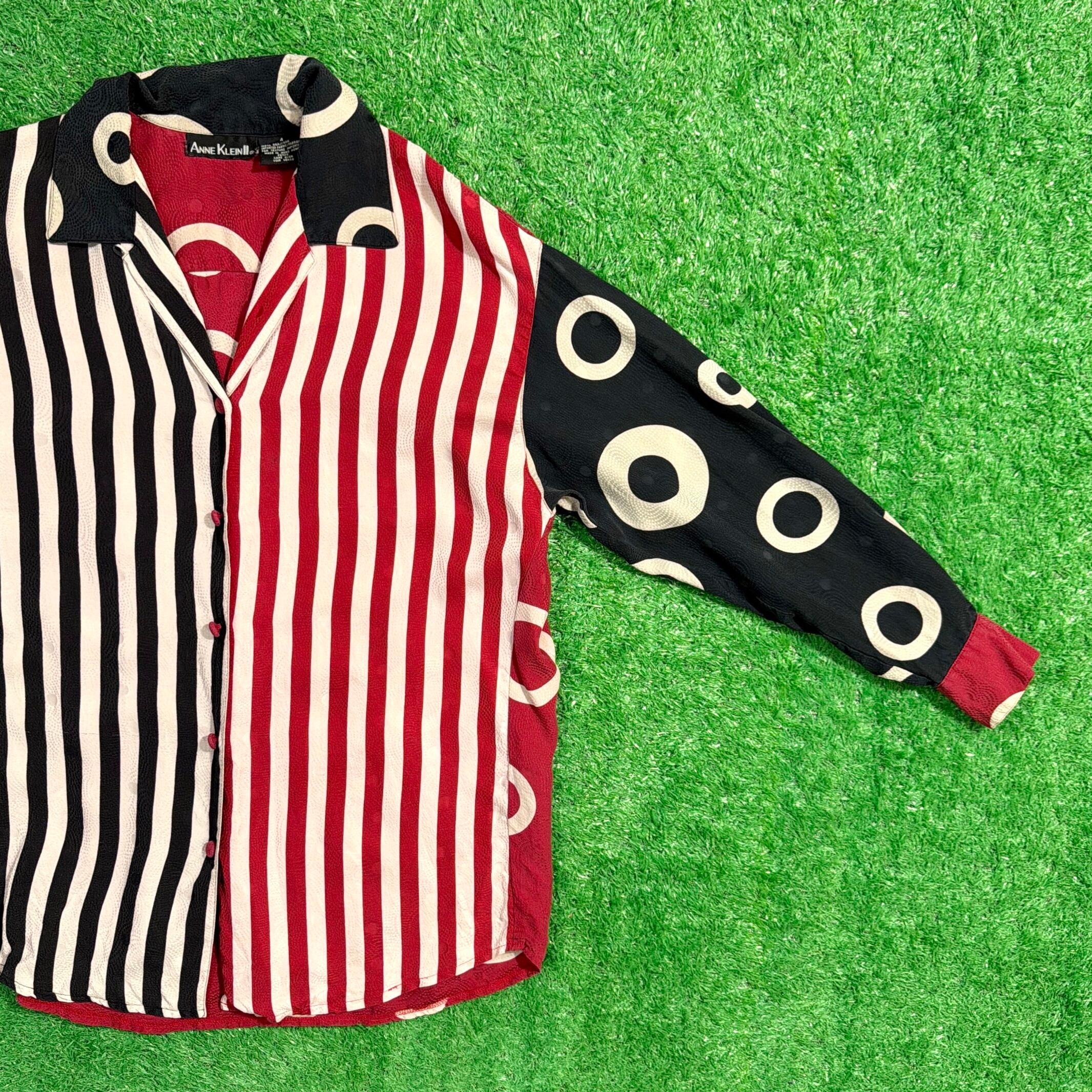 フロントはストライプ、袖やバックには大小のドットがあしらわれた個性的なデザイン。赤・黒・白の大胆な配色が、90sらしいインパクトを放つ一枚です。