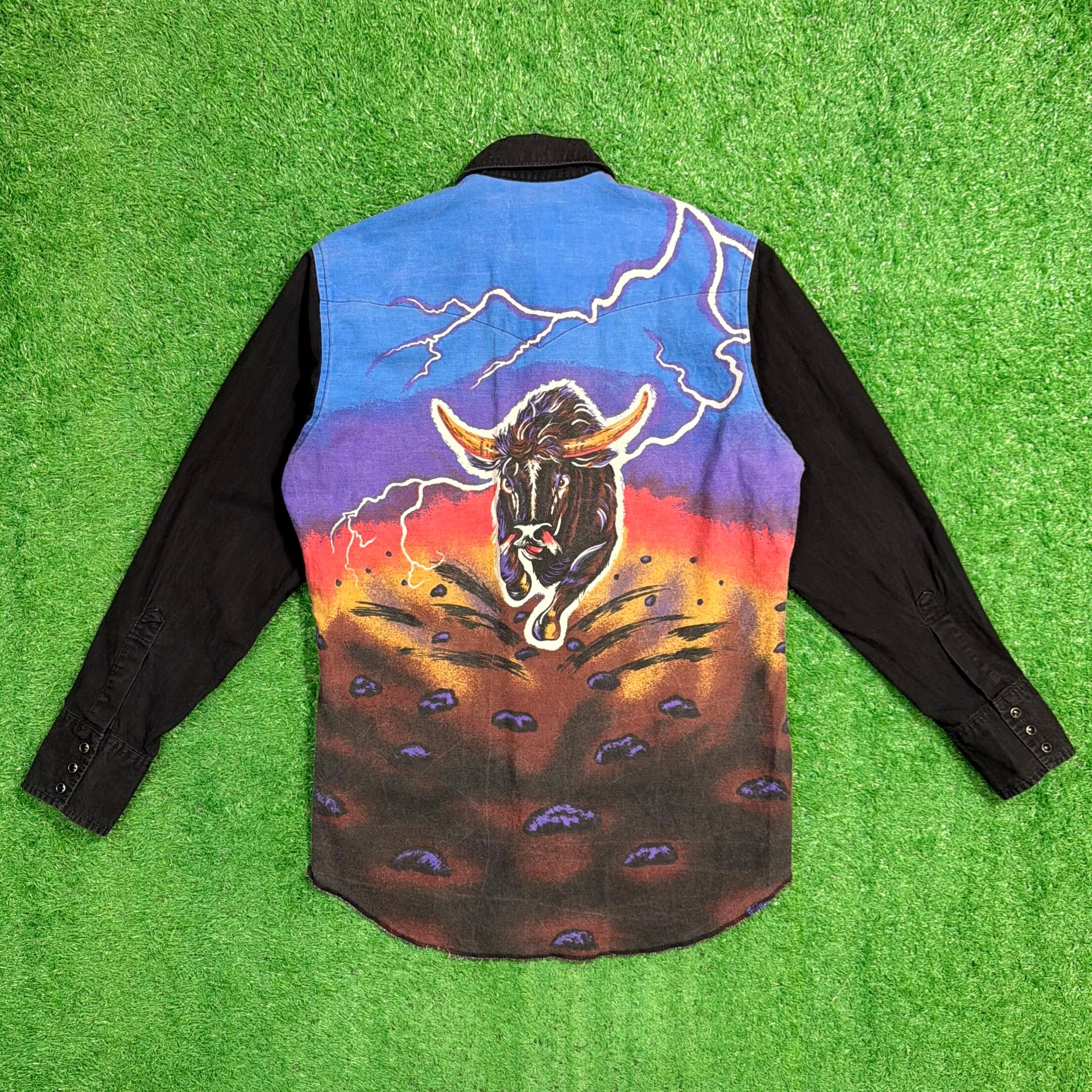 90年代のWrangler(ラングラー)、迫力あるバッファローのイラストがバックに描かれたウエスタンシャツです。