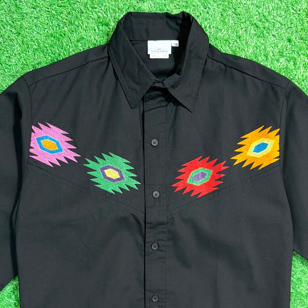 ブラックのボディにピンク・グリーン・レッド・イエローのカラフルな刺繍が映えるデザインで、ネイティブ調・オルテガ柄の雰囲気を楽しめる一着。