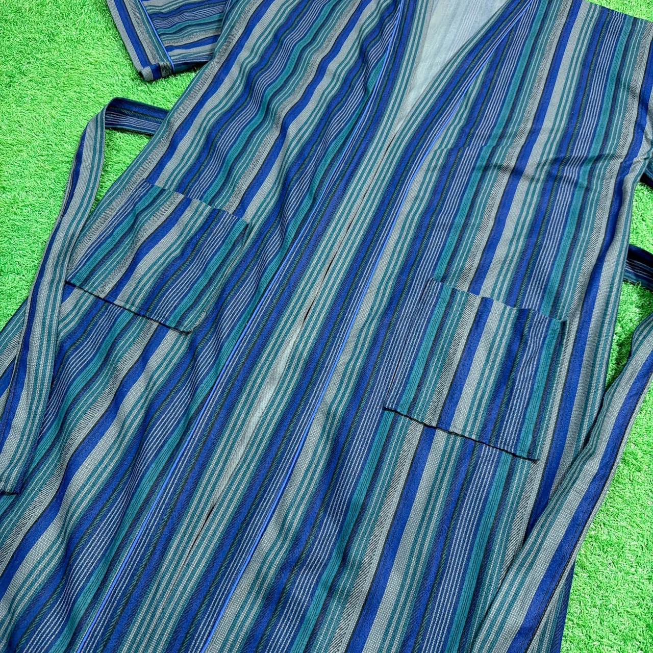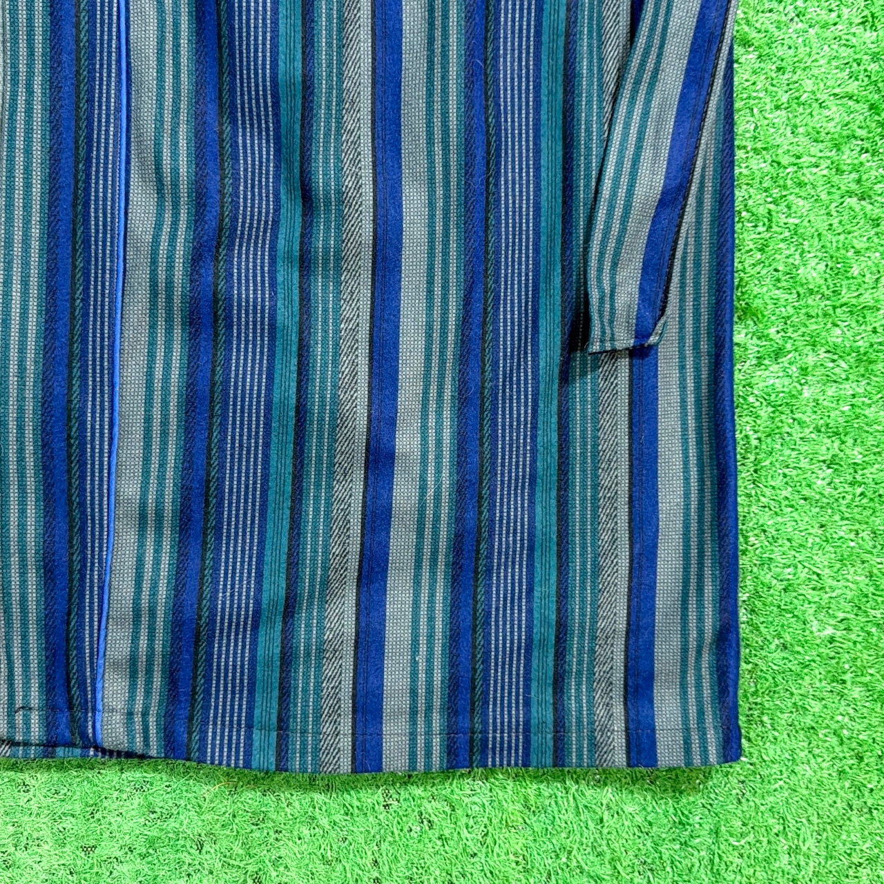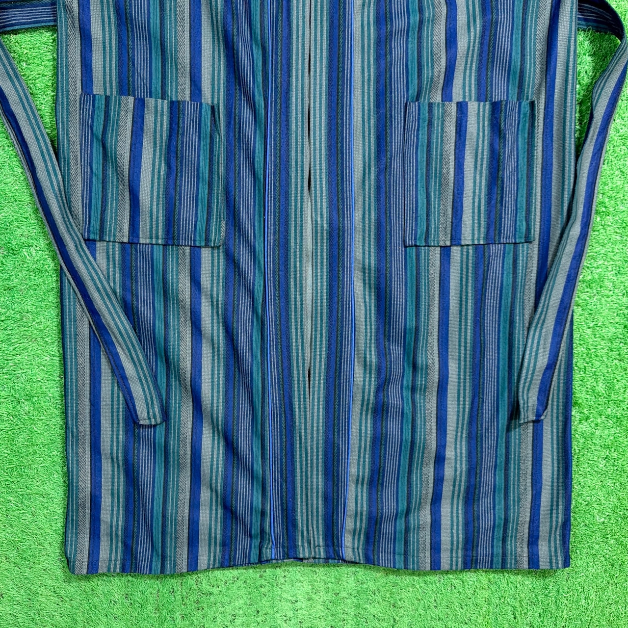 ブルーを基調としたマルチストライプが特徴的で、落ち着いた色合いながらも存在感のあるデザイン。ポリエステル素材で若干起毛感があり、柔らかい風合いと軽やかな着心地を楽しめる一枚です。フロントポケット付きで実用性もあり、カーディガン感覚で羽織れるのも魅力。