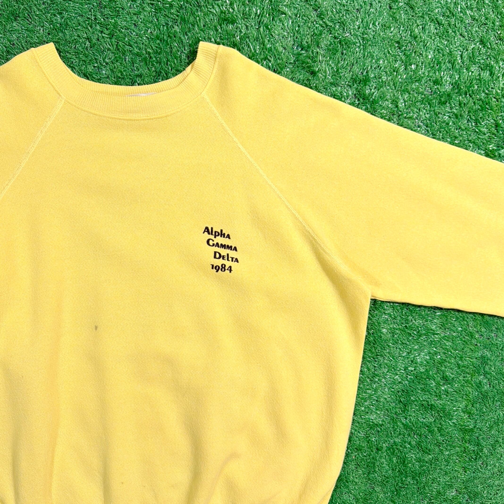 フロントには「Alpha Gamma Delta 1984」、背面には「One Hay of a Halloween」の文字とイラストがプリントされたデザイン。Alpha Gamma Deltaはアメリカの大学に存在する女子学生の社交クラブのひとつで、本アイテムは1984年のハロウィンイベント用に製作された記念スウェットです。鮮やかなイエローカラーとユニークなプリントが存在感抜群の一着。