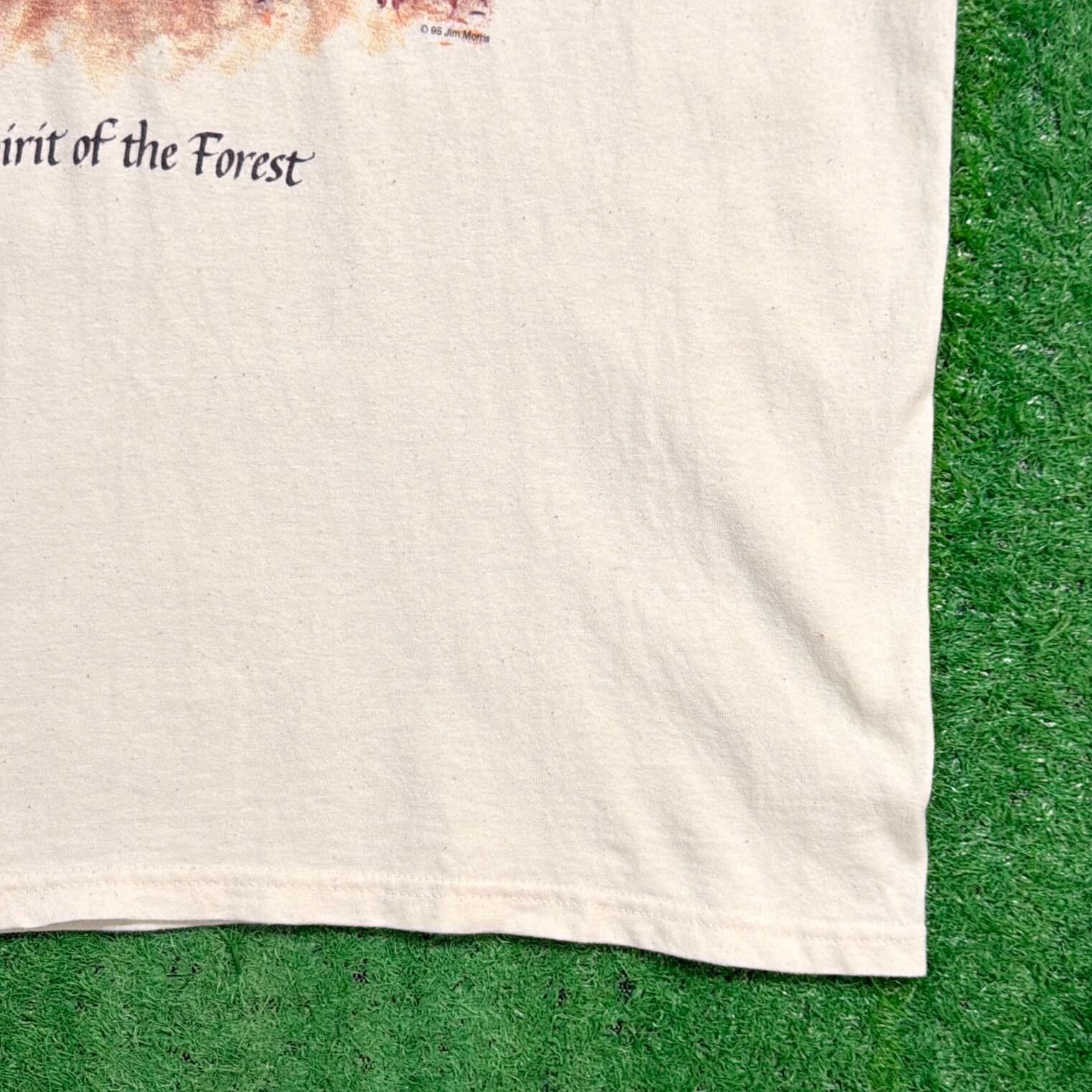 フロントには、森の中からこちらをのぞくオオカミのイラストが大きくプリントされ、下には「Spirit of the Forest(森の精霊)」とメッセージが入っています。自然や動物をテーマにした90sらしいデザインが印象的な1枚です。落ち着いたベージュカラーも雰囲気抜群。