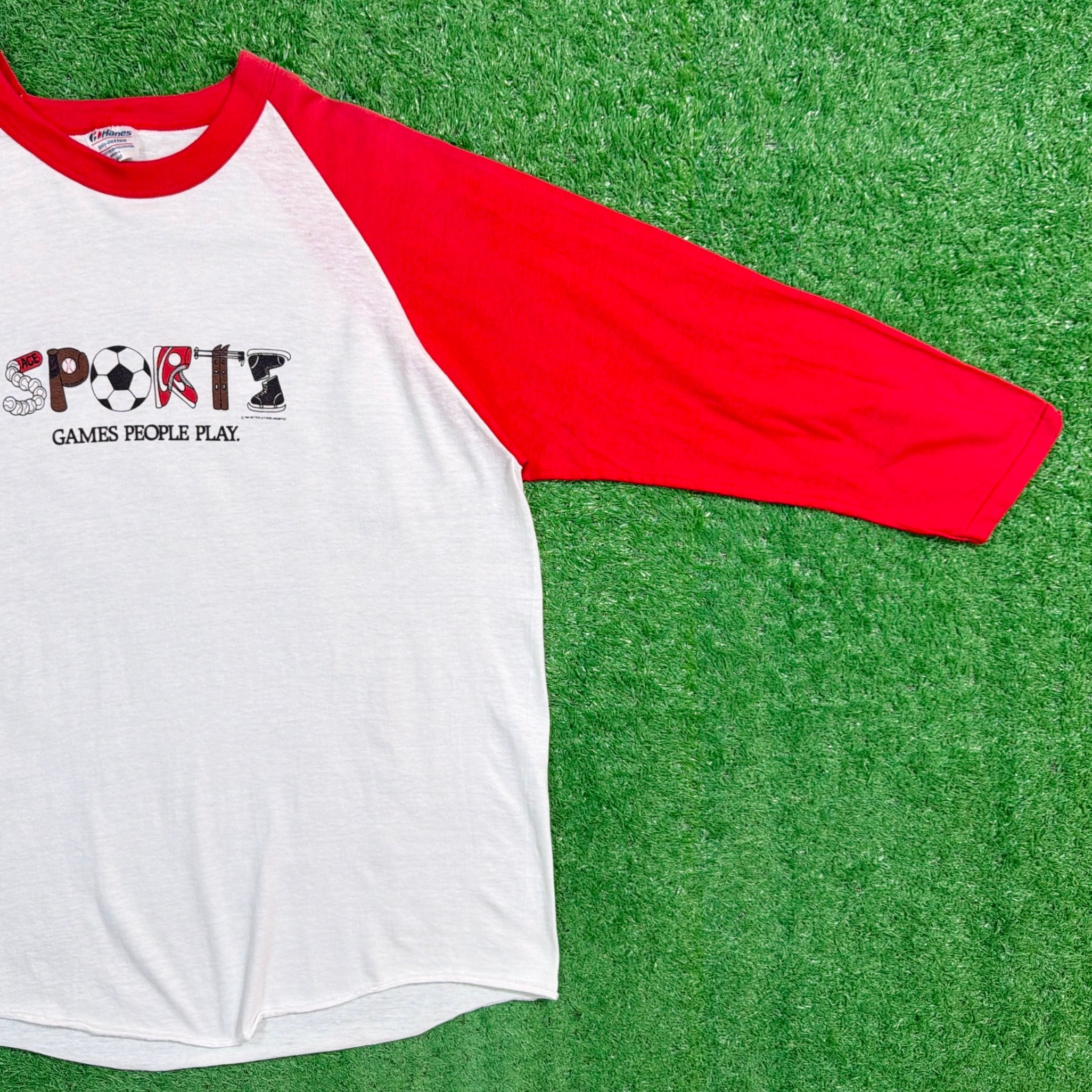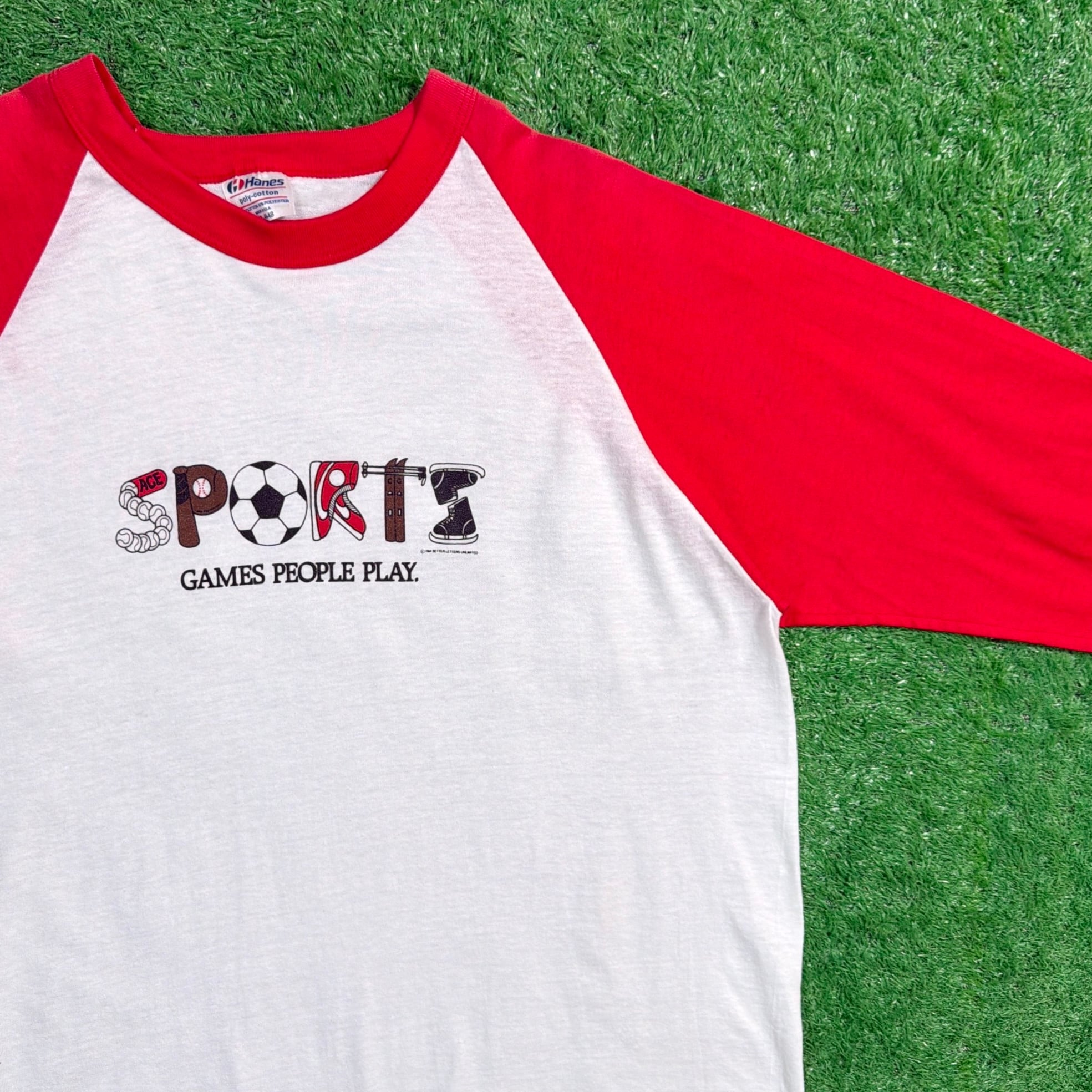 フロントには「SPORTS / GAMES PEOPLE PLAY」の文字と、各文字をスポーツアイテムで表現したユニークなプリント入り。赤×白の切り替えカラーが当時らしい雰囲気を引き立てています。