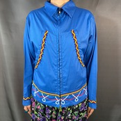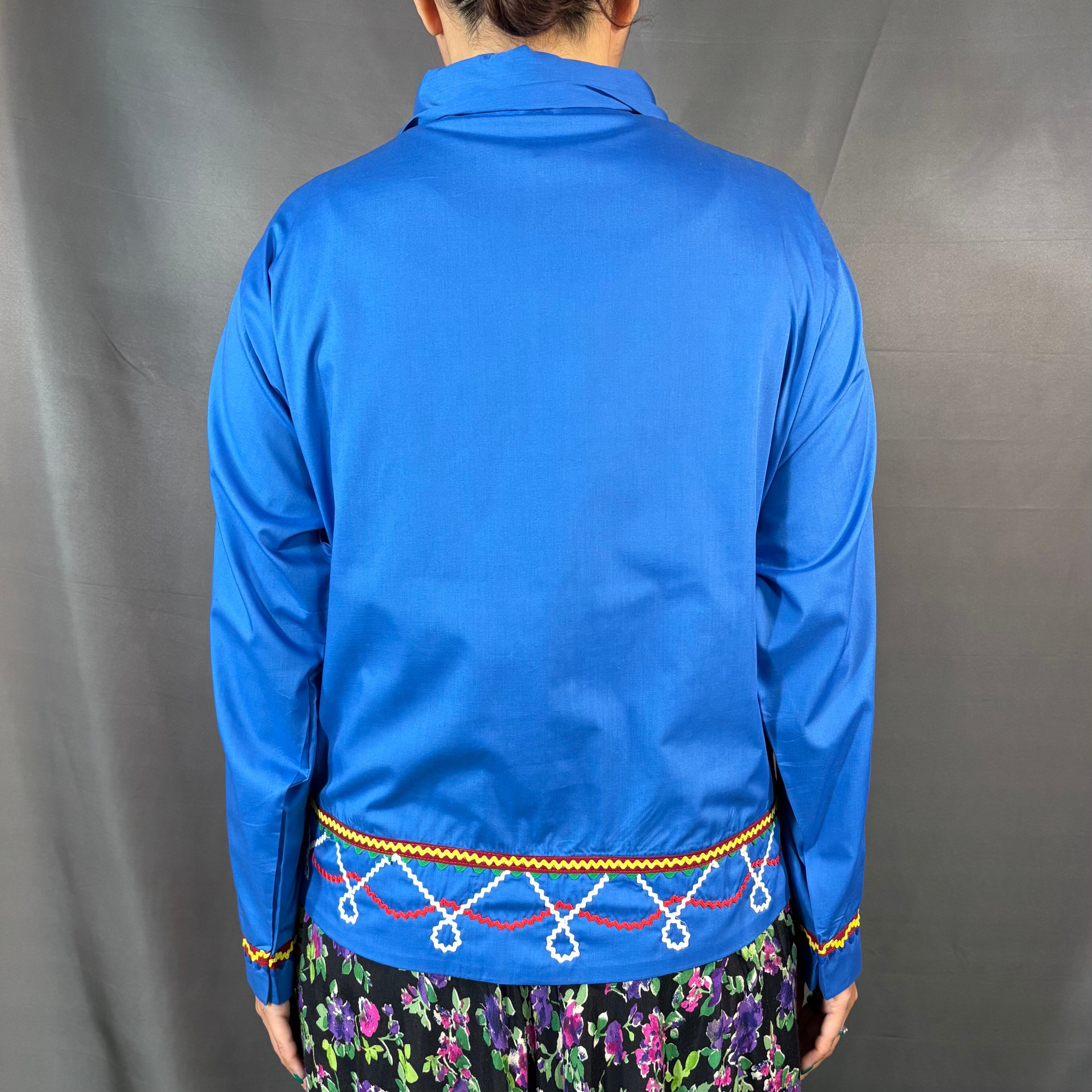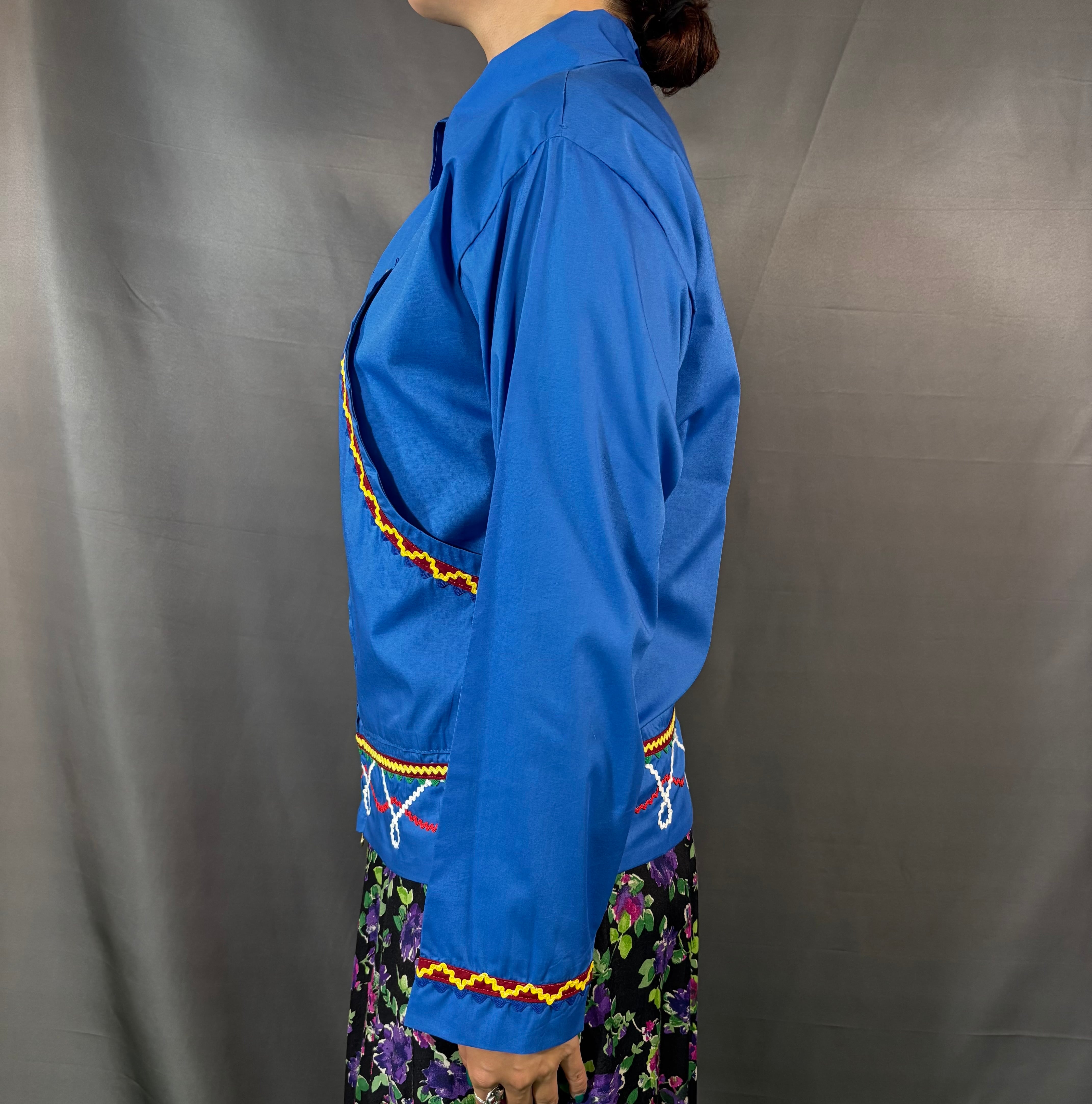 鮮やかなブルーのボディに、袖口や裾、ポケット口にカラフルな装飾テープをあしらったネイティブ調のデザインジャケットです。