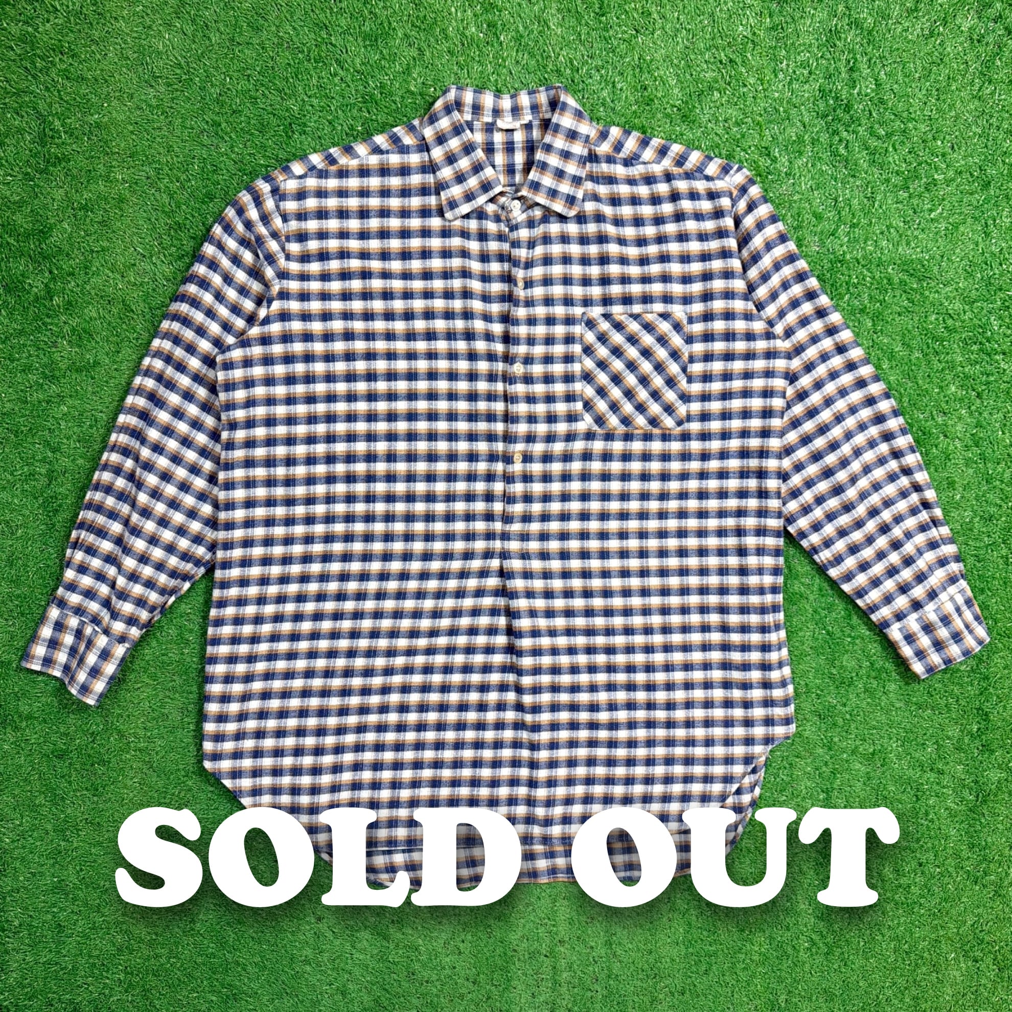 チェック柄のクラシカルな雰囲気に、プルオーバー仕様のデザイン。ゆったりとした身幅とロング丈で、古着らしい存在感のあるアイテムです。前丈は太もも中間ほど、後ろ丈は膝上あたりのロング丈で、横から見たシルエットも印象的です。