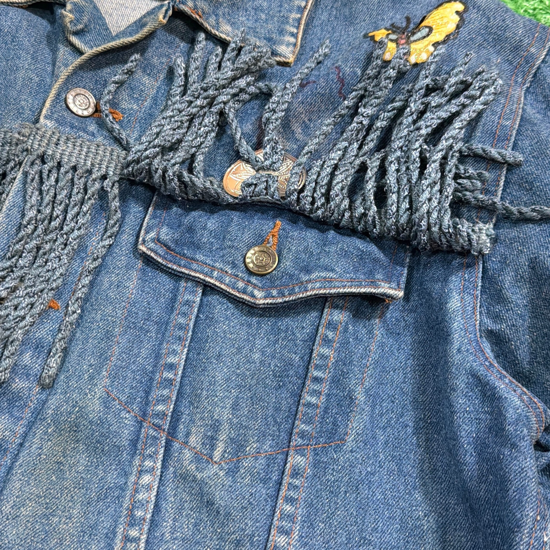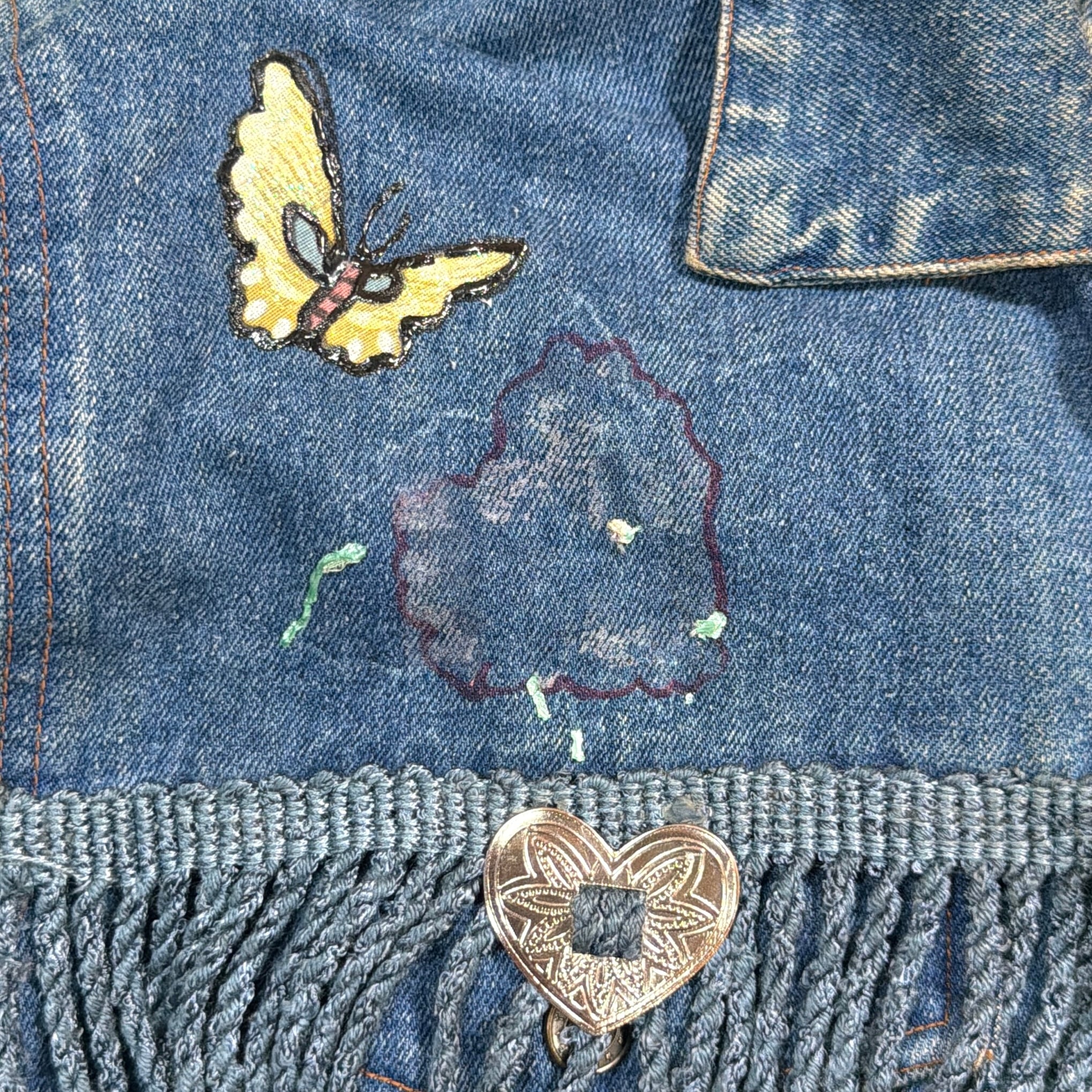胸元から背中にかけて大胆に施されたフリンジや、蝶の刺繍、ハート型のコンチョ風装飾がアクセントになった存在感抜群の1着。バックにもワッペンが配され、カントリーやヒッピーカルチャーを感じさせる雰囲気たっぷりのデザインです。ヴィンテージらしい色落ちも魅力的で、個性派のスタイルを楽しめます。