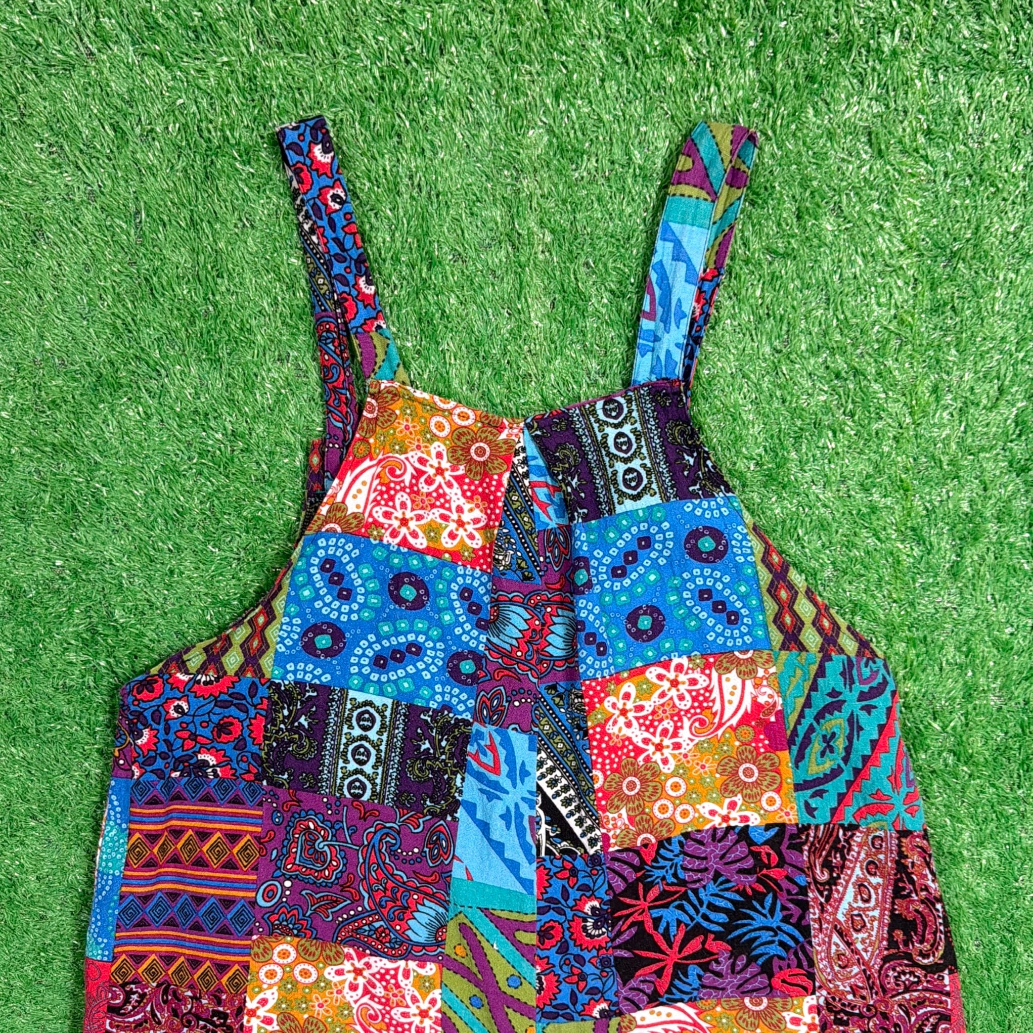 カラフルなパッチワーク風の総柄がインパクト抜群のサロペットです。