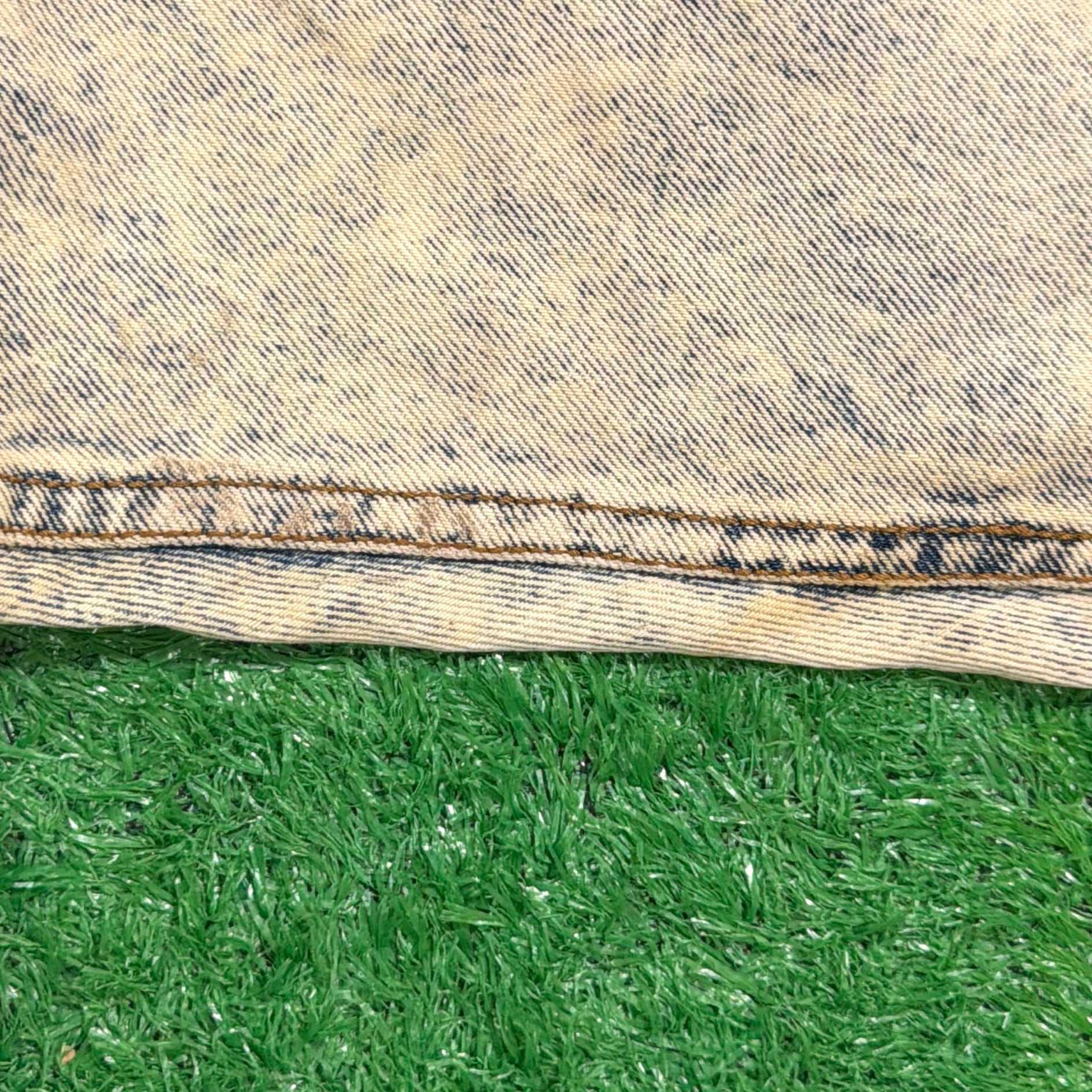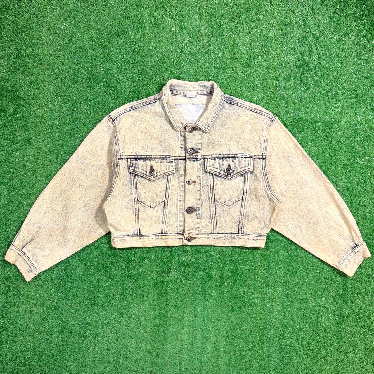 アシッドウォッシュ加工が施され、80sらしいインパクトのある仕上がり。ショート丈シルエットが特徴的で、ウエストラインを強調するスタイルやハイウエストボトムとも相性抜群です。