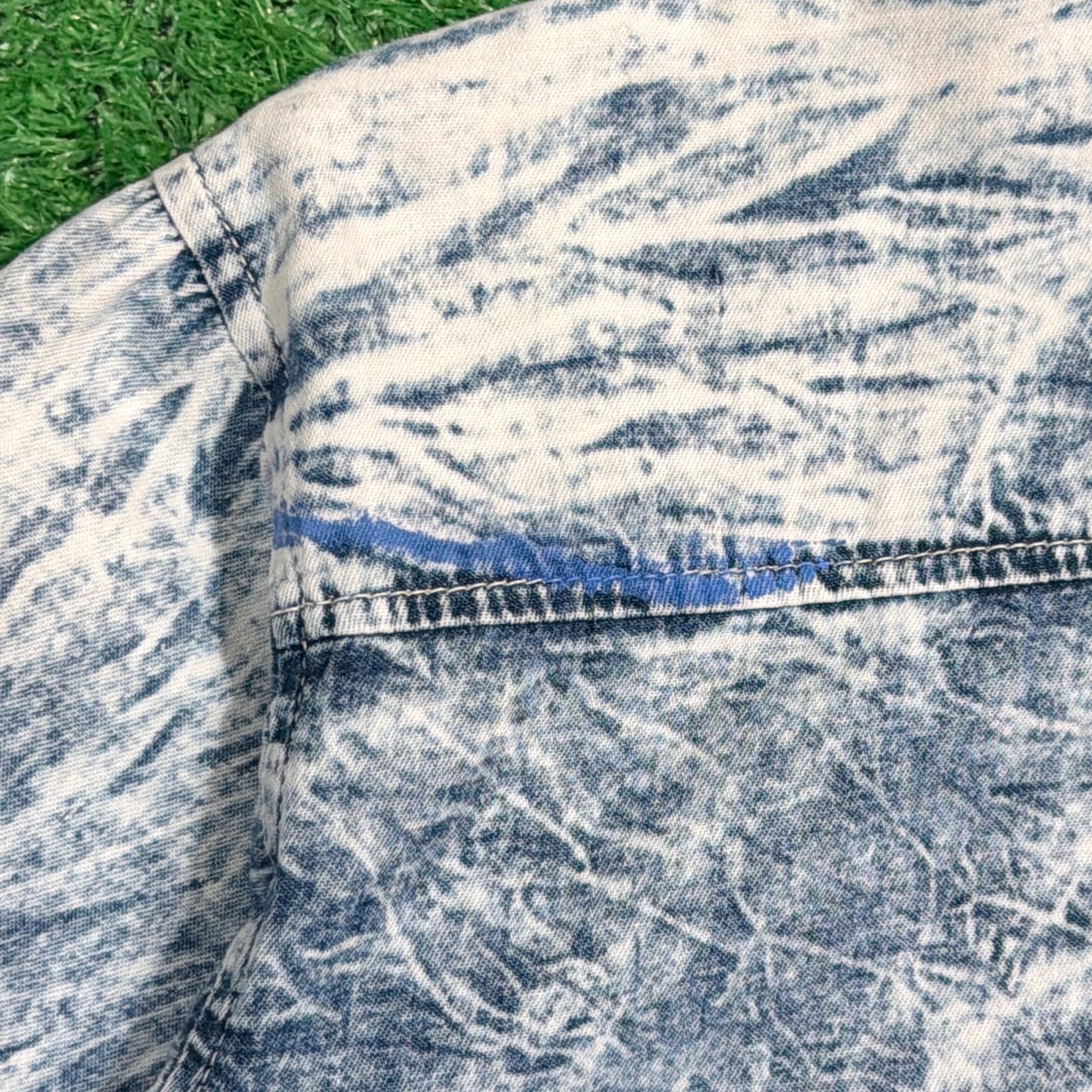 デニムではなく、軽やかなコットン素材で仕立てられており、柔らかい着心地が特徴。ライトブルーとホワイトのケミカルウォッシュ加工が独特の存在感を放ち、80sらしい雰囲気を楽しめる一枚です。