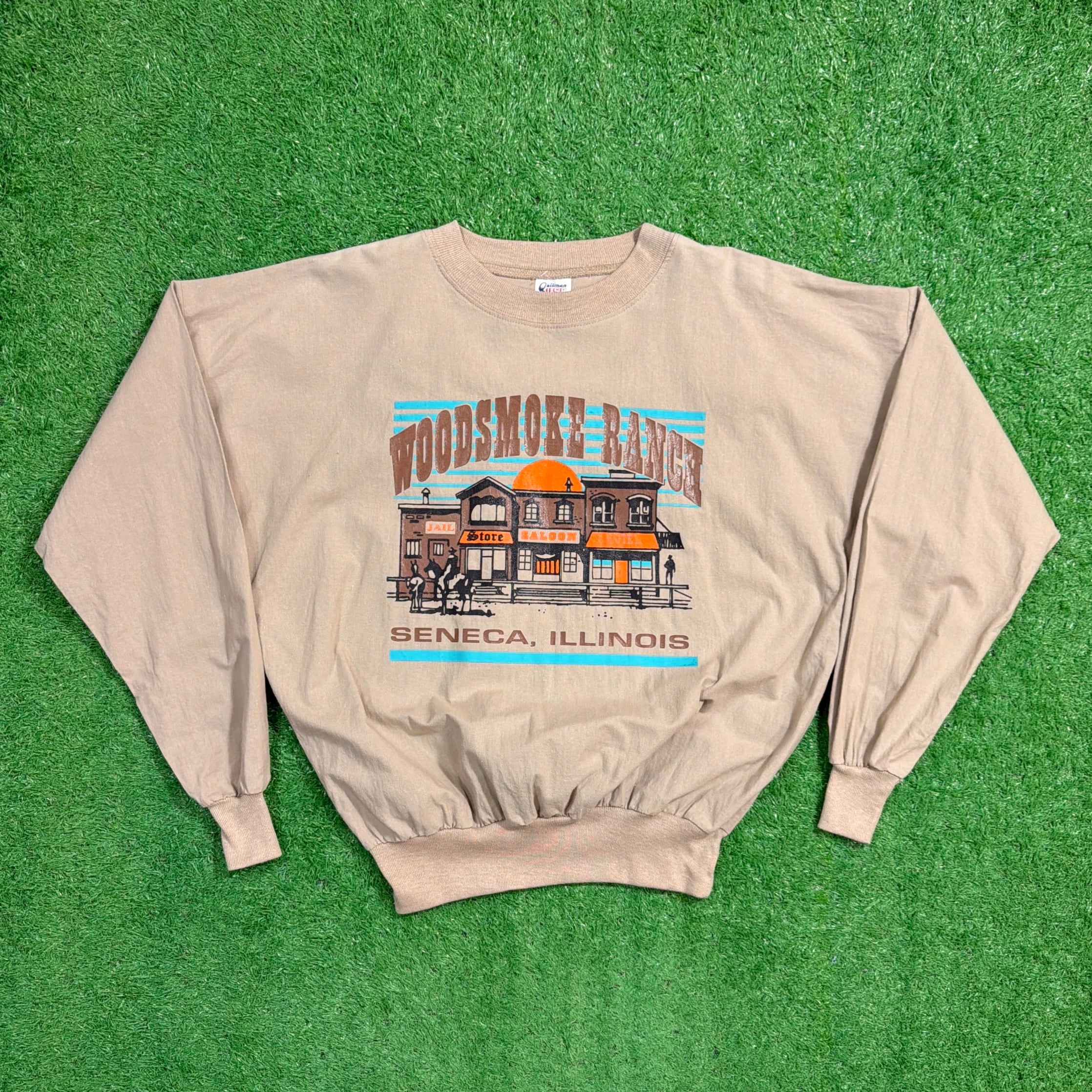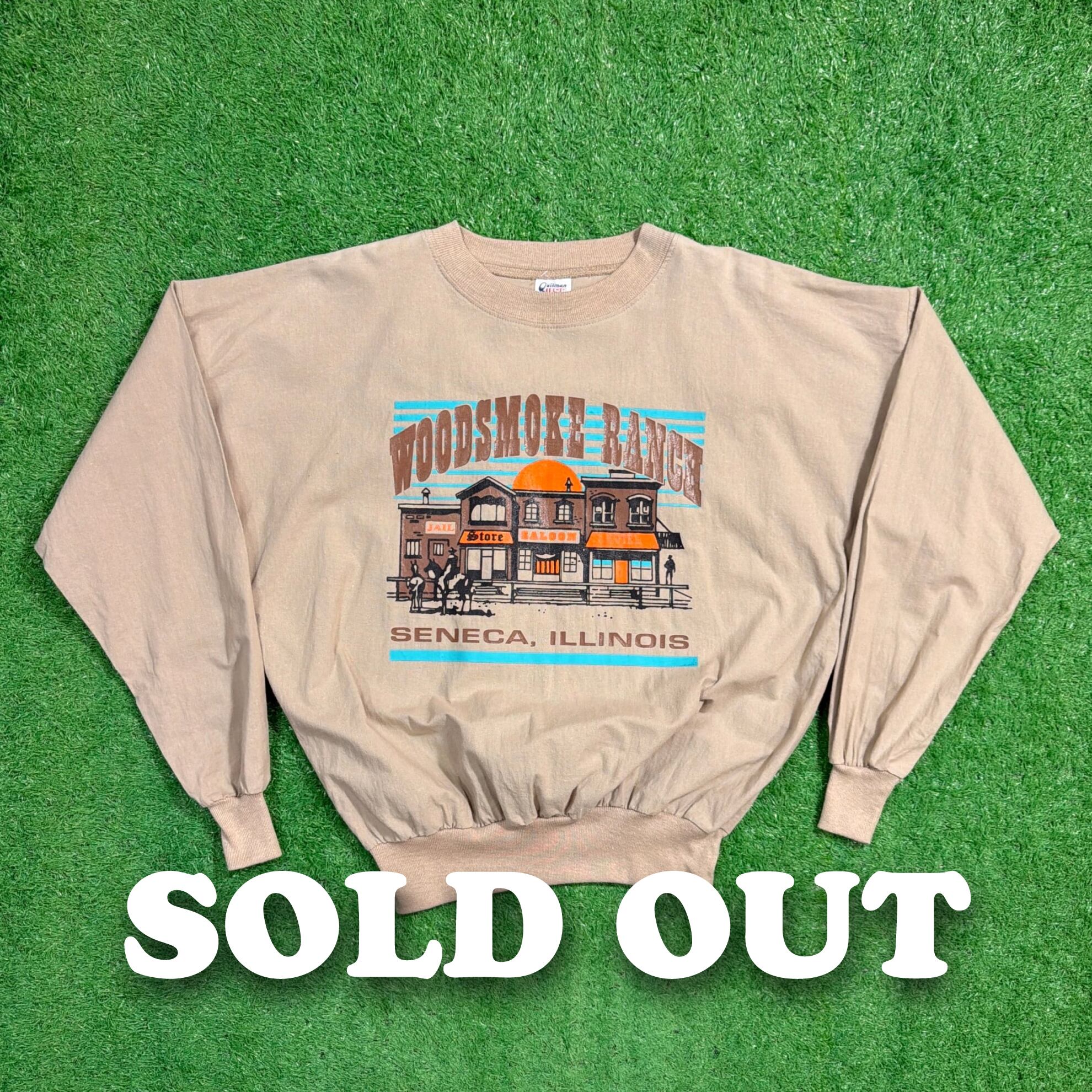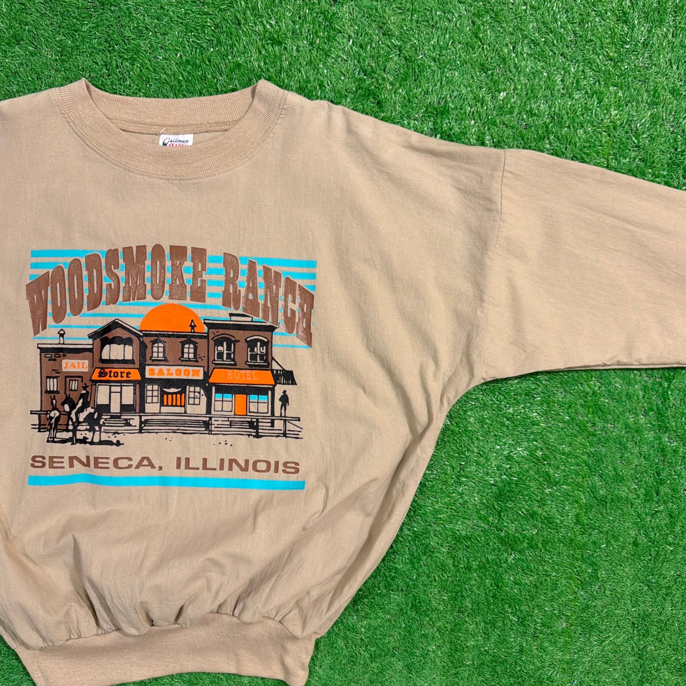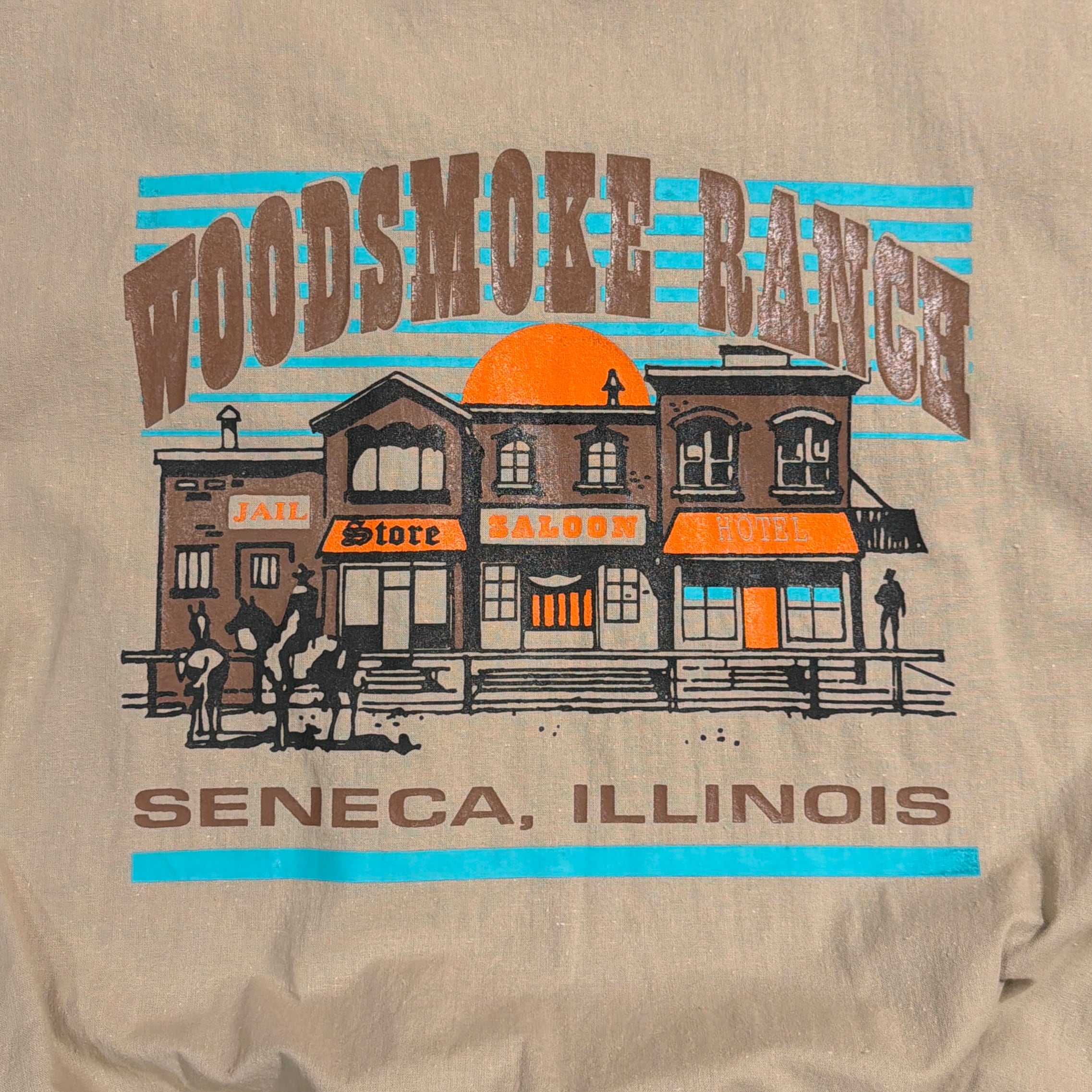 フロントには西部劇の街並みを思わせる建物と「WOODSMOKE RANCH」の文字が大きくプリントされており、ベージュのボディに鮮やかなオレンジとターコイズの色合いが映える一枚です。90sらしい存在感のあるグラフィックが魅力的。