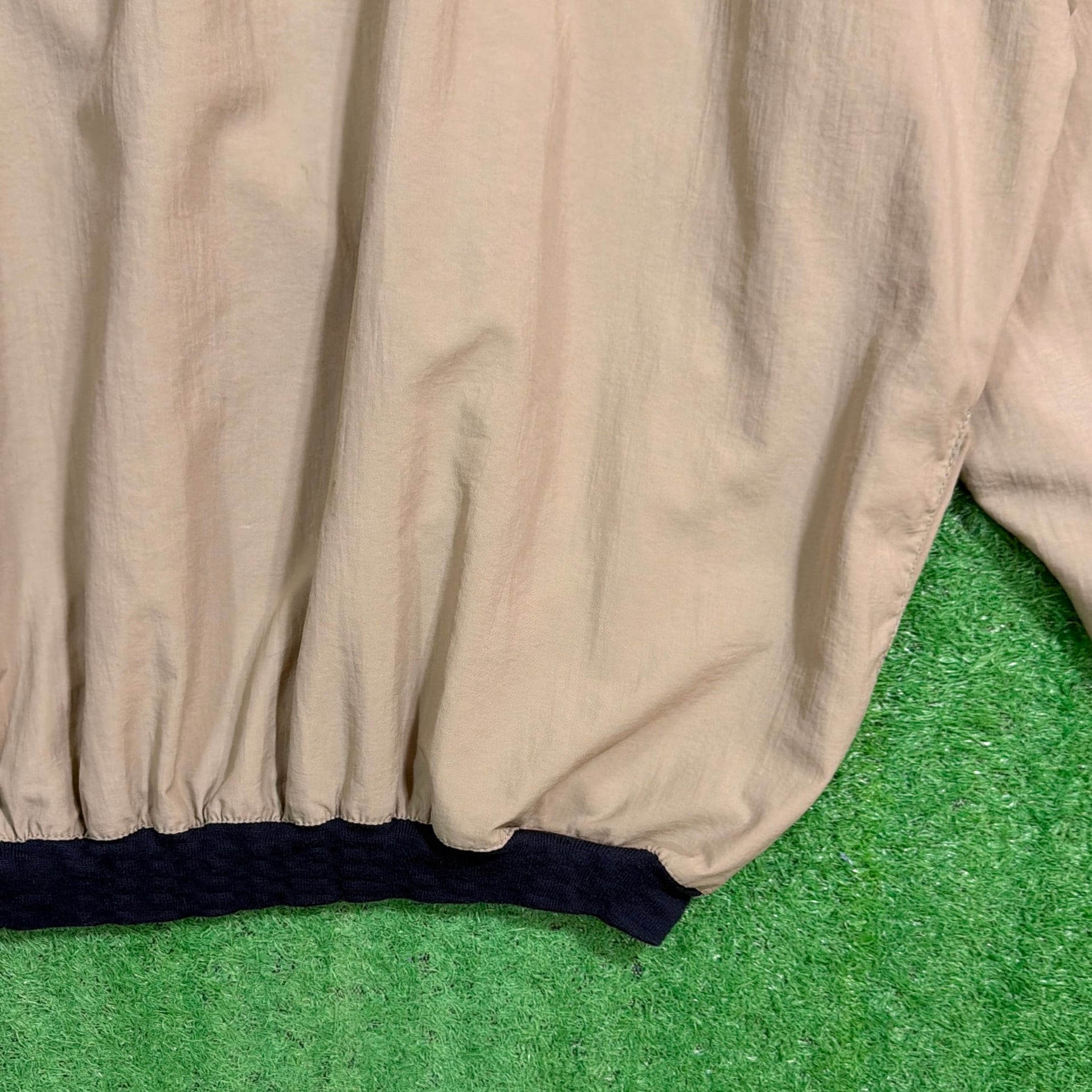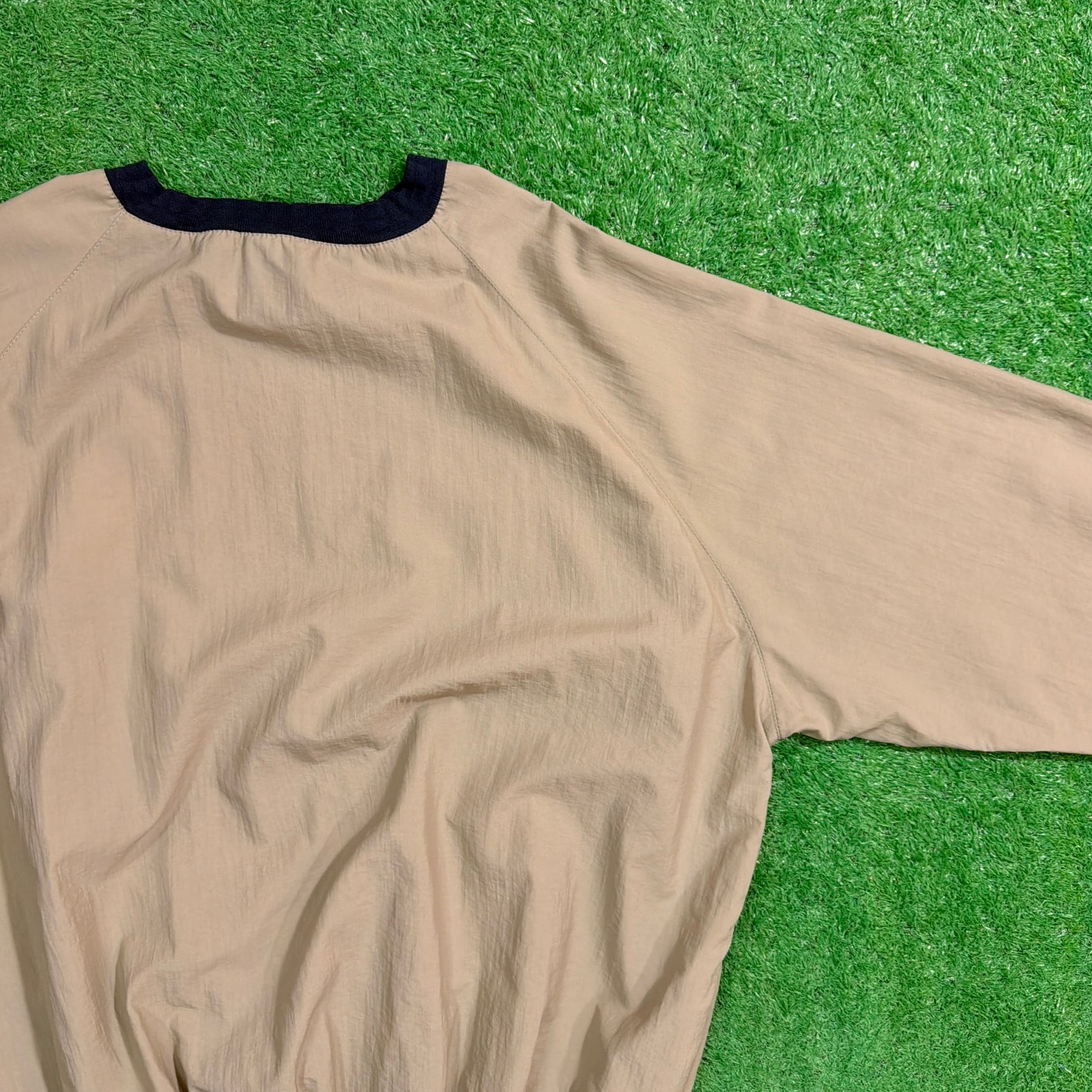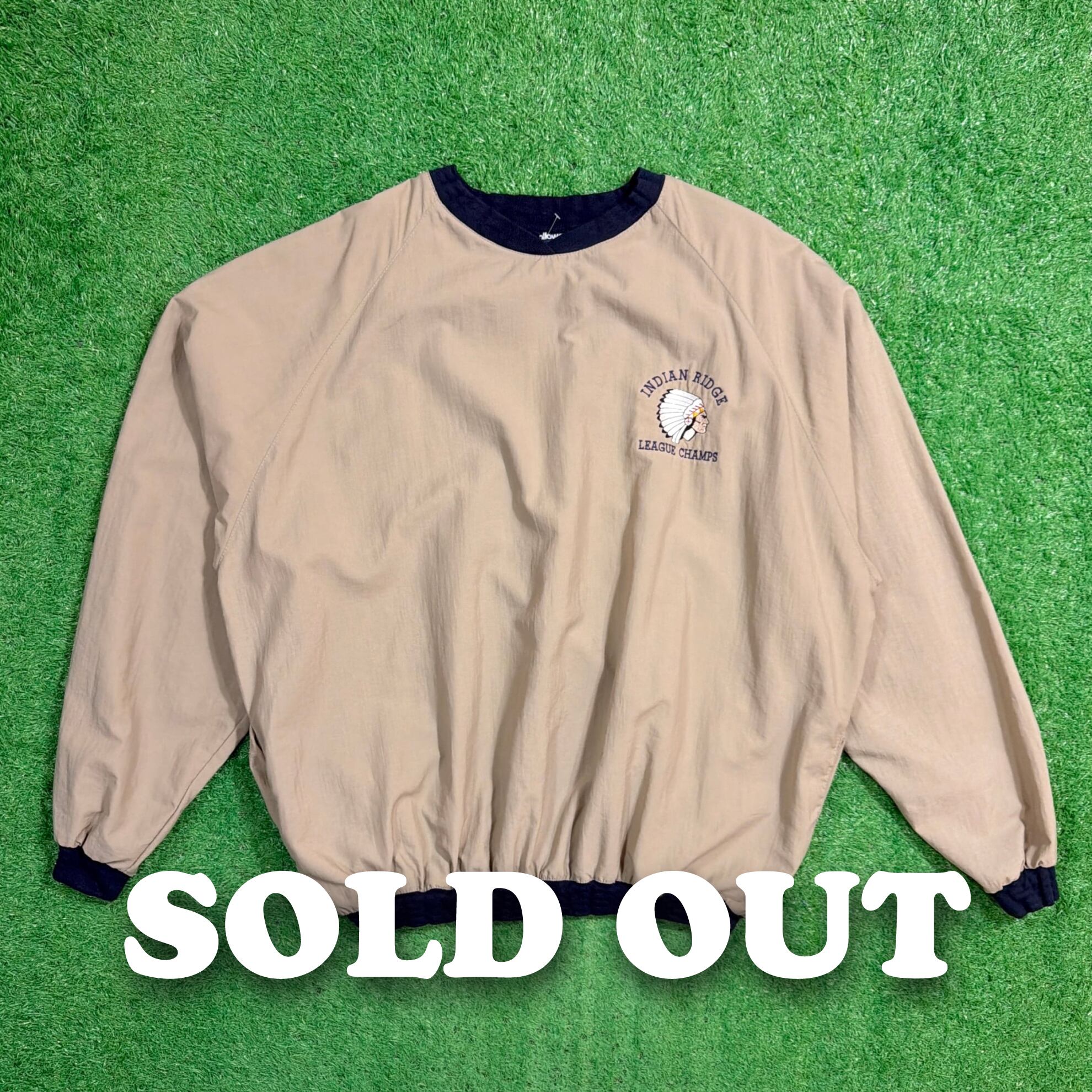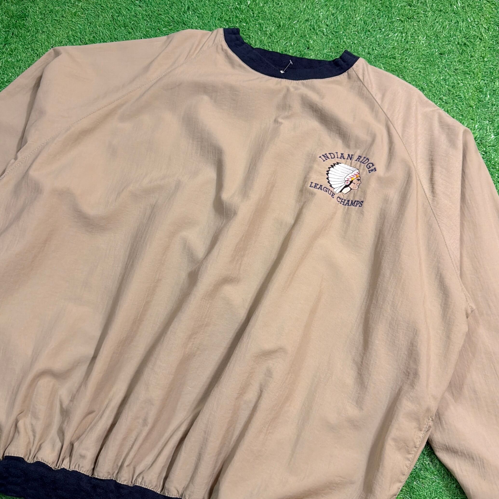 フロントには「INDIAN RIDGE LEAGUE CHAMPS」の刺繍と、ネイティブアメリカンをモチーフにしたデザインが施されています。ナイロン特有の軽量感とハリのある素材感で、さらりと羽織れる使い勝手の良い一枚。裾や袖口はリブ仕様で、程よく丸みのあるシルエットに仕上がっています。ベージュにネイビーカラーのリブがアクセントになり、90sらしい雰囲気を楽しめるアイテムです。