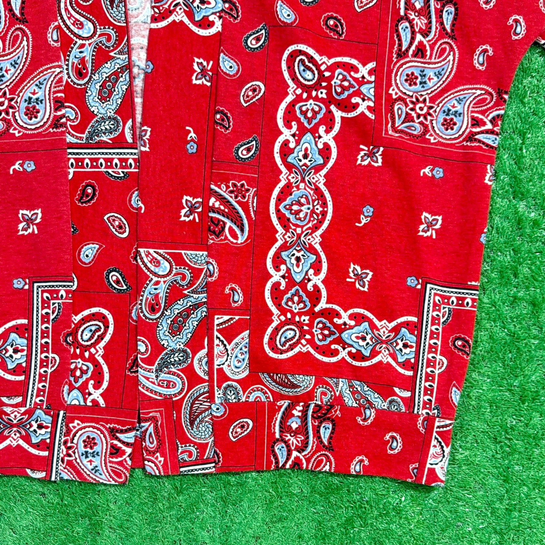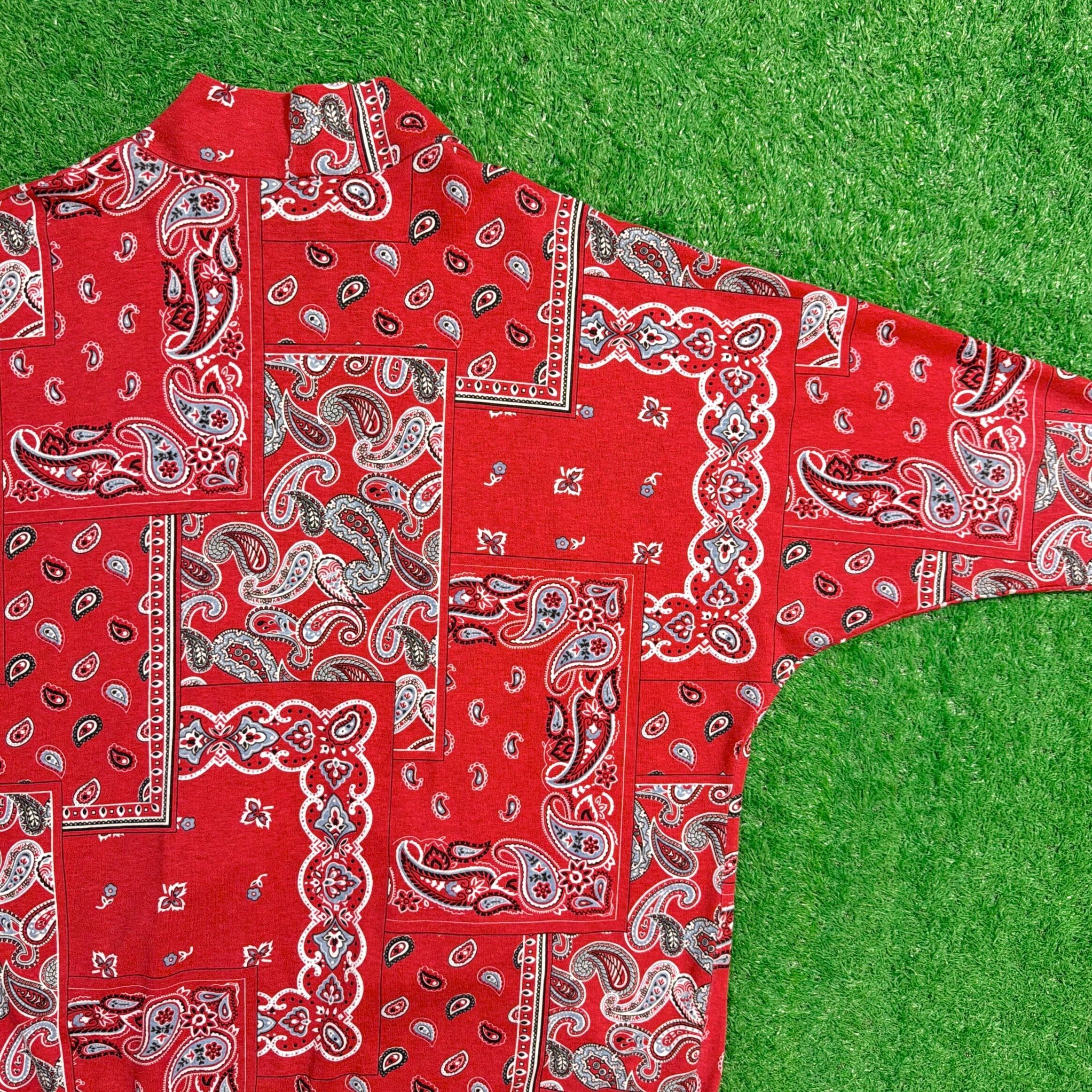 鮮やかなレッドのバンダナ柄が存在感抜群。素材は柔らかく、スウェットとTシャツの中間のような軽やかな生地感で、さらりと羽織れる一枚です。お尻がしっかり隠れるくらいのロング丈。ゆったりとしたシルエットが特徴的です。