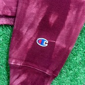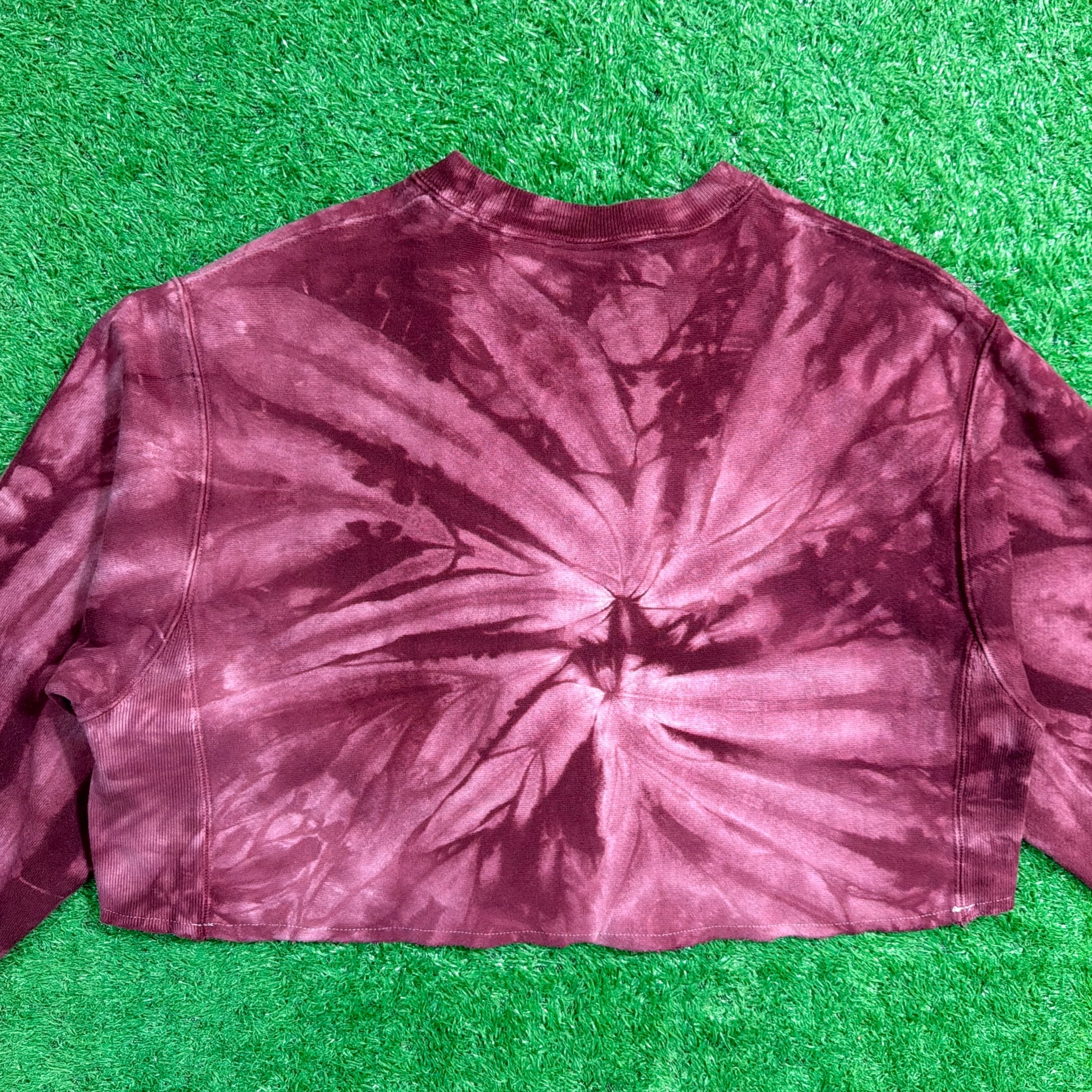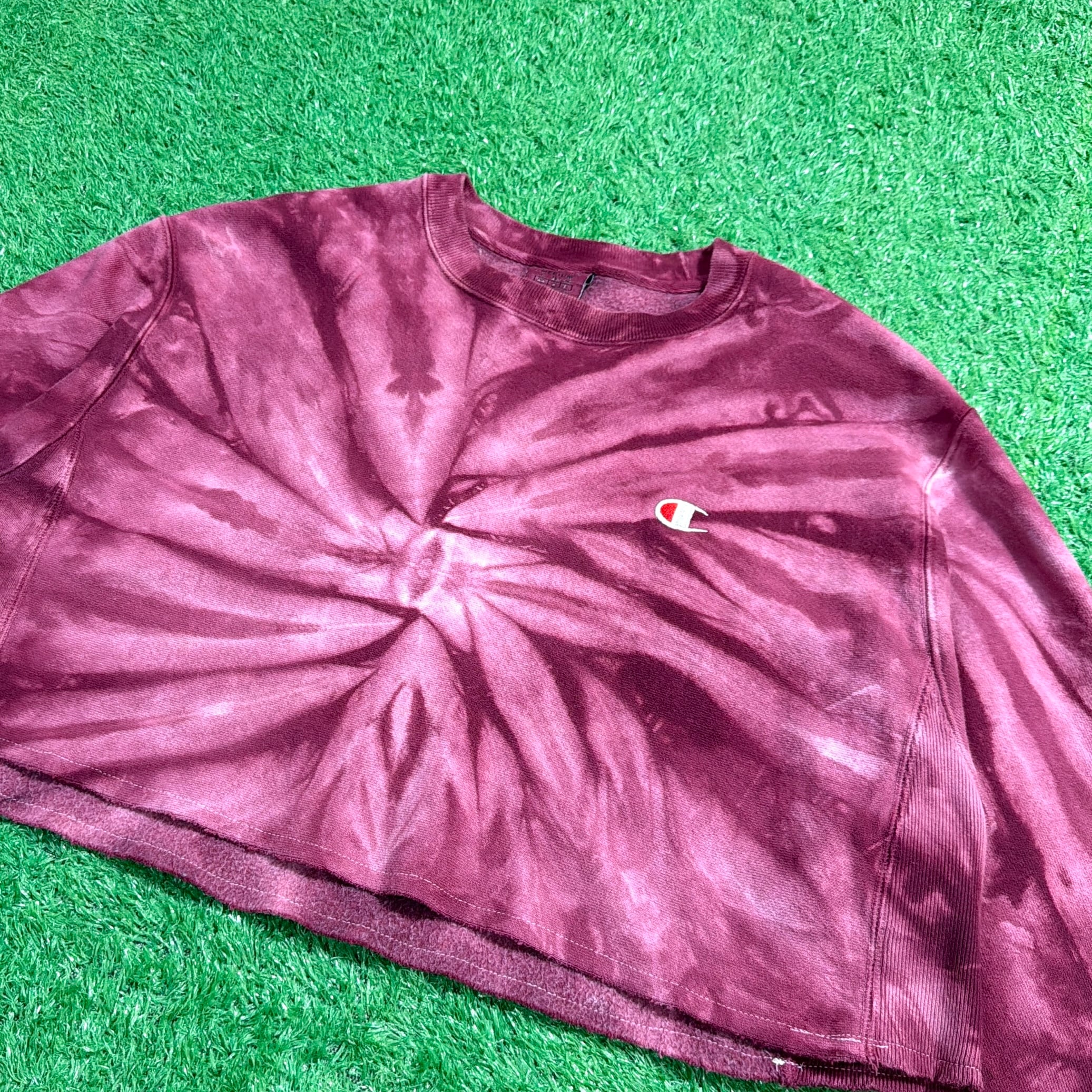 裾がカットオフされ、ショート丈にリメイクされた一点物。バーガンディカラーをベースにしたタイダイ染めが印象的で、胸元と袖口にはChampionロゴ刺繍入り。厚みのある生地感とリバースウィーブ特有のタフな作りが魅力です。