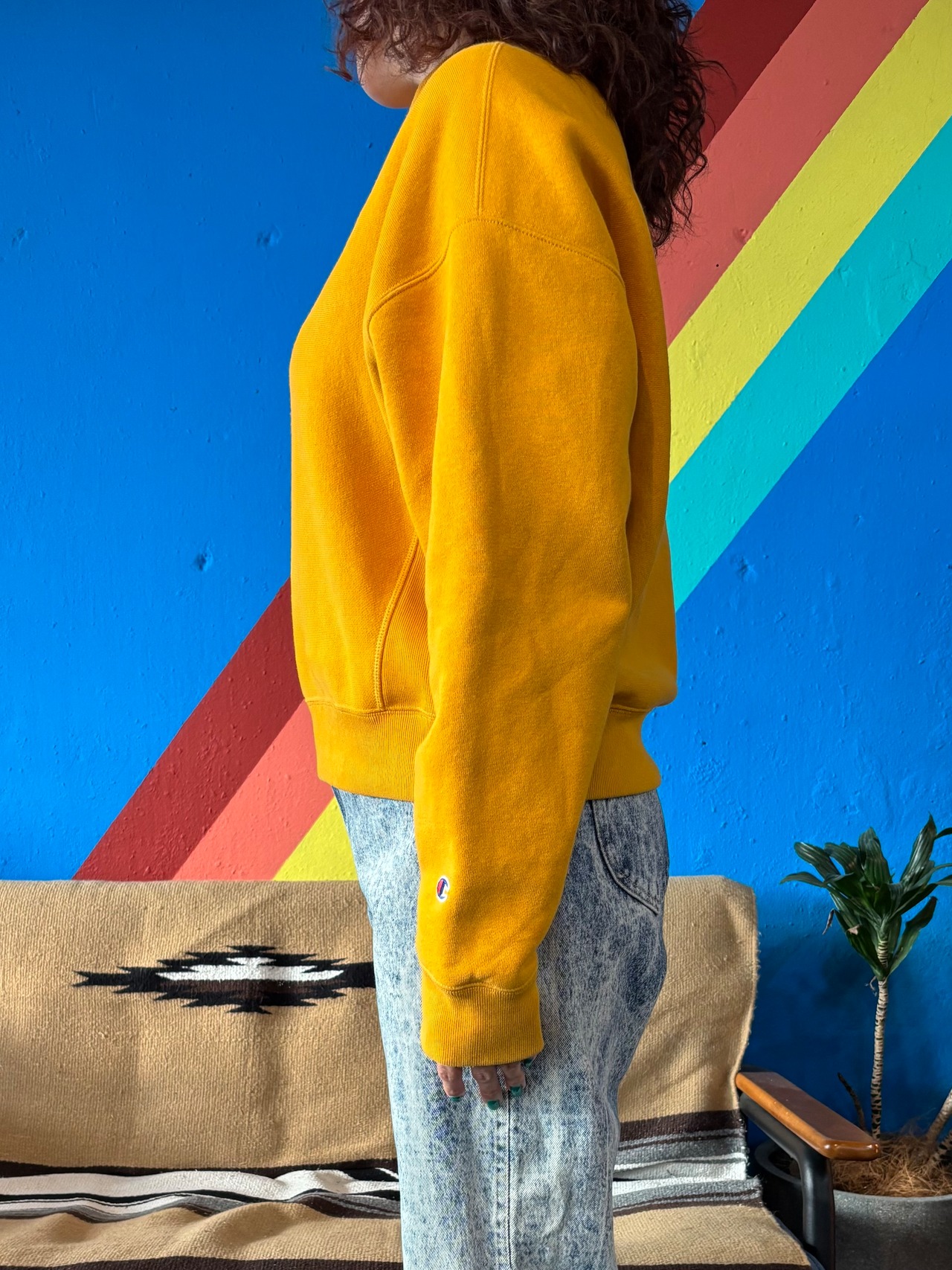発色の良いマスタードイエローがコーディネートのアクセントになり、胸元と袖口には定番のCロゴ刺繍入り。リバースウィーブ特有のしっかりとした生地感で、型崩れしにくいのも魅力。ショート丈デザインで、すっきりとしたバランスで着られるアイテムです。