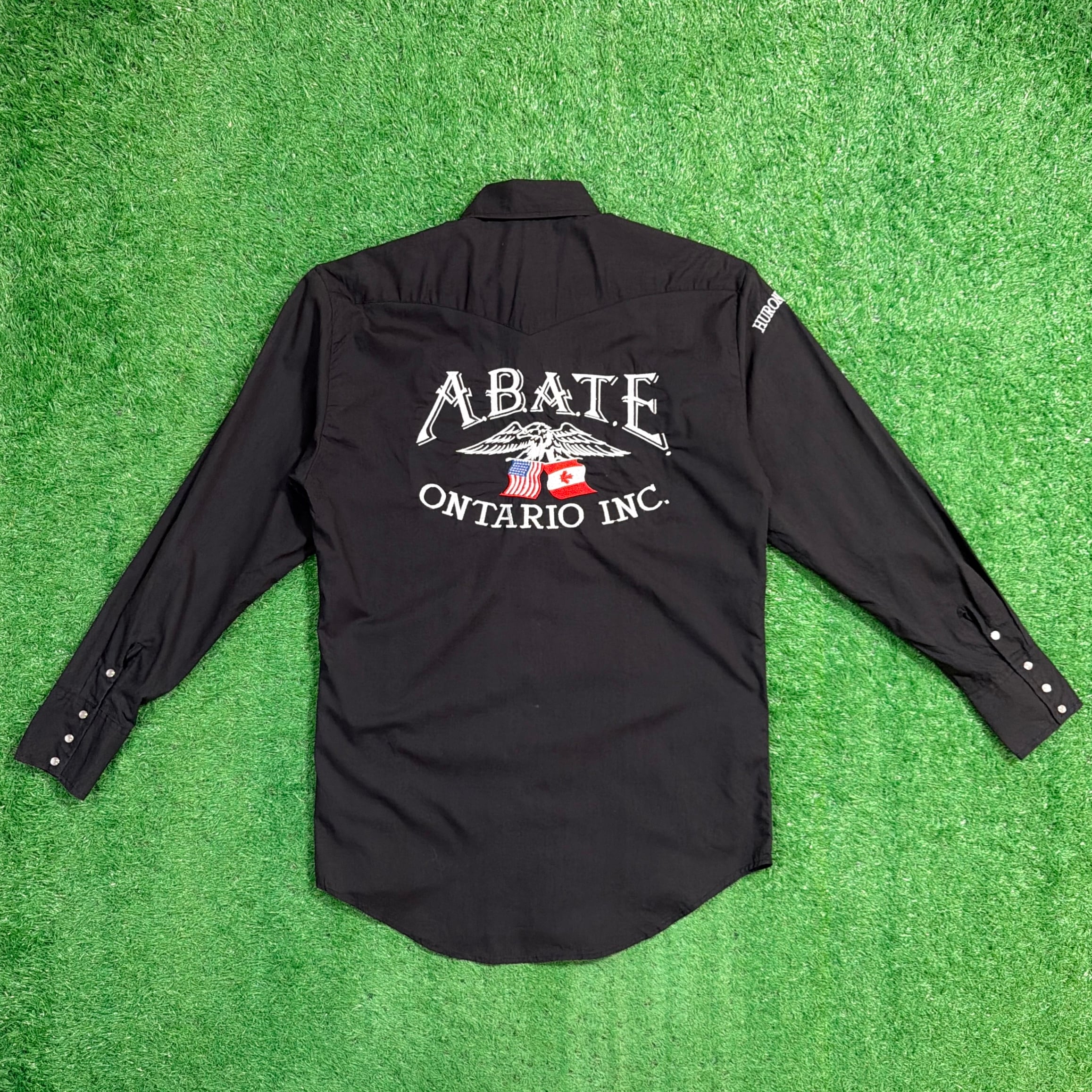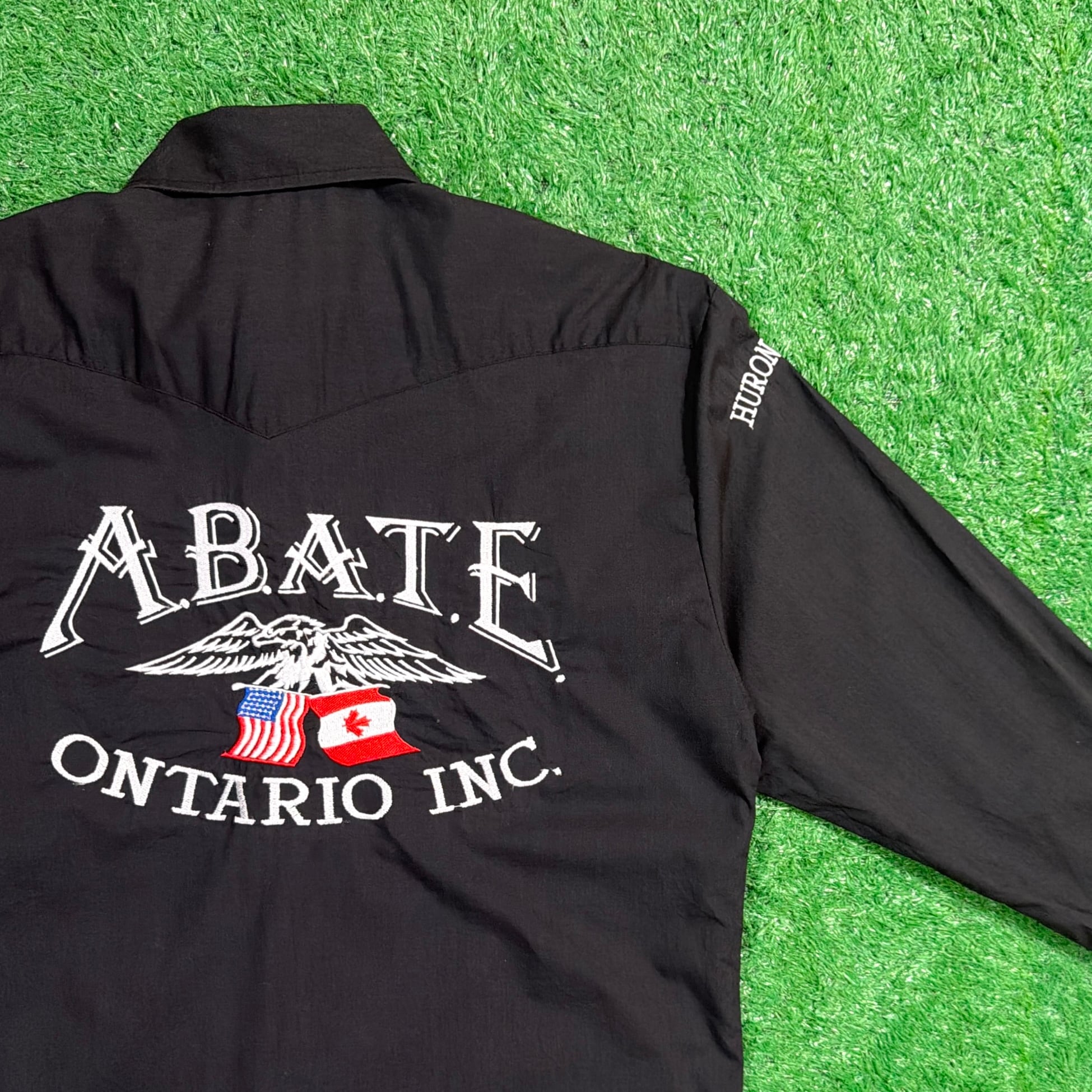 胸元と背面に「ABATE ONTARIO INC.」の刺繍が入ったデザインで、アメリカのモーターサイクル団体「ABATE(A Brotherhood Aimed Toward Education)」。ABATEはアメリカ全土に支部を持つバイカー団体です。ブラックカラーにホワイトとレッドの刺繍が映える、存在感あるデザイン。スナップボタン仕様でウエスタンテイストも感じられる一枚です。