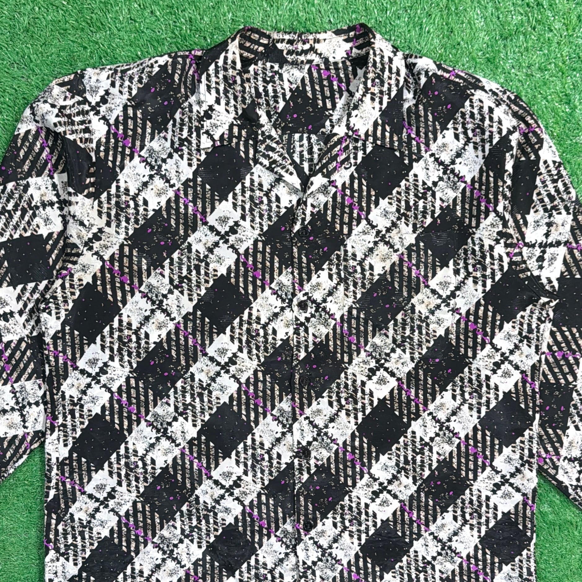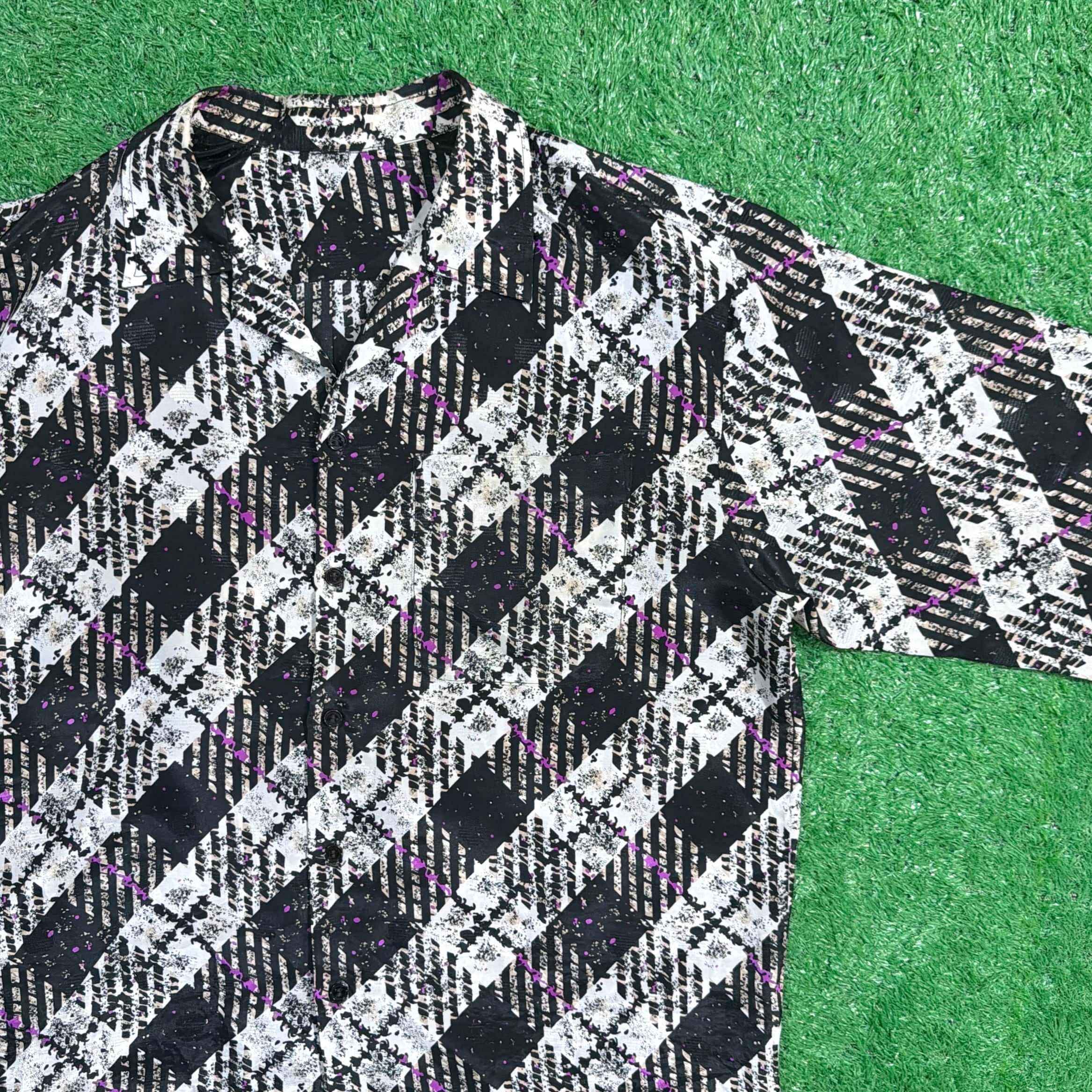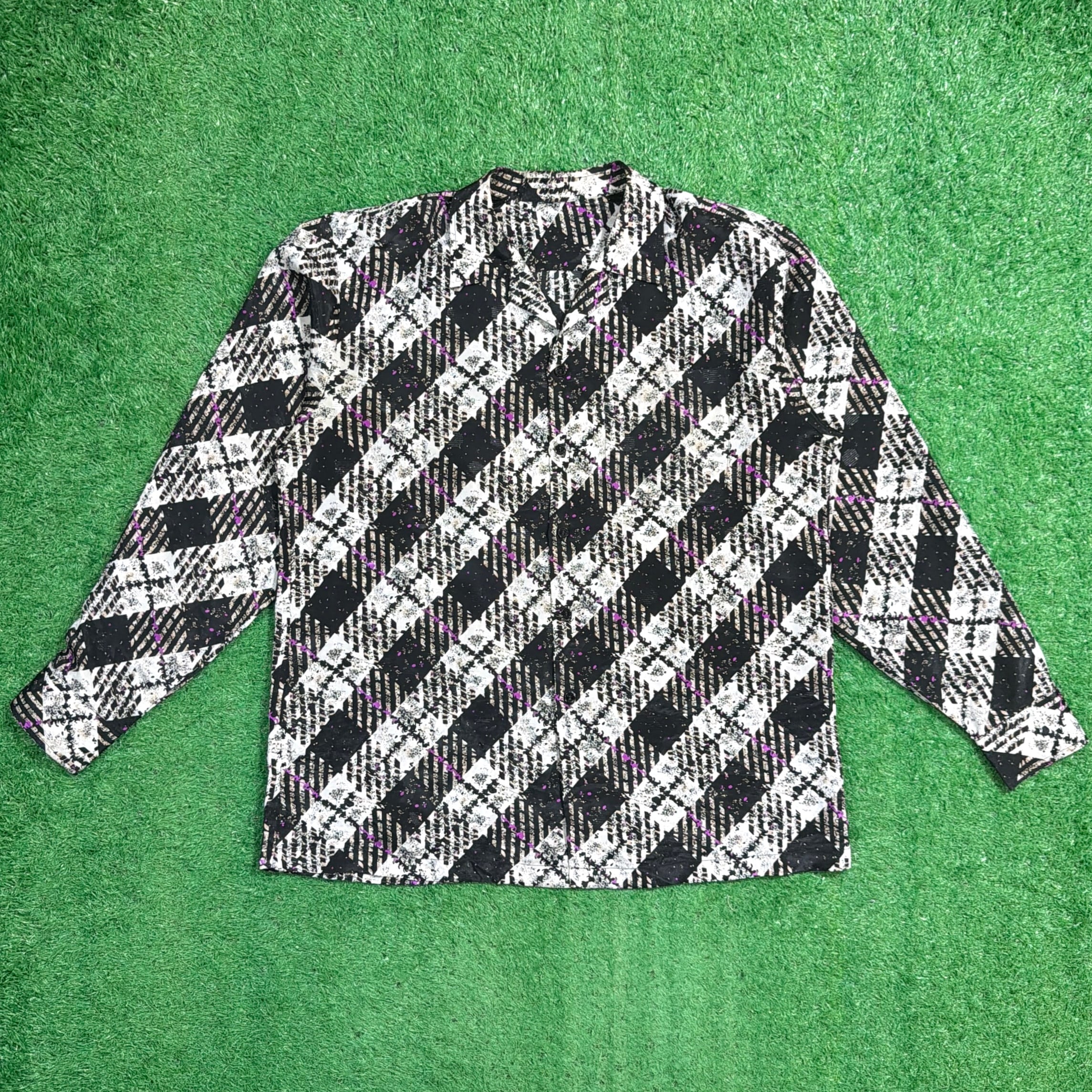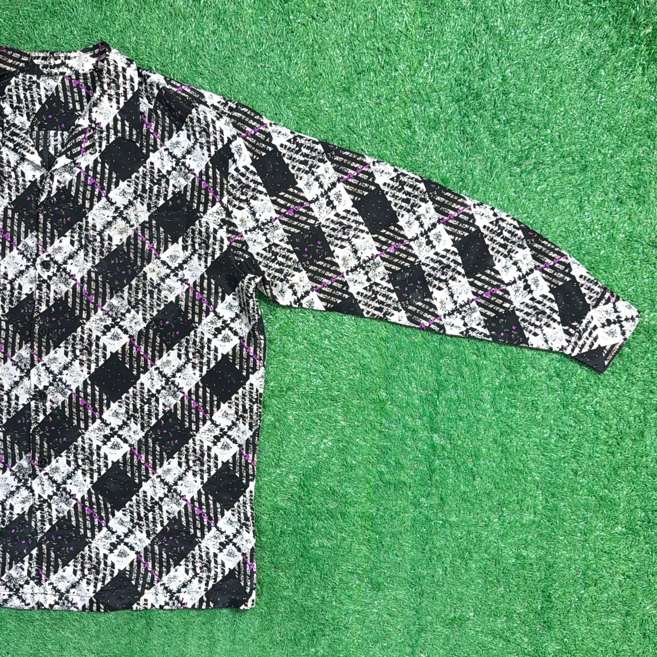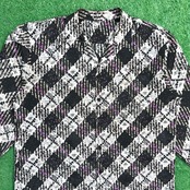 斜めに配されたチェック柄に、ほんのり入ったパープルのラインがアクセントになっています。オープンカラー仕様で抜け感があり、90年代のレトロムード漂う一枚です。