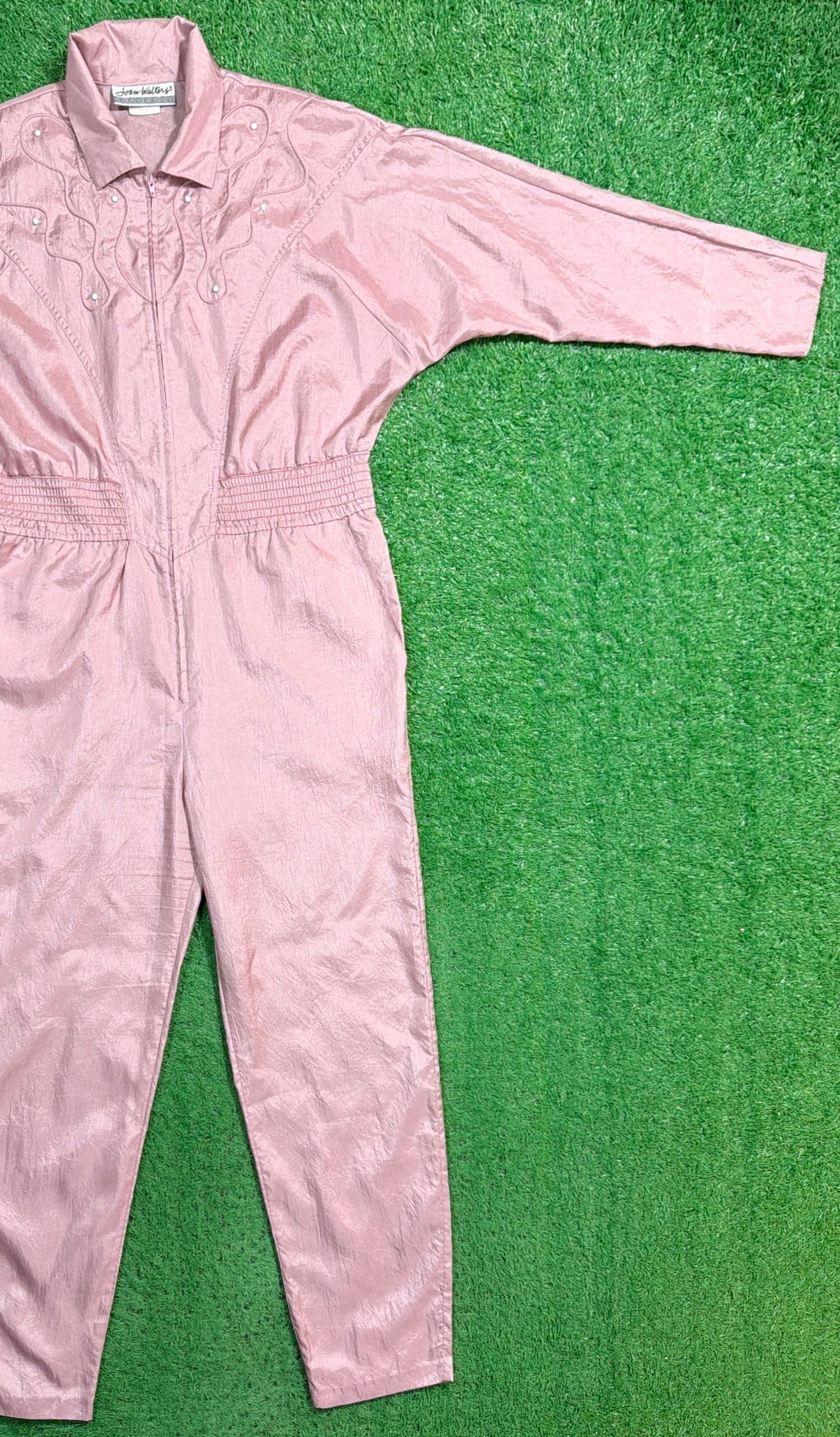 【Lady's】 90s シャイニー 刺繍デザイン オールインワン / アメリカ製 USA製 90年代 古着 つなぎ レディース ピンク 959
