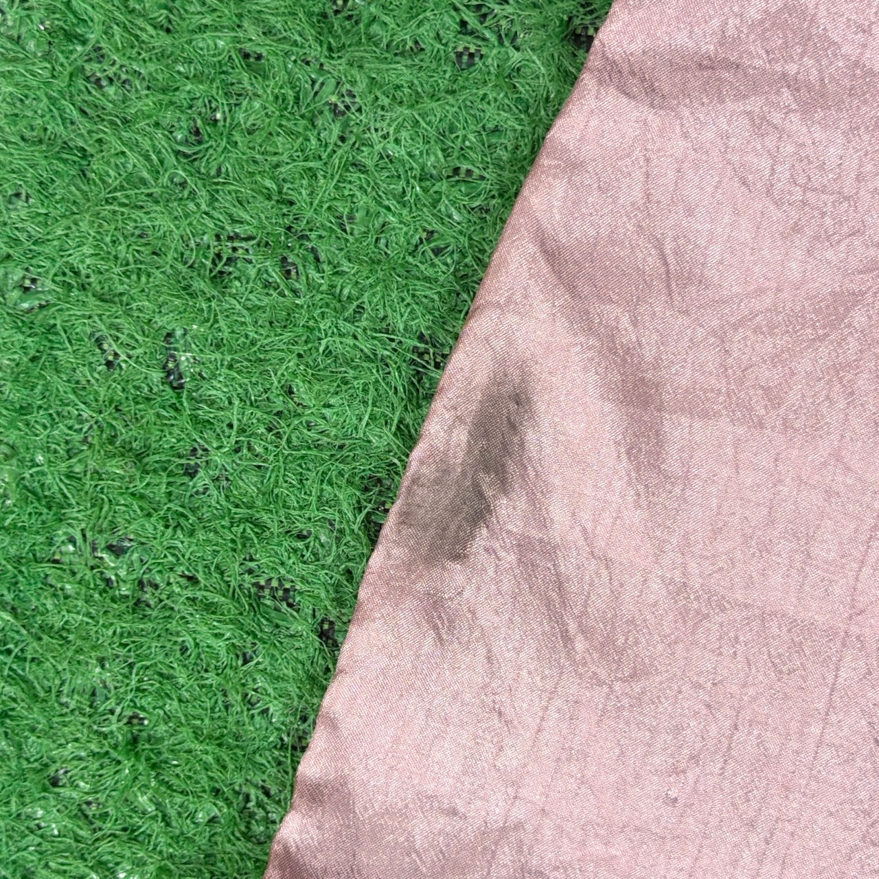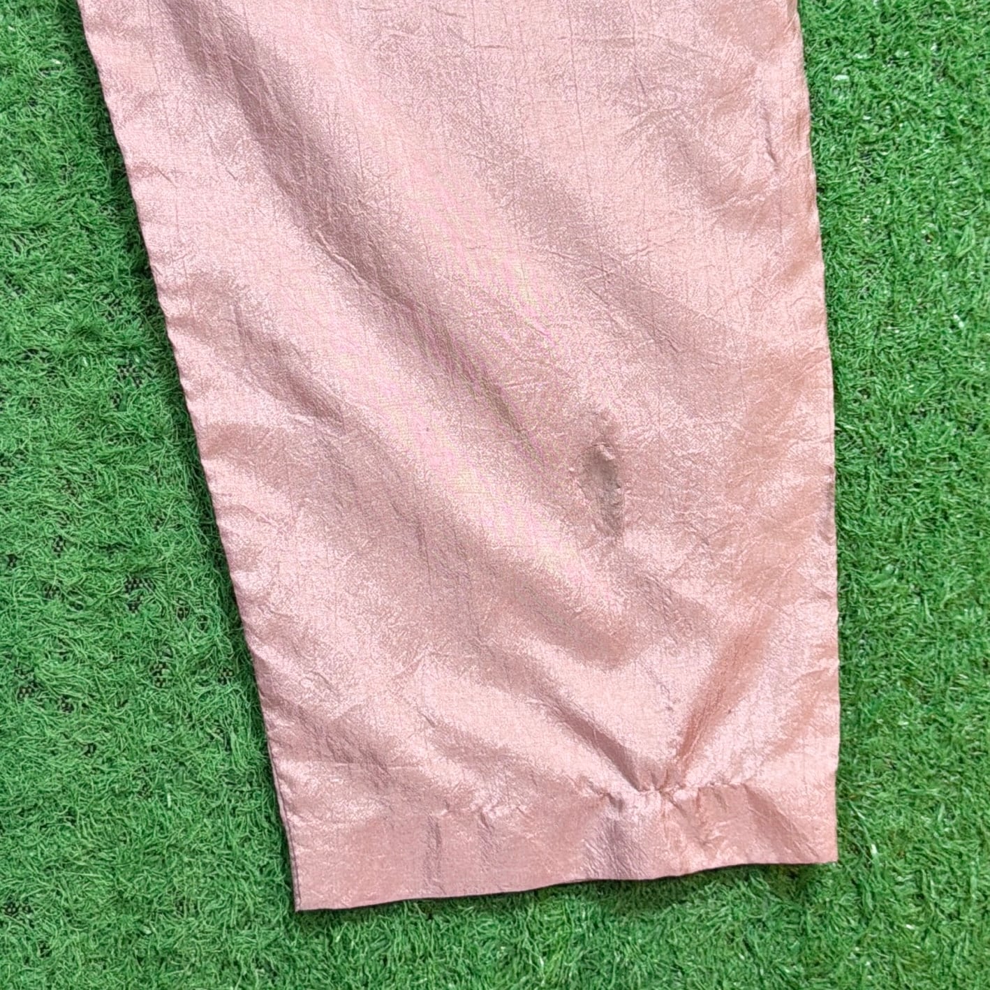 柔らかで光沢感のある“シャカシャカした軽い素材感”が特徴で、動くたびにほのかに光を反射する上品な雰囲気。胸元には刺繍のデザインが施され、90sらしいフェミニンなテイストが感じられます。ウエストはゴム仕様で自然にシルエットが引き締まり、スタイルアップして見えるのもポイント。軽くて着心地も良く、シーズンを問わず活躍してくれます。