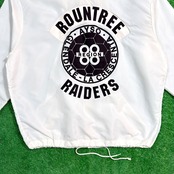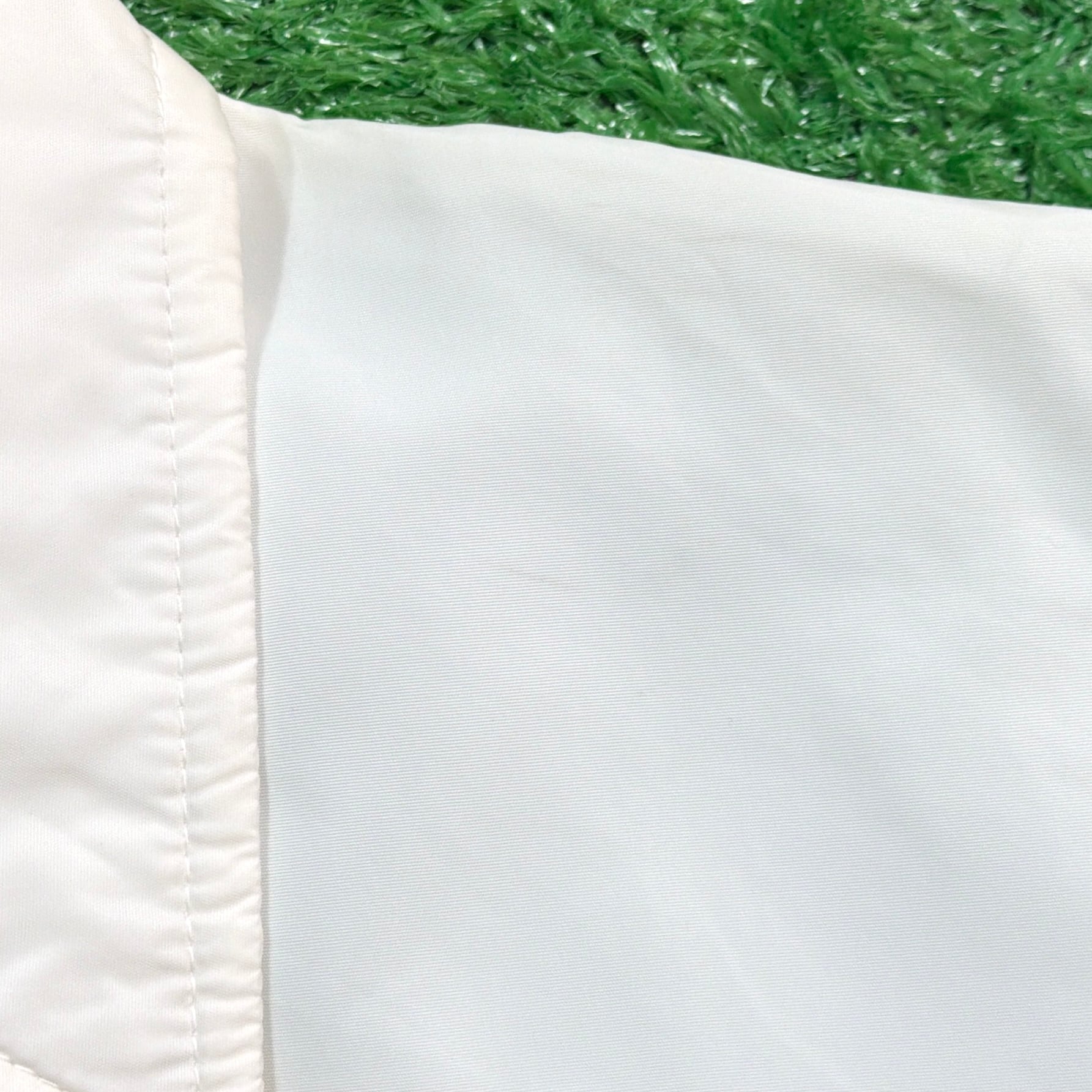 ボディは裏地のない薄手のナイロン素材で、軽く羽織れるライトアウタータイプ。ホワイトベースにブラックのロゴデザインが映える、爽やかでスポーティーな印象の1枚です。