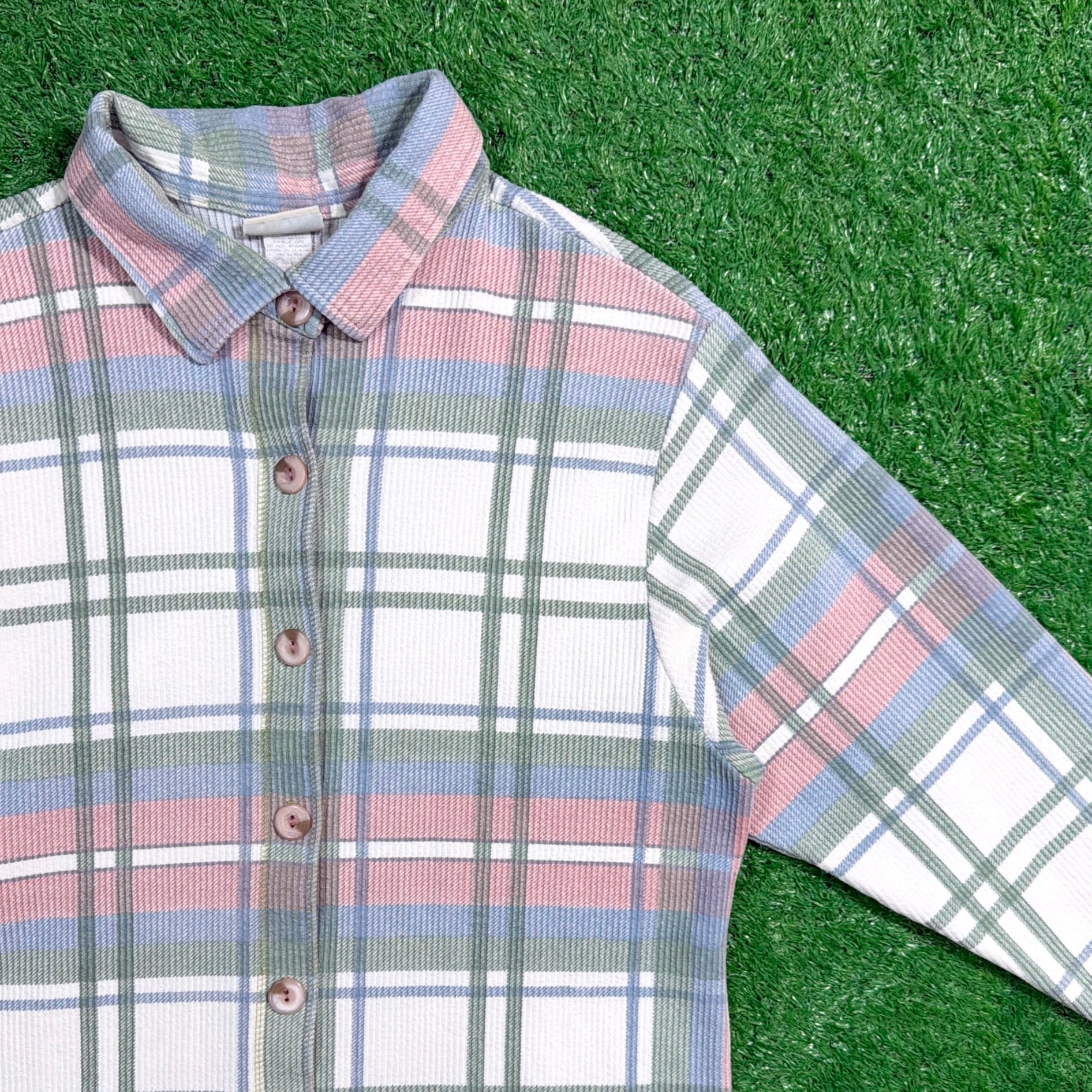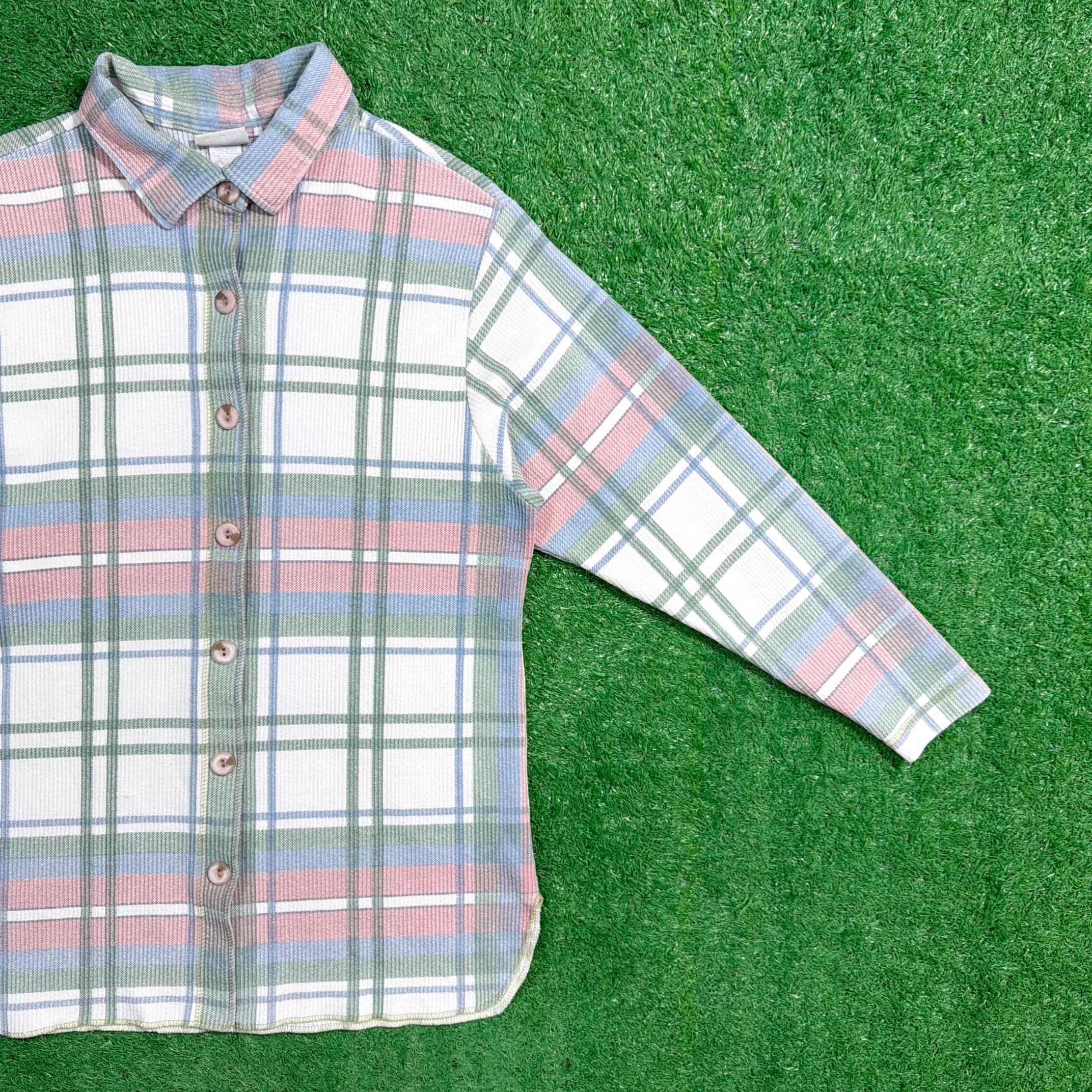 ピンクやブルーを基調としたパステル調のカラーリングがやさしい印象で、古着らしい雰囲気もありつつ春秋シーズンにぴったりの1枚。カットソーのような伸縮性のあるリブ編み生地で、シャツでありながらも着心地は軽くリラックス感があります。