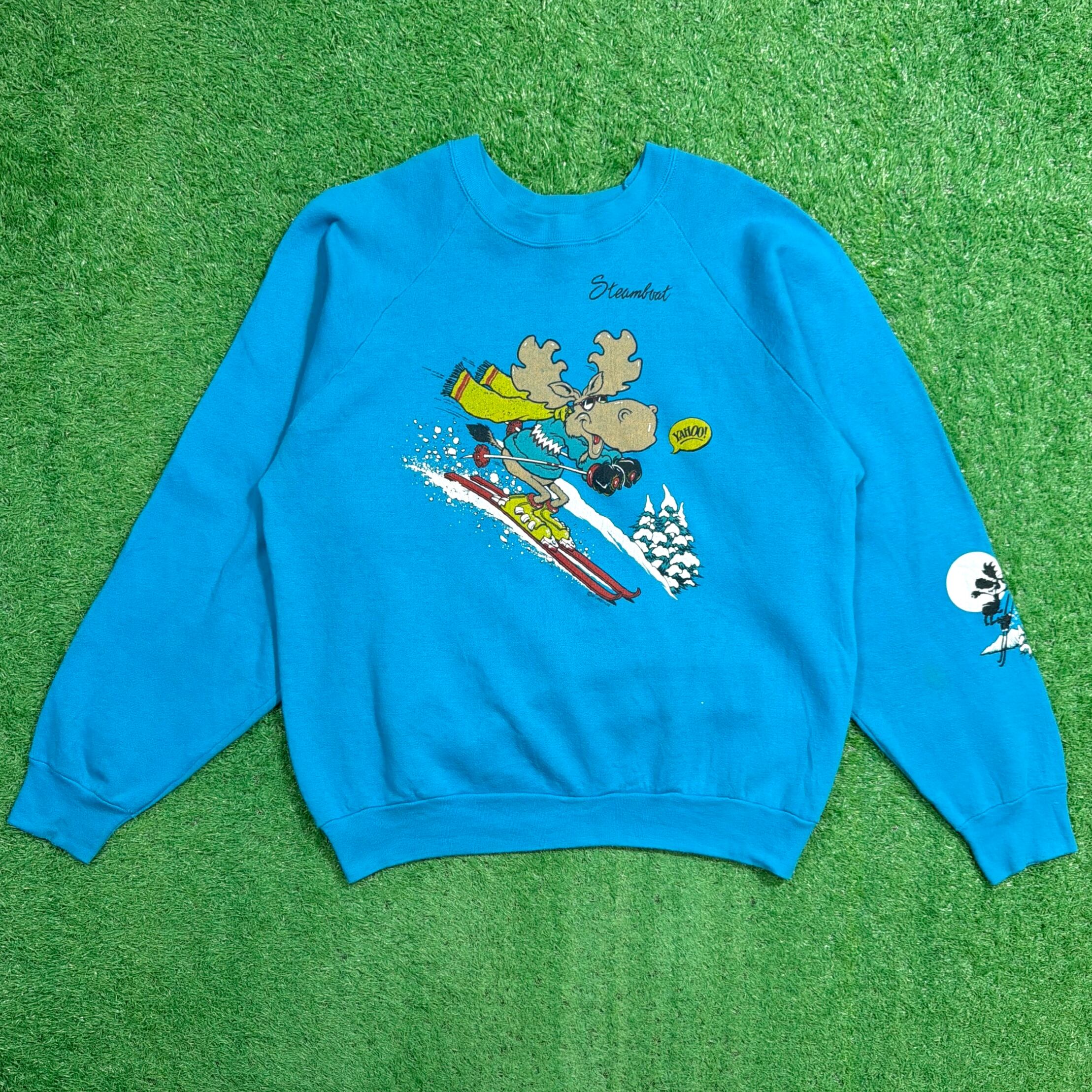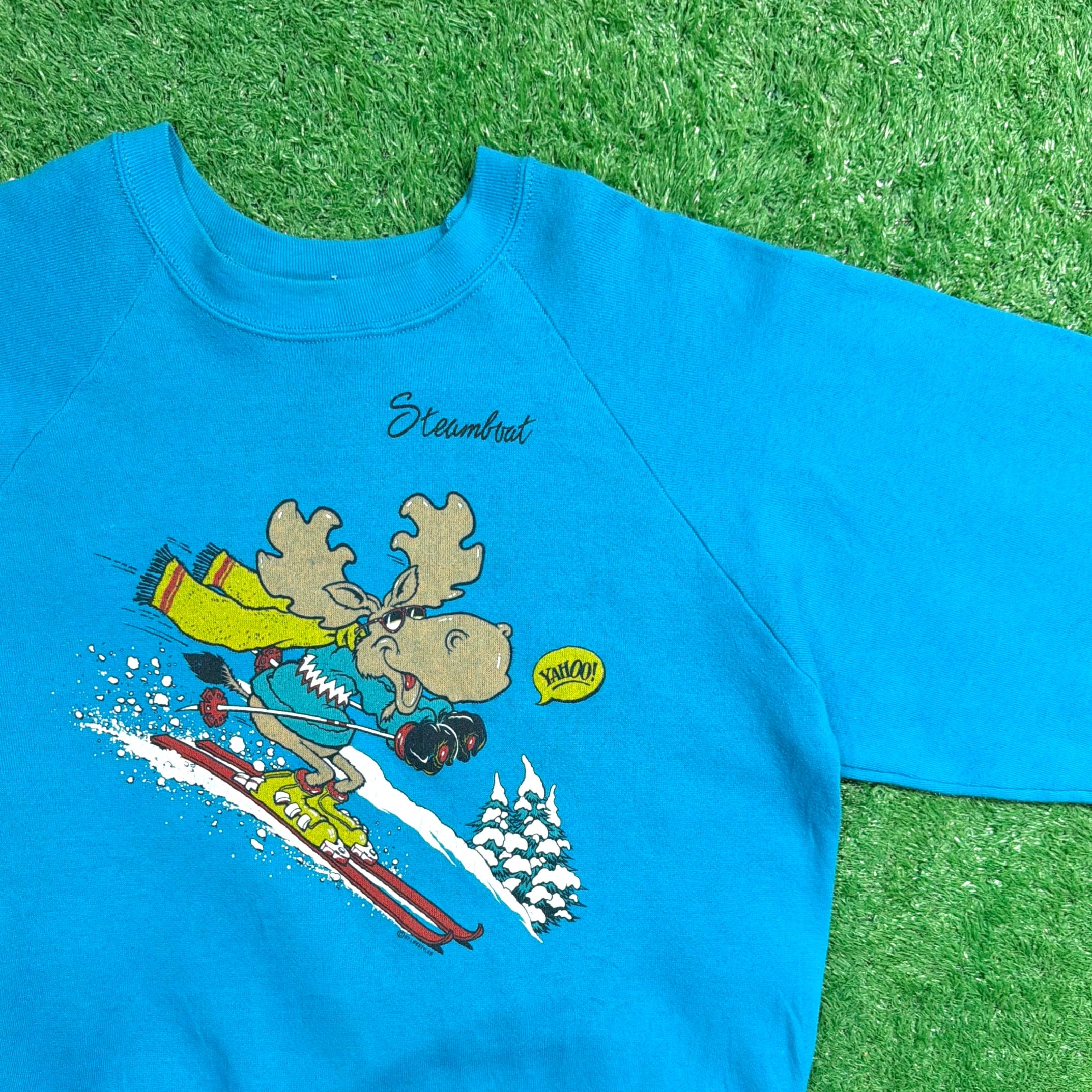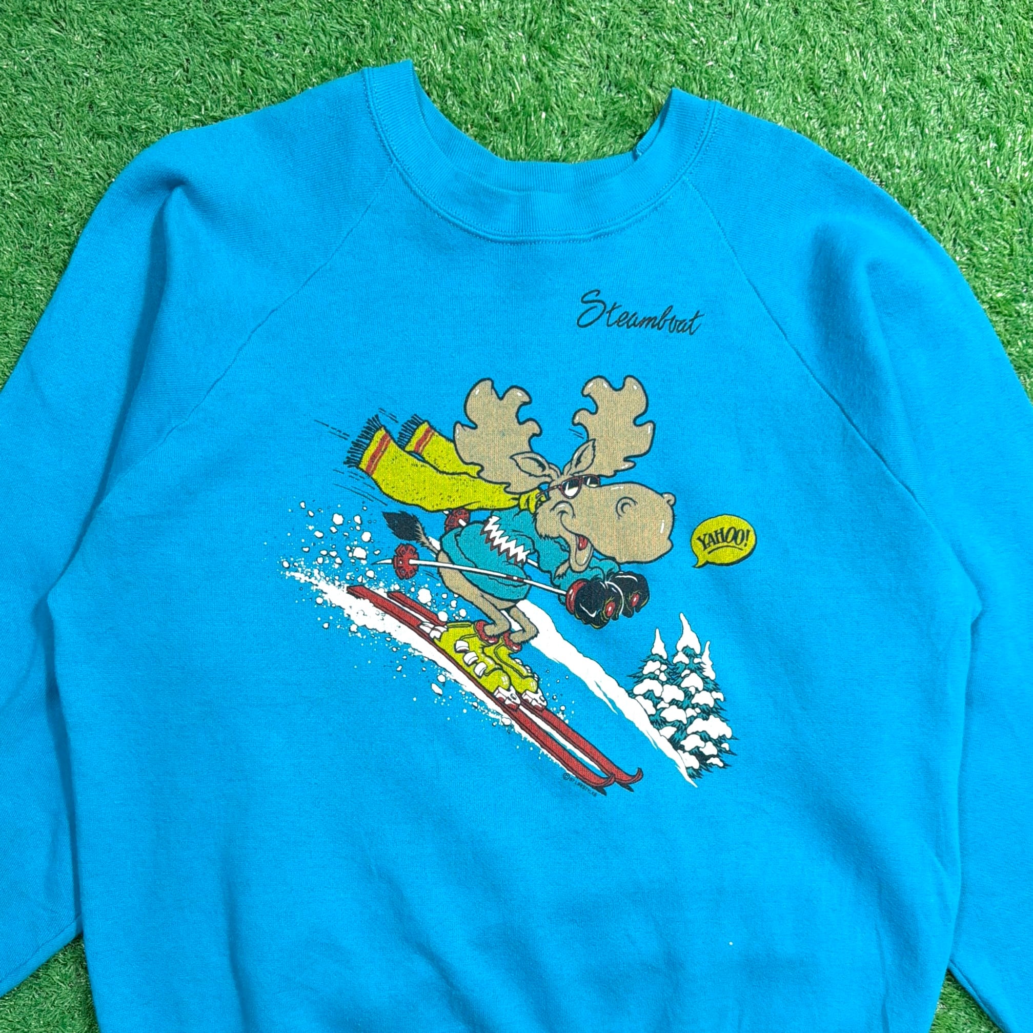 1980年代のアメリカ製、トナカイのスキーヤーが描かれたプリントスウェットシャツです。