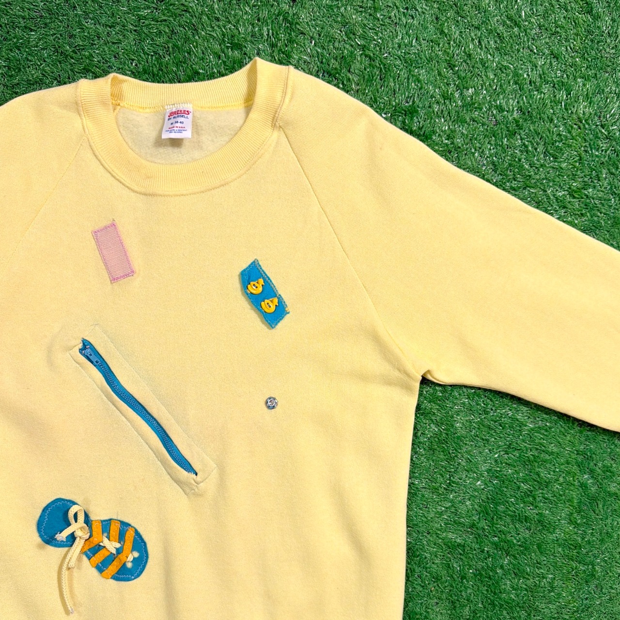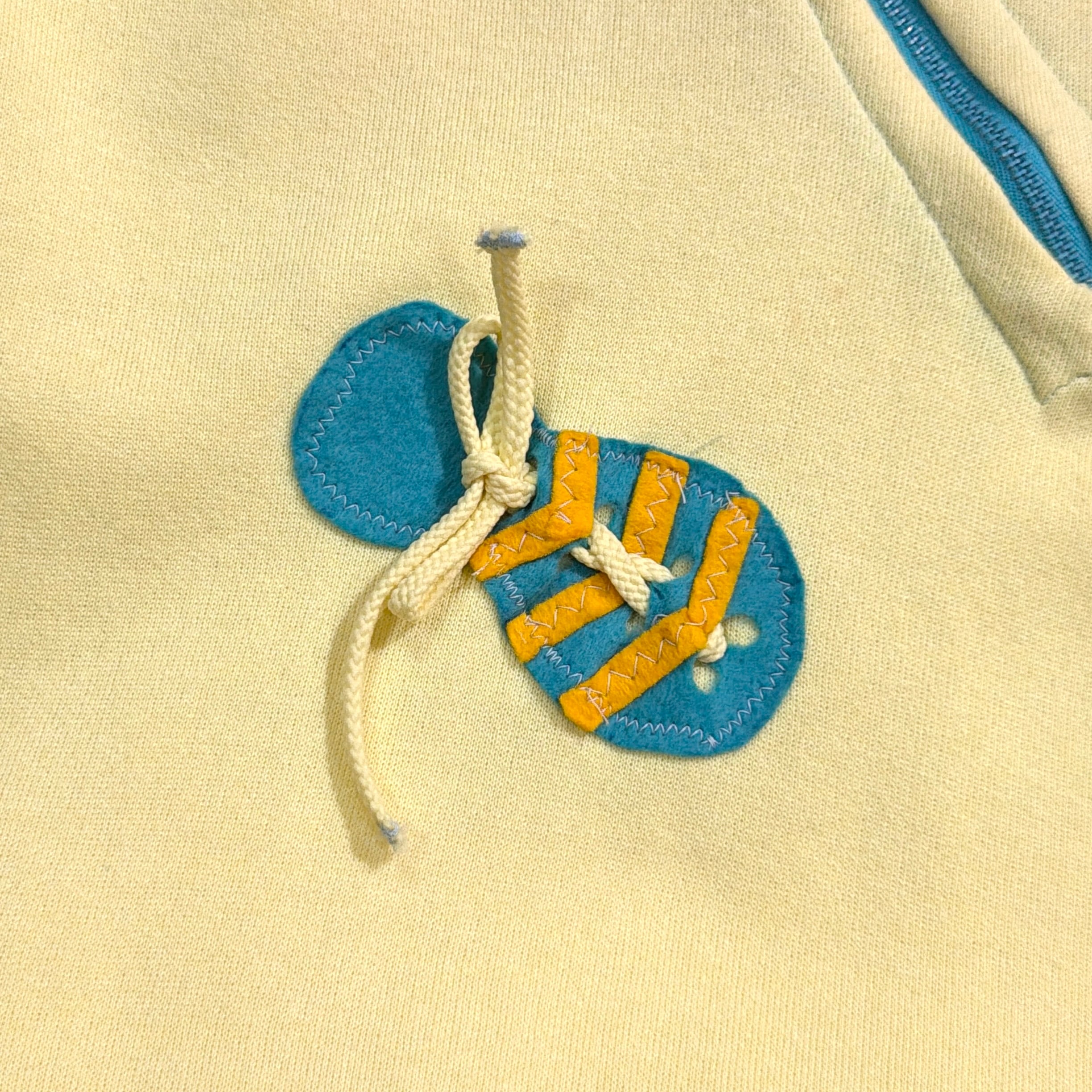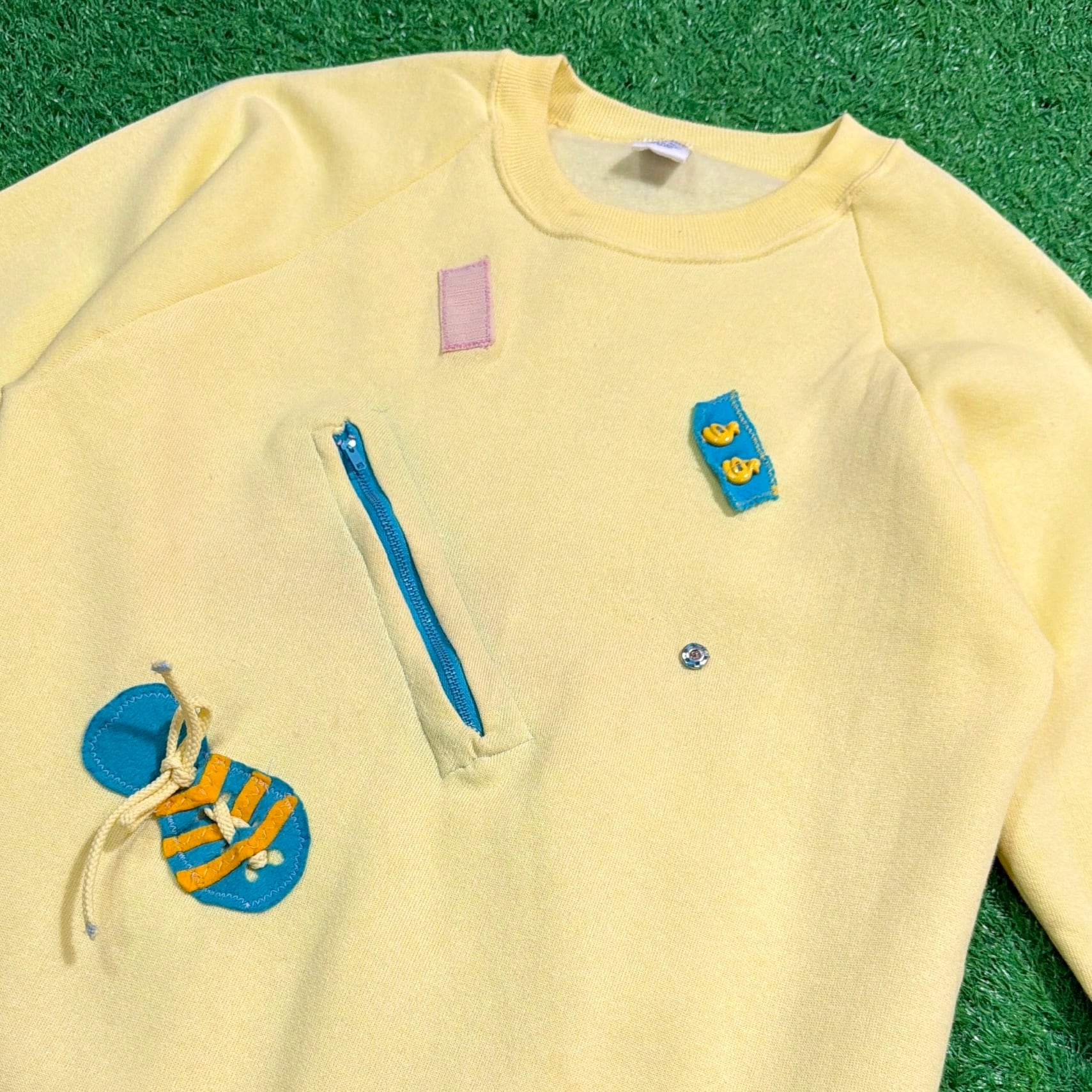 フロントにはファスナーやリボン、布パッチなどの異素材パーツが立体的にあしらわれたアートのようなデザイン。明るいイエローボディに差し色が映え、ポップでユニークな印象に仕上がっています。