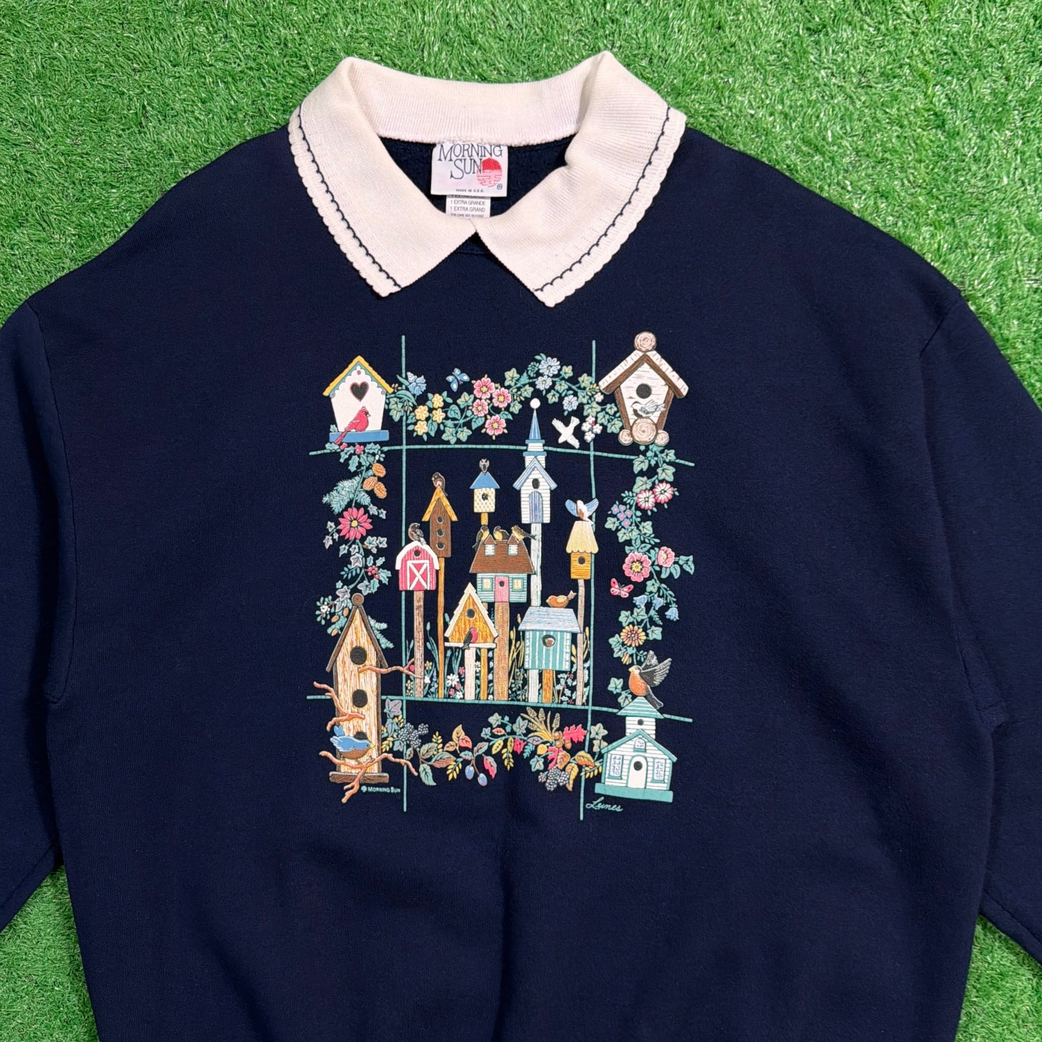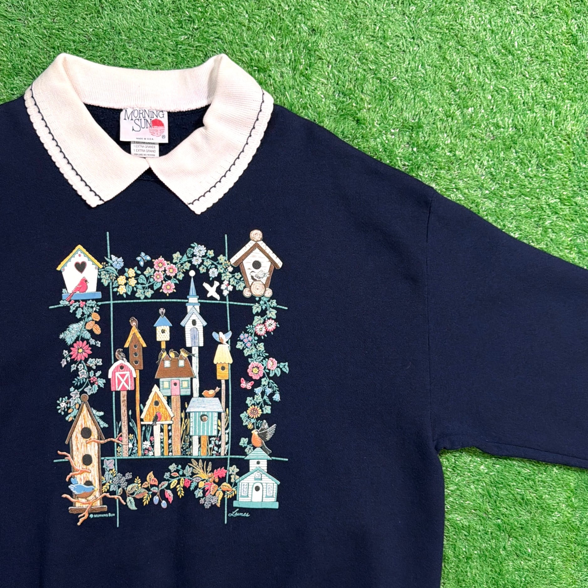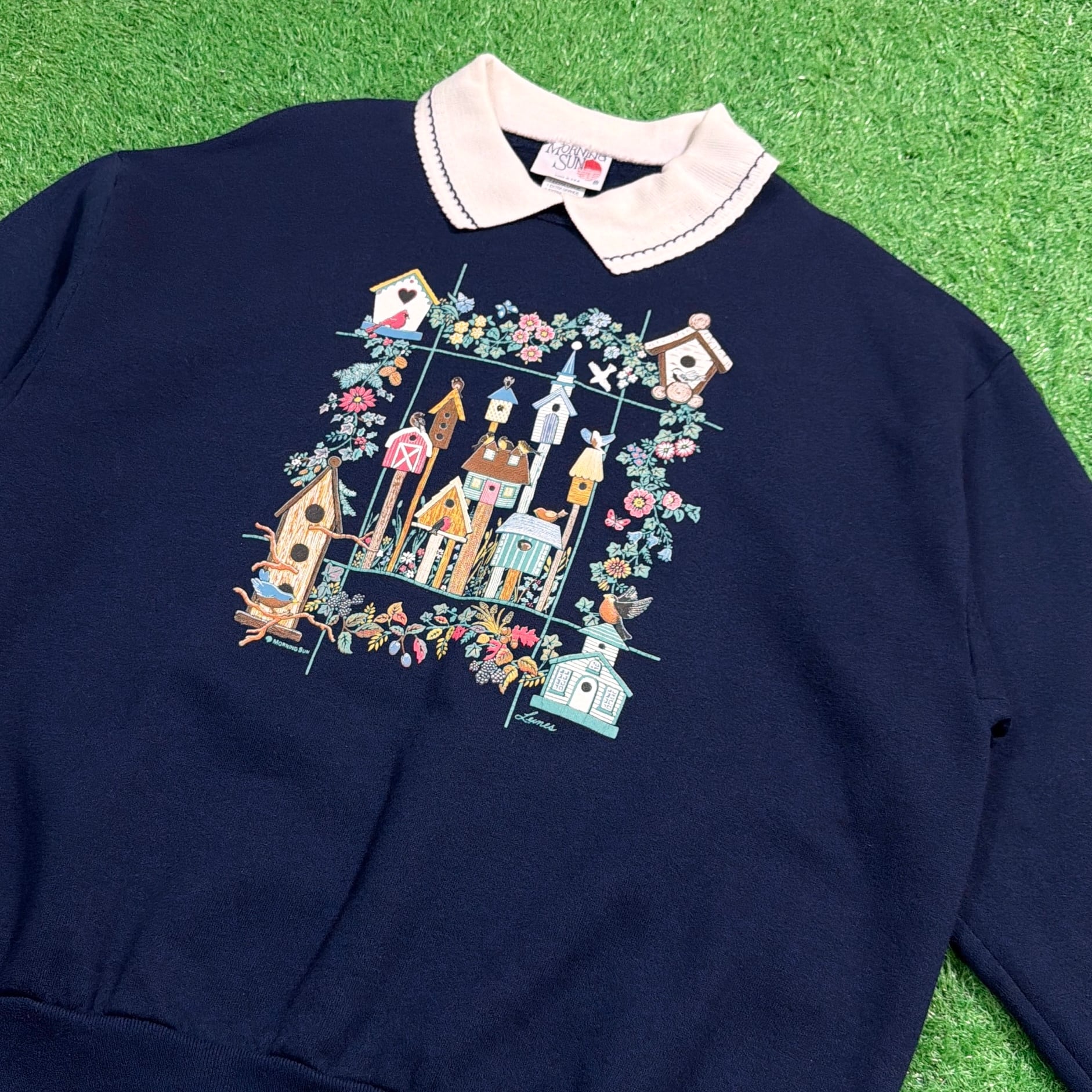 【Lady's】 90s ファンシー イラスト 襟付き スウェットシャツ / アメリカ製 USA製 90年代 スウェット スエット トレーナー ネイビー 紺 レディース 968