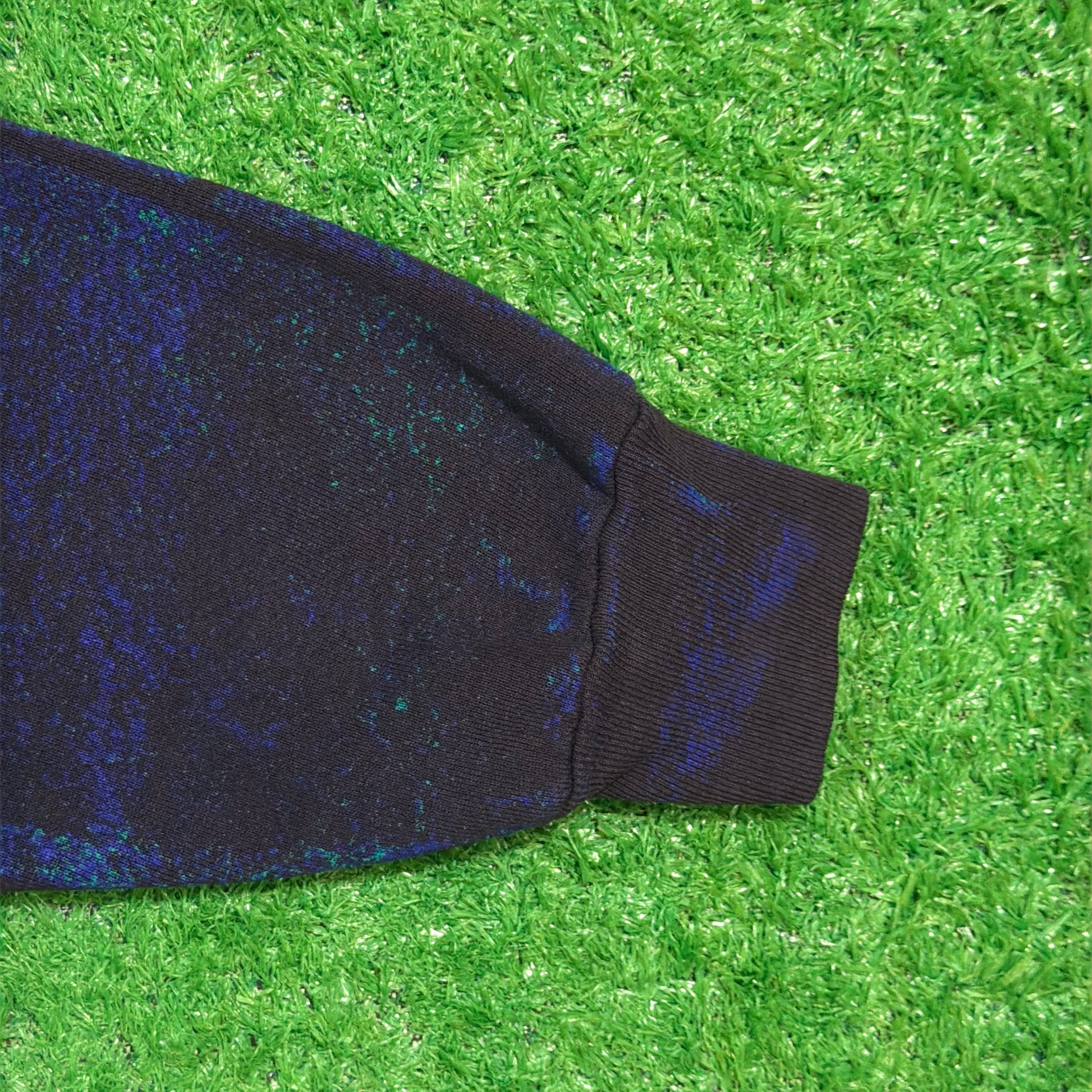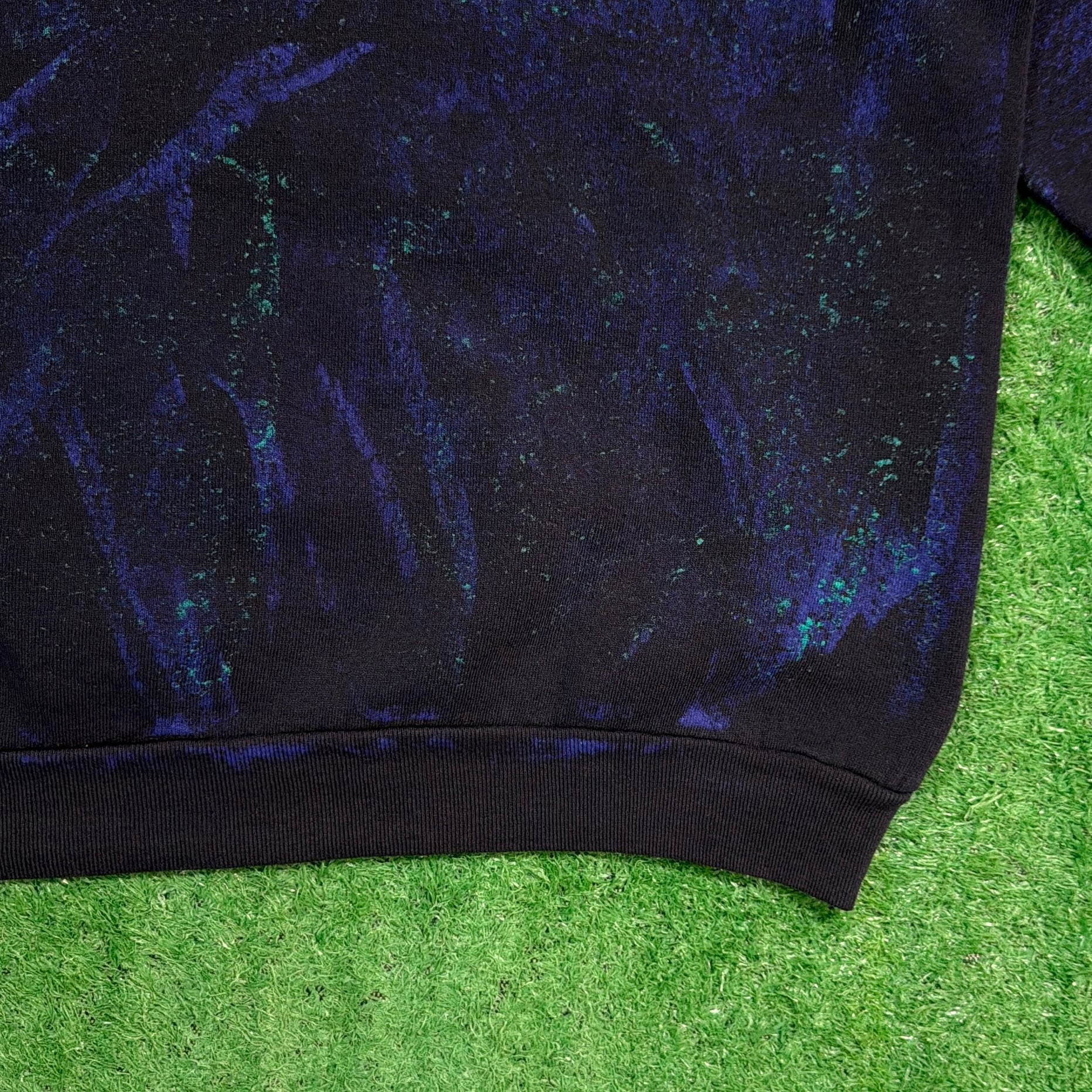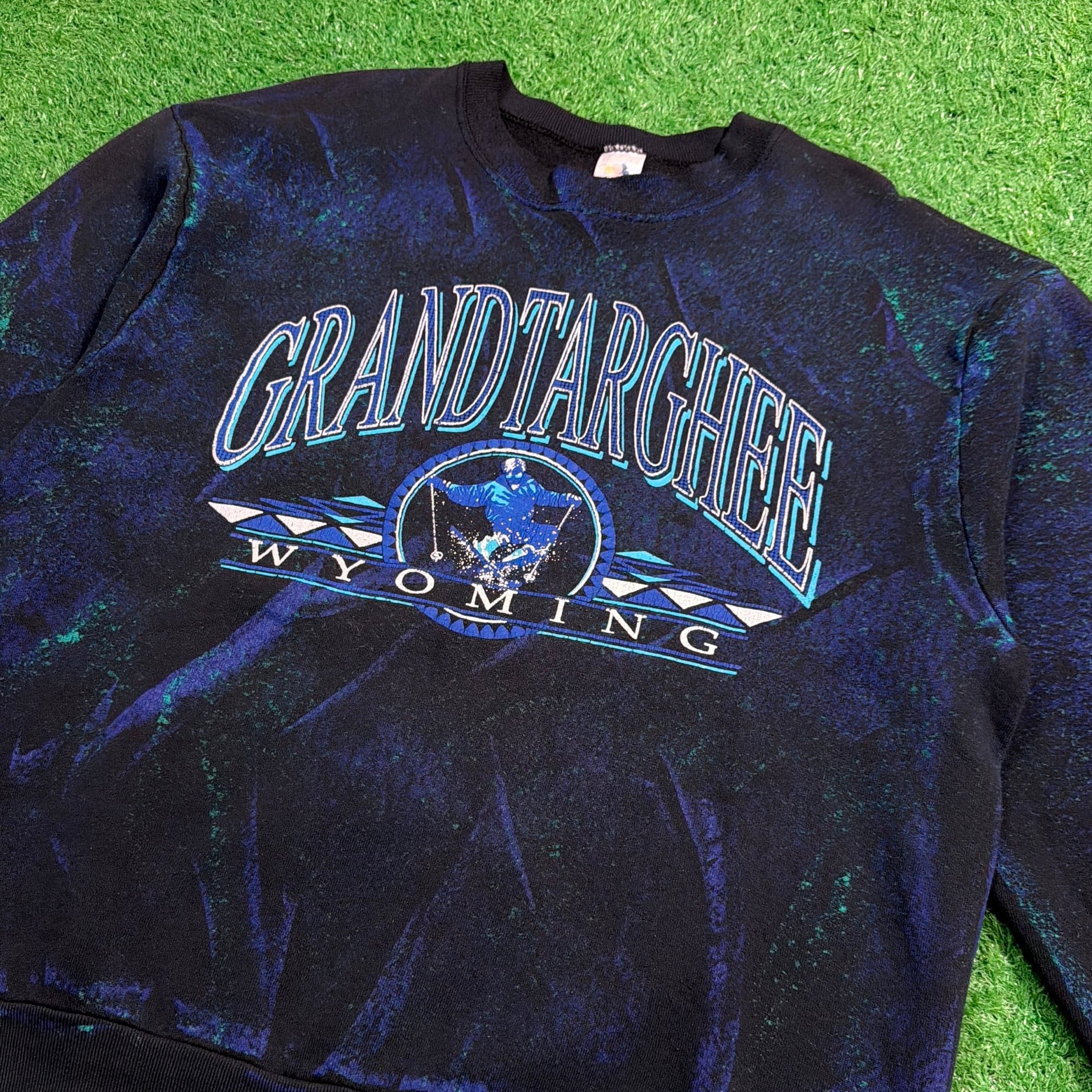 フロントにはスキーヤーのグラフィックと地名がデザインされ、ブルー×ブラックのムラ染めボディが印象的な一枚。個性的なカラーリングと大胆なプリントが90sらしい存在感を放っています。