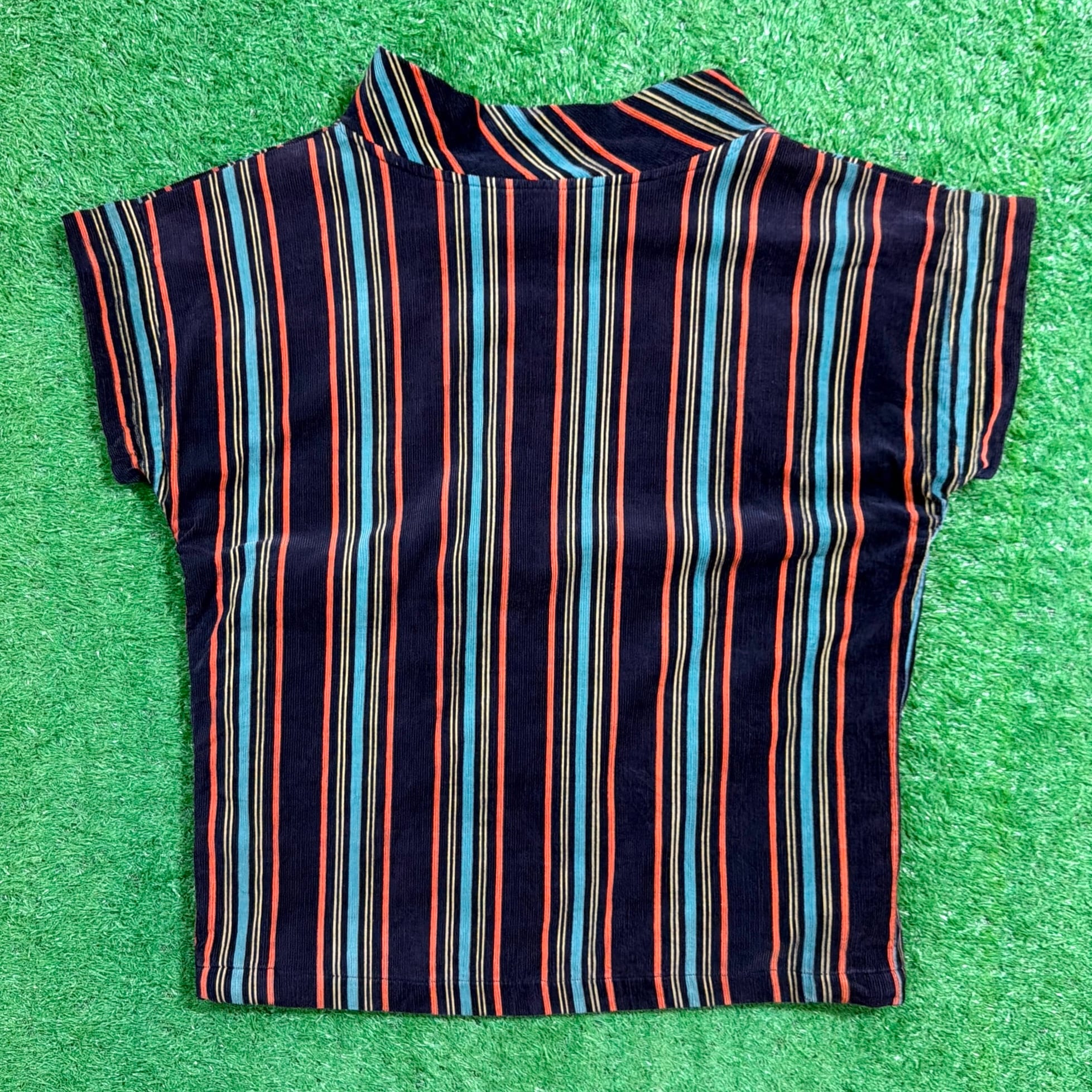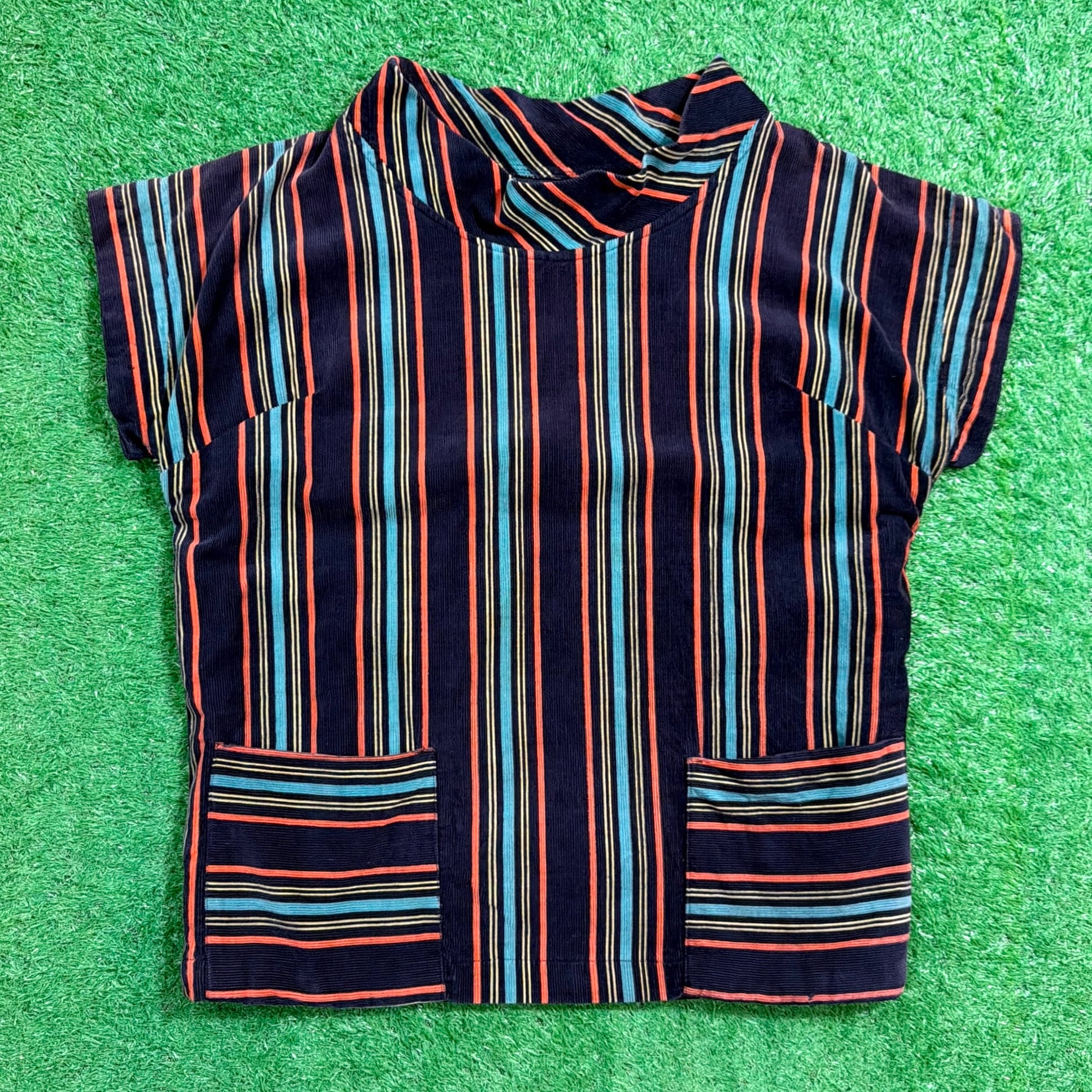 コーデュロイに、マルチストライプ柄が映える一着。袖はやや短めのフレンチスリーブで、すっきりとしたシルエットに仕上がっています。裾のポケットデザインがアクセントになっており、レトロな雰囲気の中にも遊び心を感じるアイテムです。
