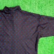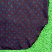 コットン100%ながら、さらっとした手触りとほのかな光沢感があり、ポリエステルのような上品な質感が特徴。深みのあるネイビーベースに、ブルーやグリーンのペイズリーが散りばめられた落ち着いたデザインです。