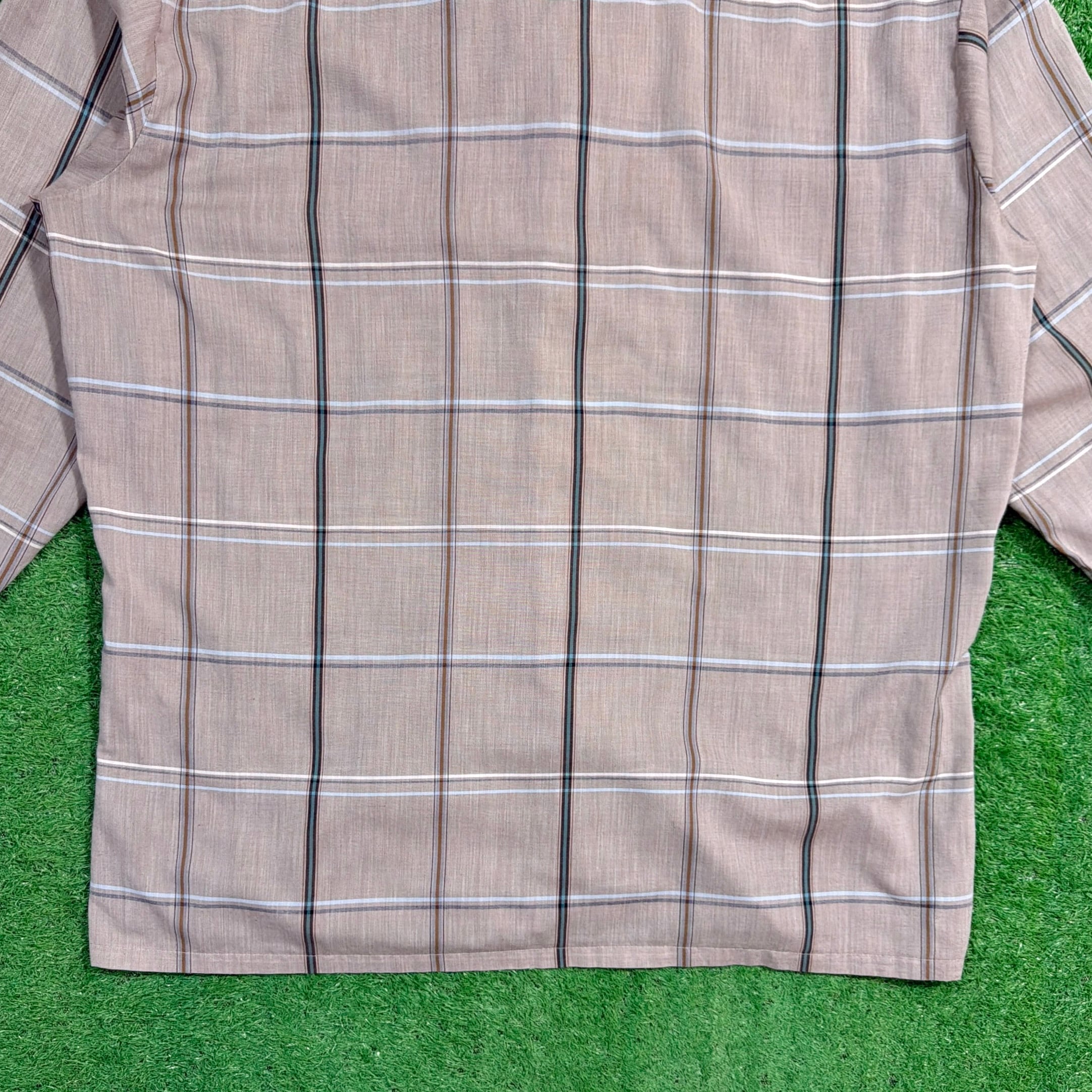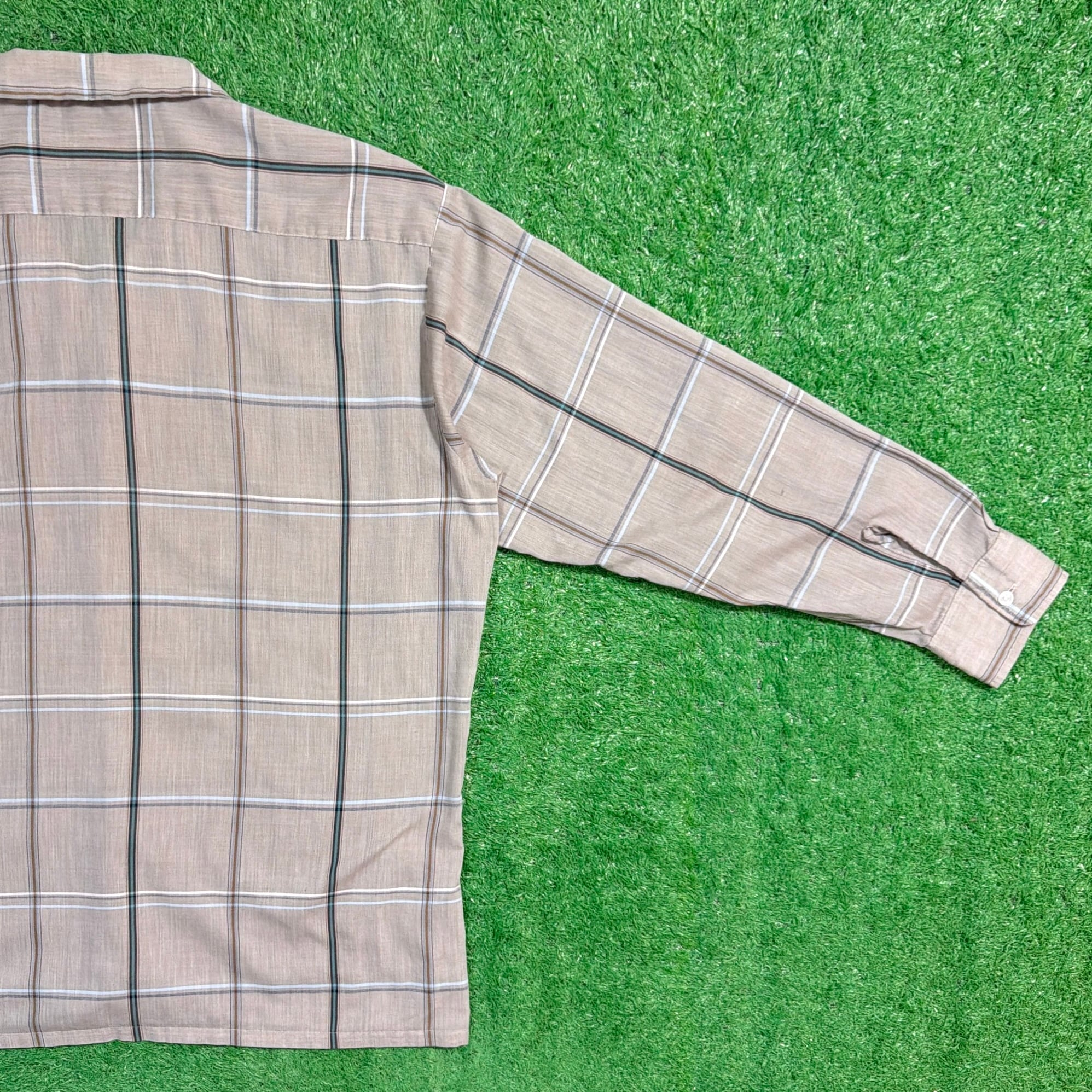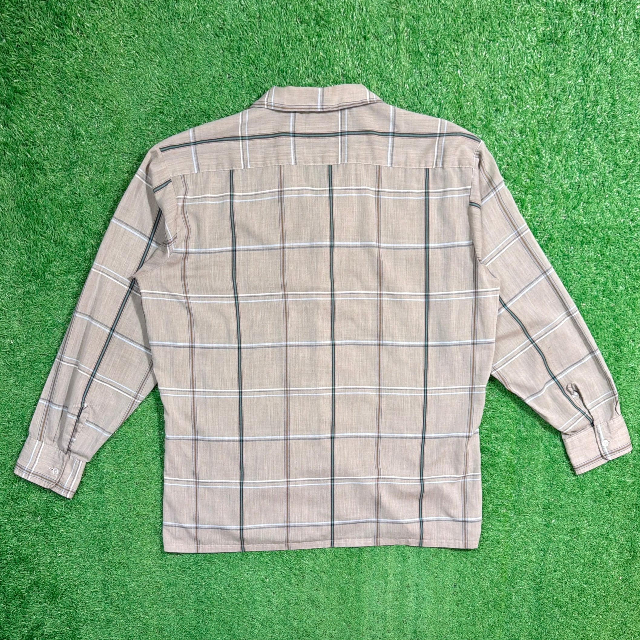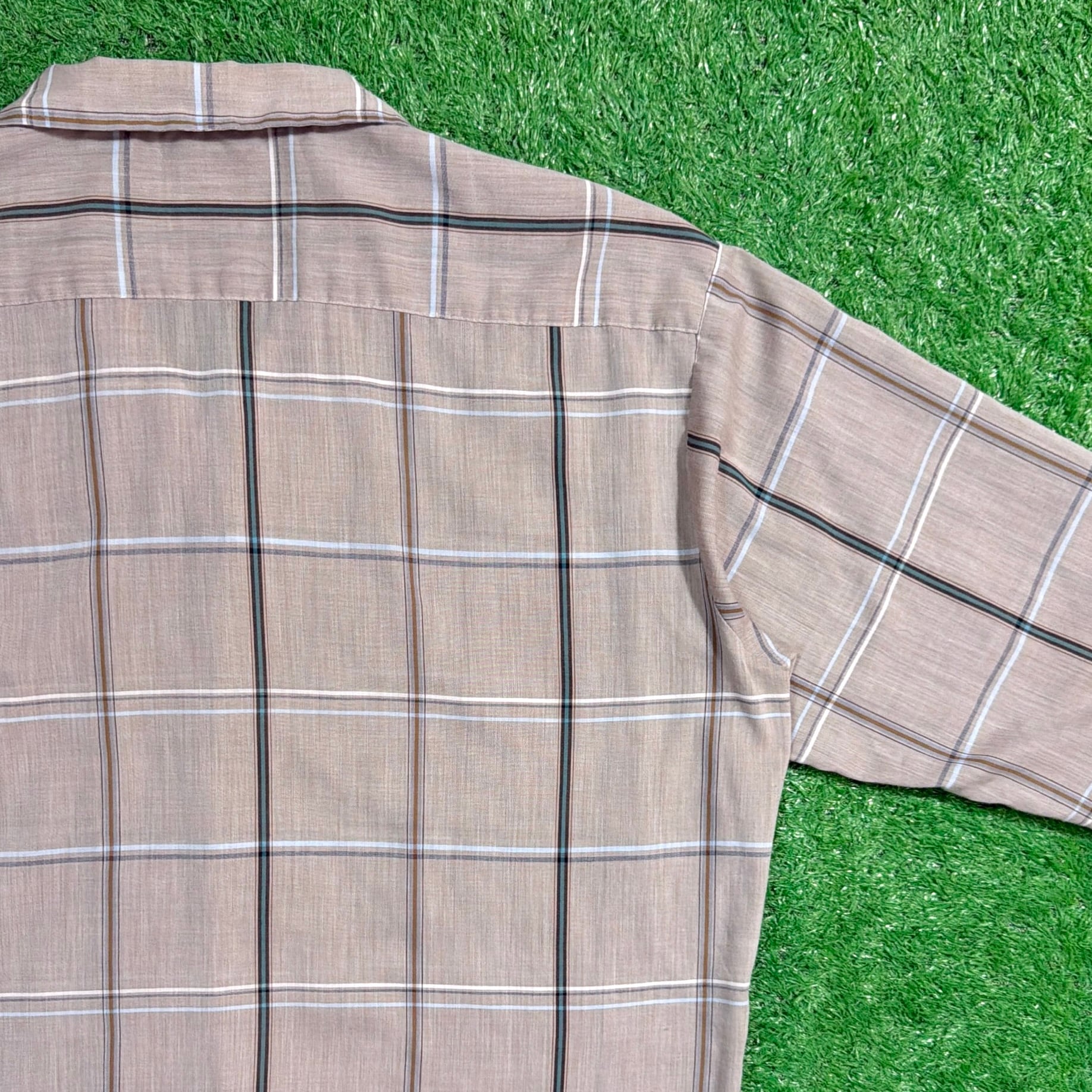 柔らかく薄手のポリコットン生地で仕立てられており、軽やかな着心地と、ほんのりくたっとしたヴィンテージ特有の風合いが魅力。淡いベージュにネイビーやグリーンのチェックが入った落ち着いた配色で、古着らしい抜け感のある雰囲気を楽しめます。