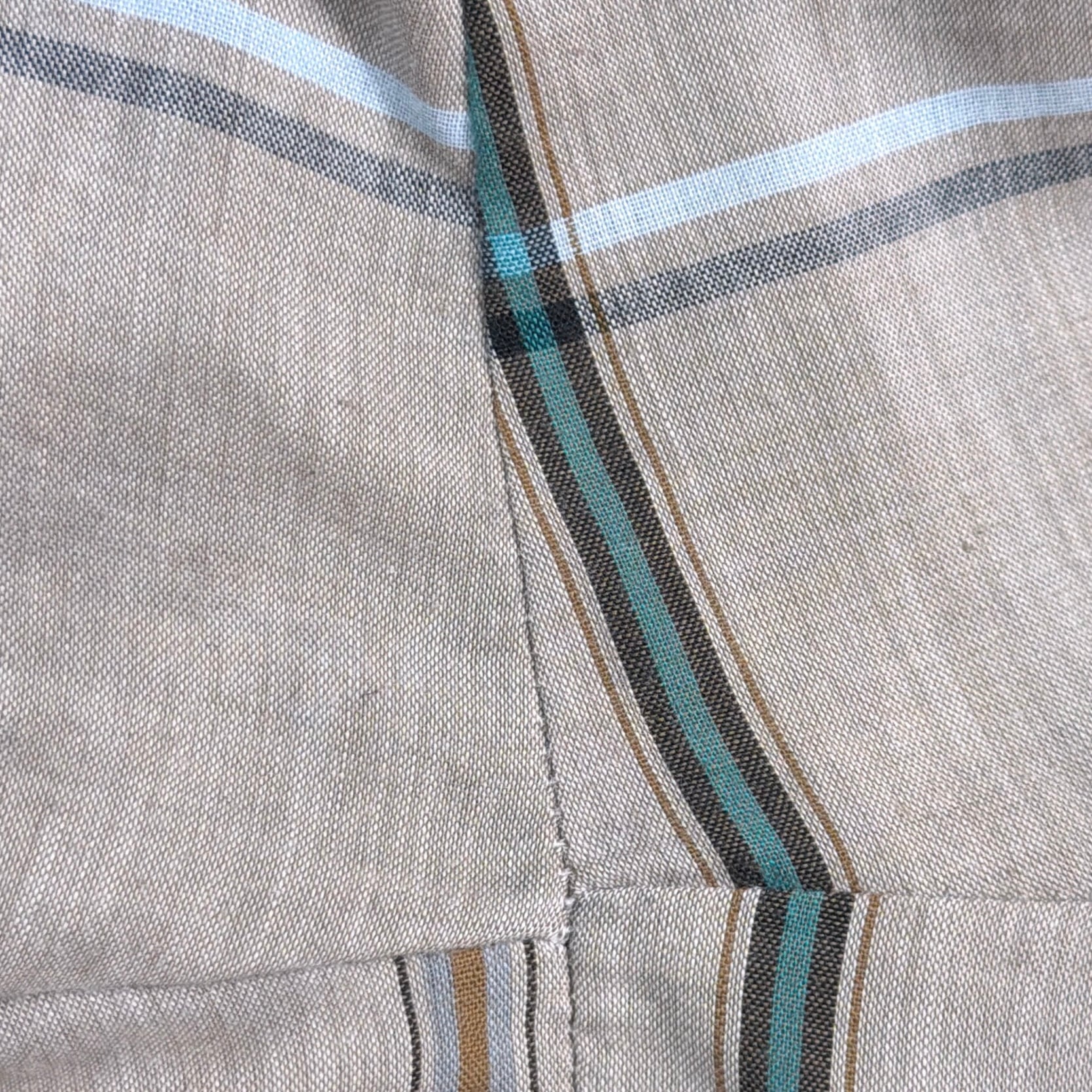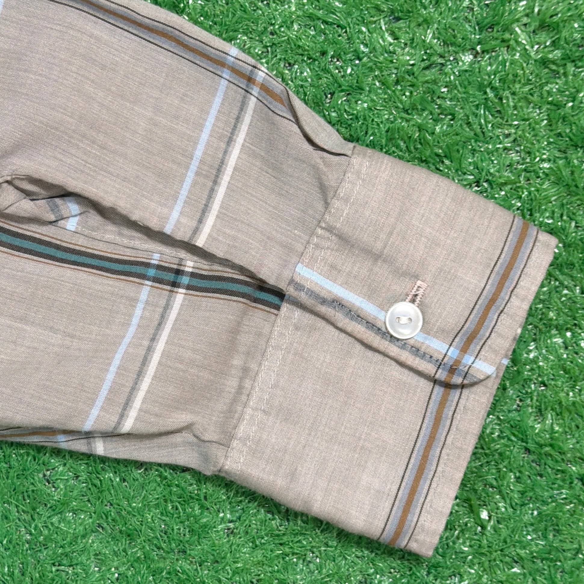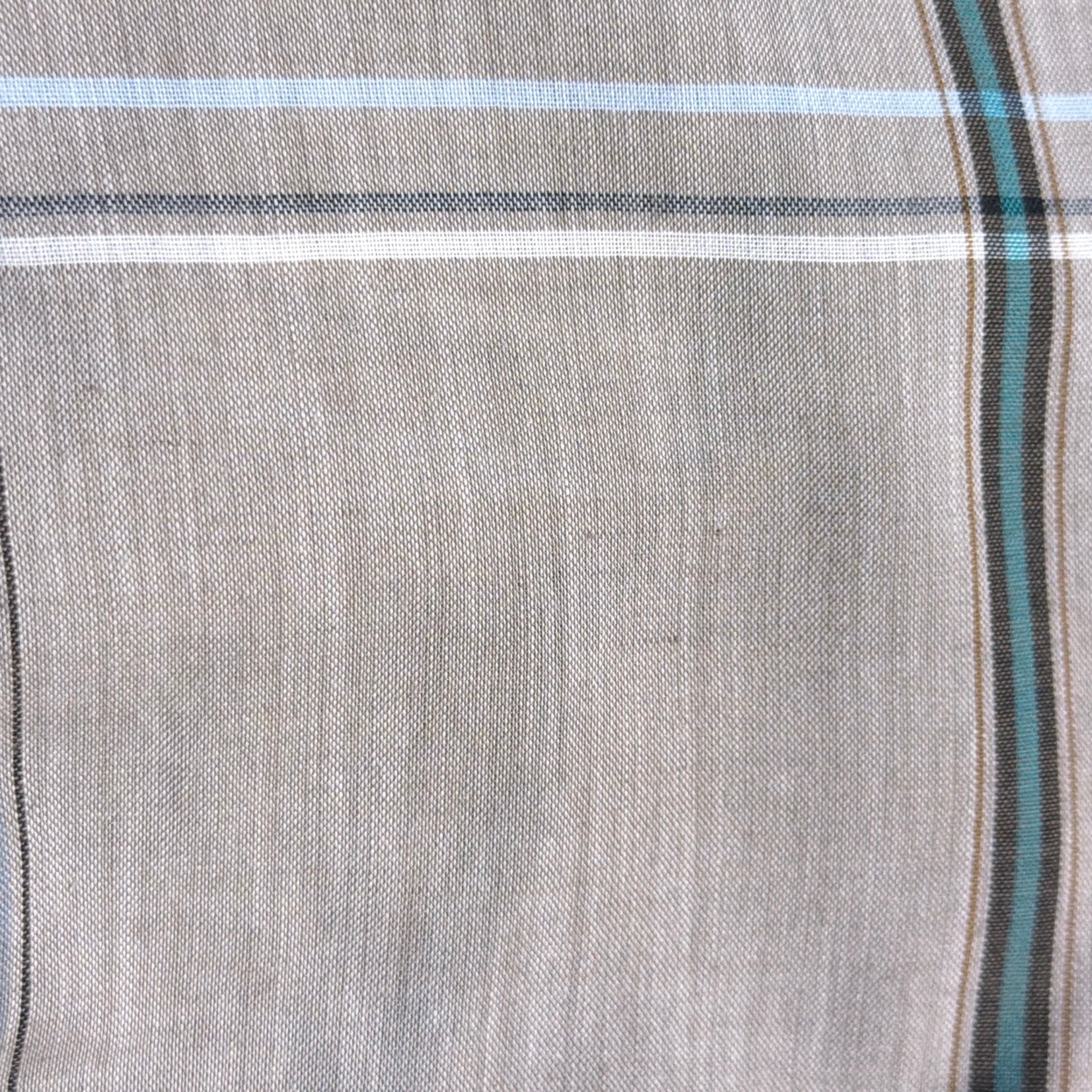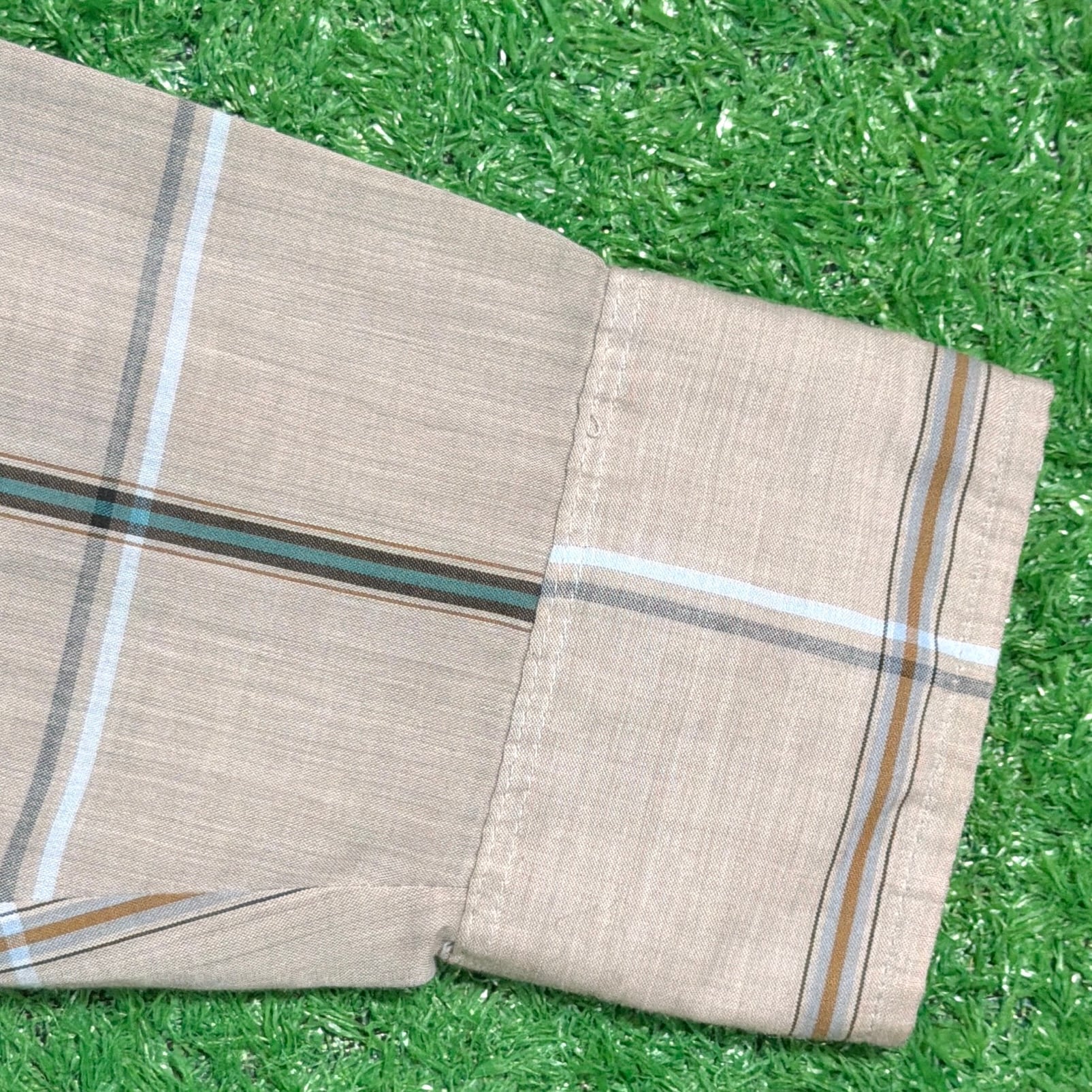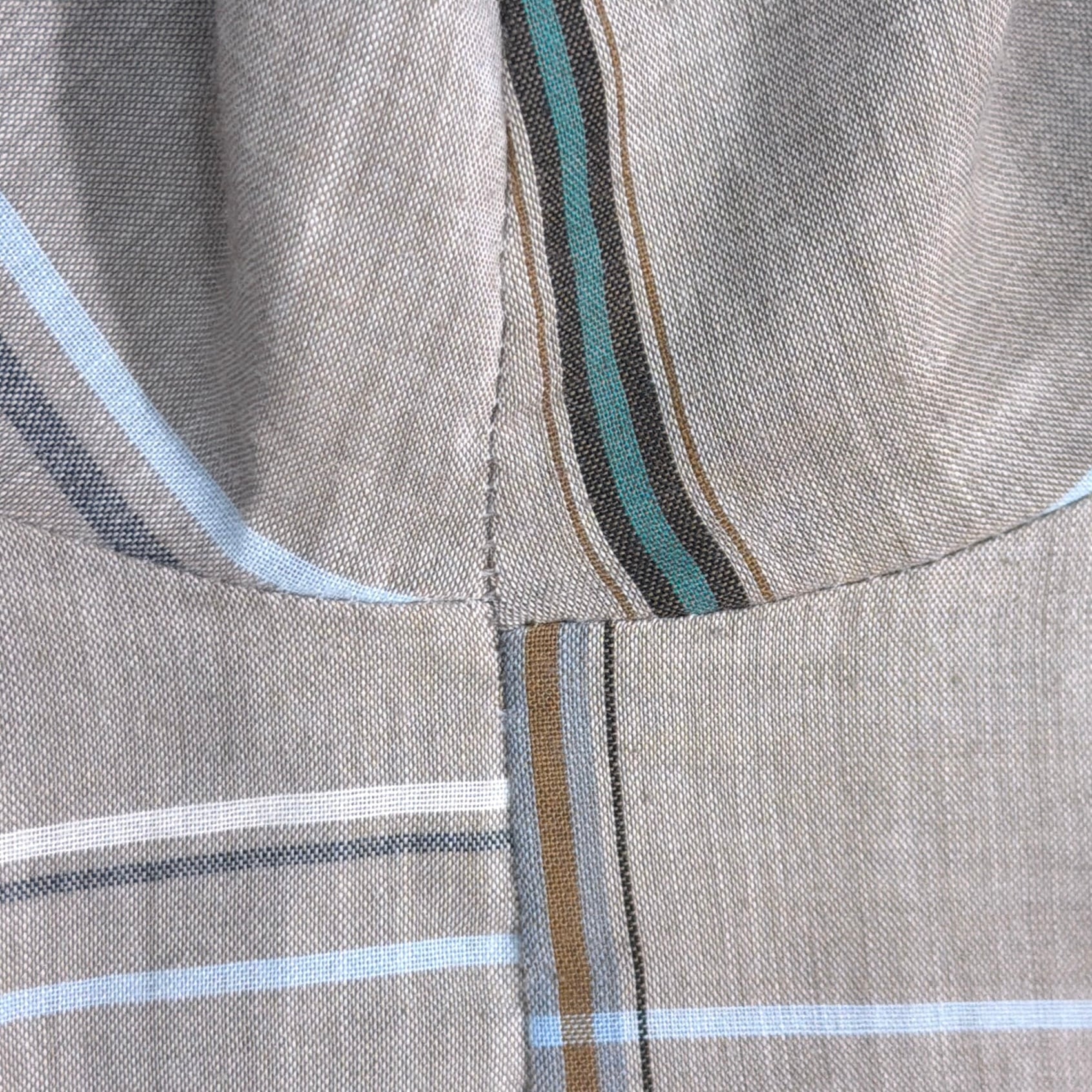 柔らかく薄手のポリコットン生地で仕立てられており、軽やかな着心地と、ほんのりくたっとしたヴィンテージ特有の風合いが魅力。淡いベージュにネイビーやグリーンのチェックが入った落ち着いた配色で、古着らしい抜け感のある雰囲気を楽しめます。