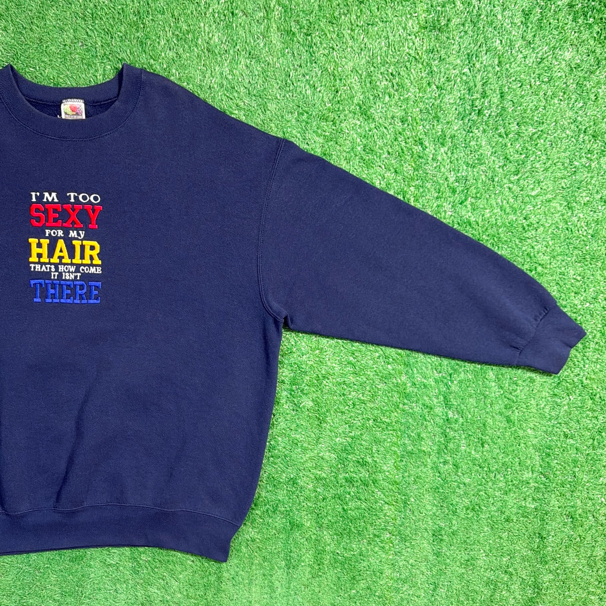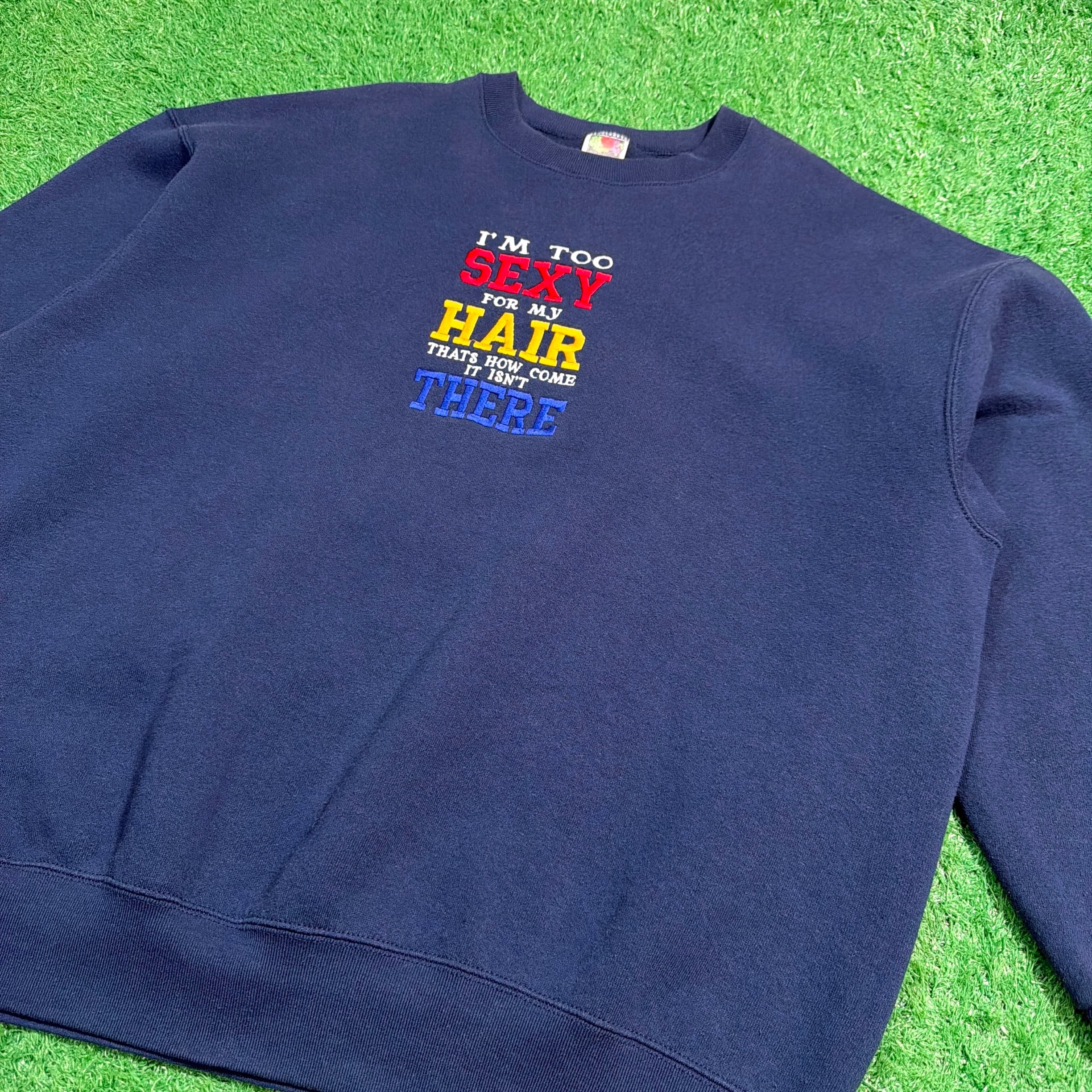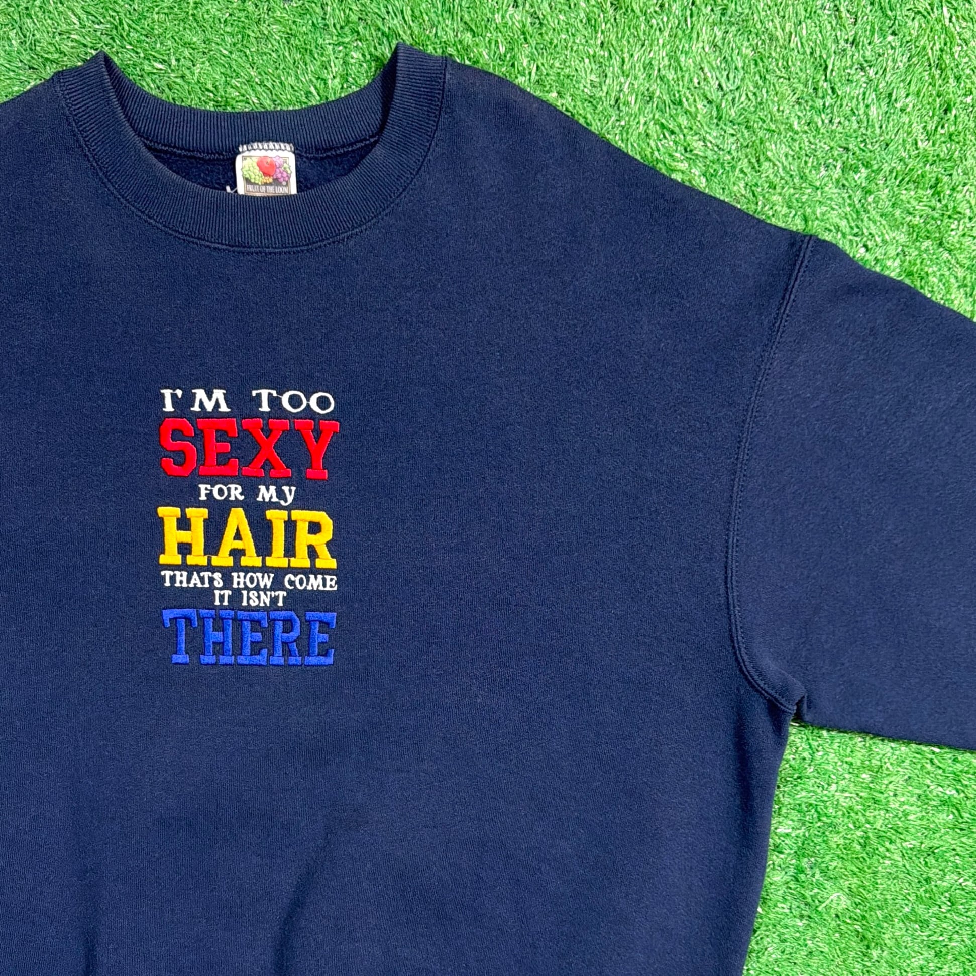 フロントには「I’M TOO SEXY FOR MY HAIR THAT’S HOW COME IT ISN’T THERE(俺の髪がないのは、セクシーすぎるからさ)」という、ユーモアのある英文メッセージがカラフルな刺繍でデザインされた一枚。