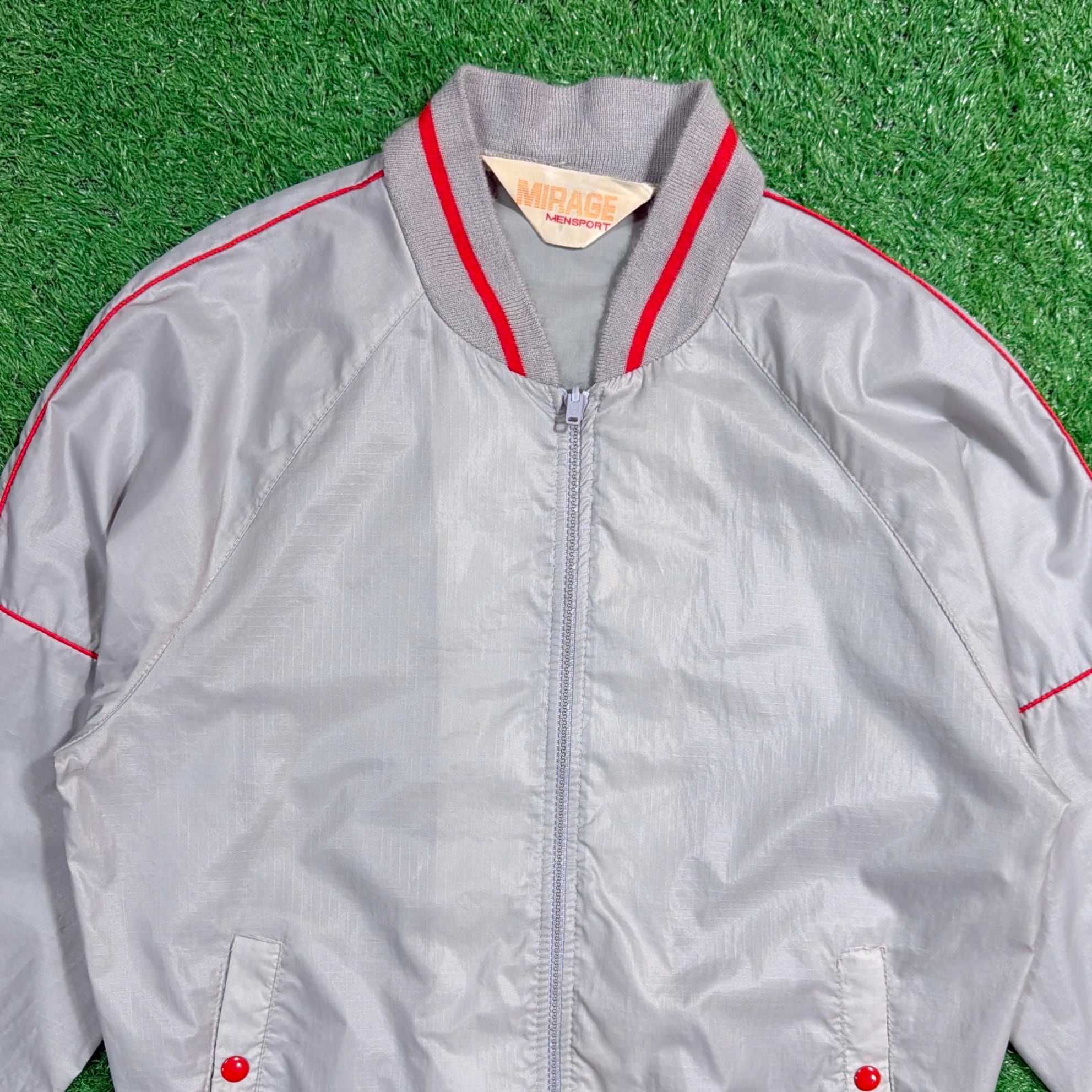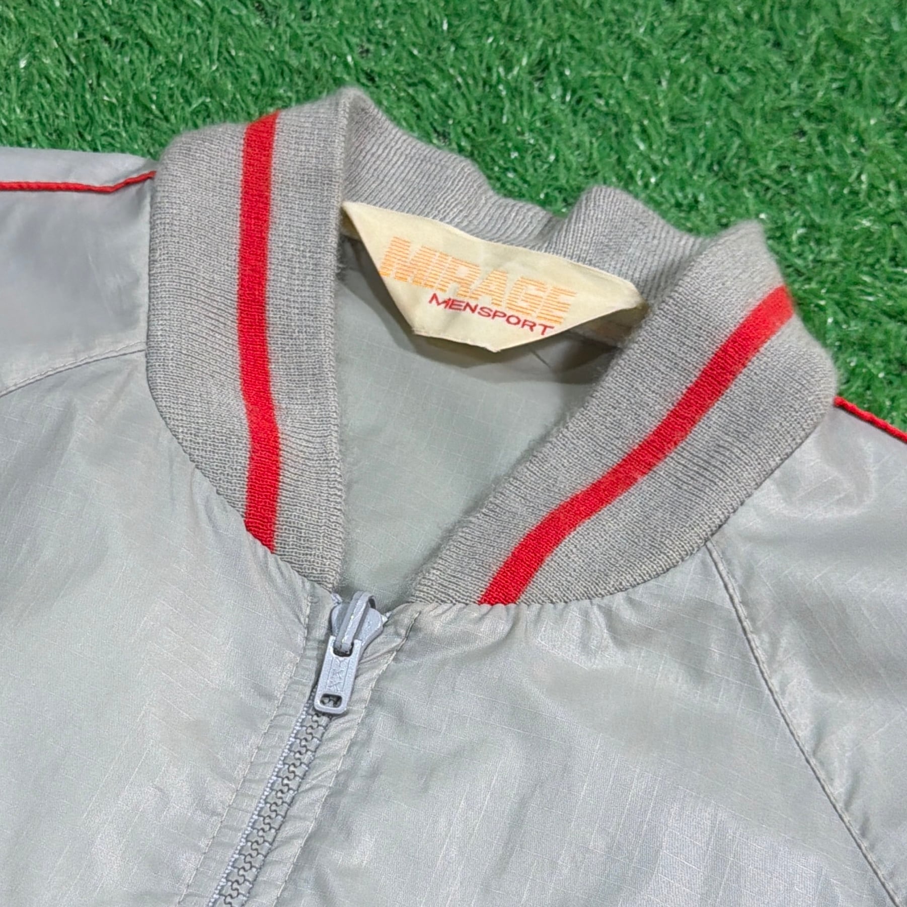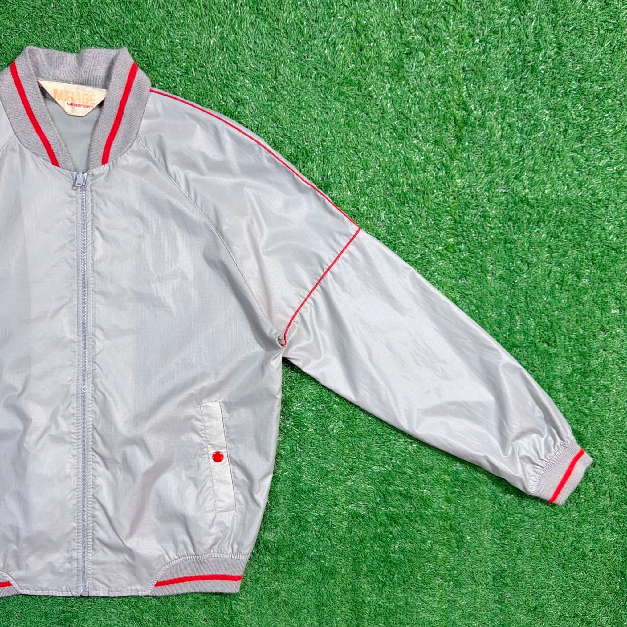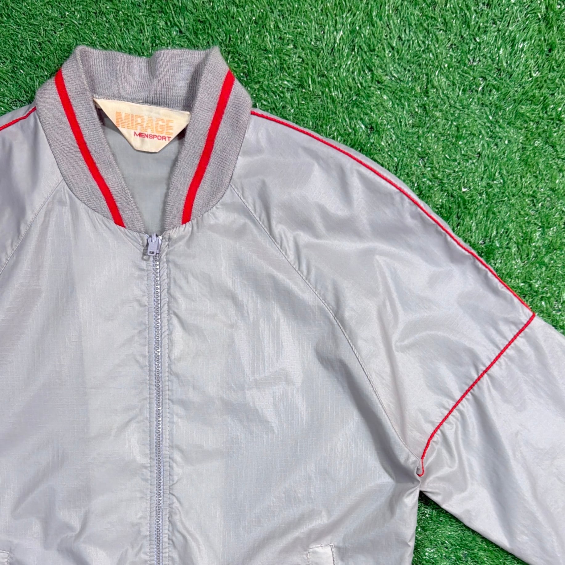 シルバーグレーのボディに、襟・袖・裾のリブラインが映えるレトロなデザイン。軽くシャカっとしたナイロン素材で、裏地のない軽量タイプ。