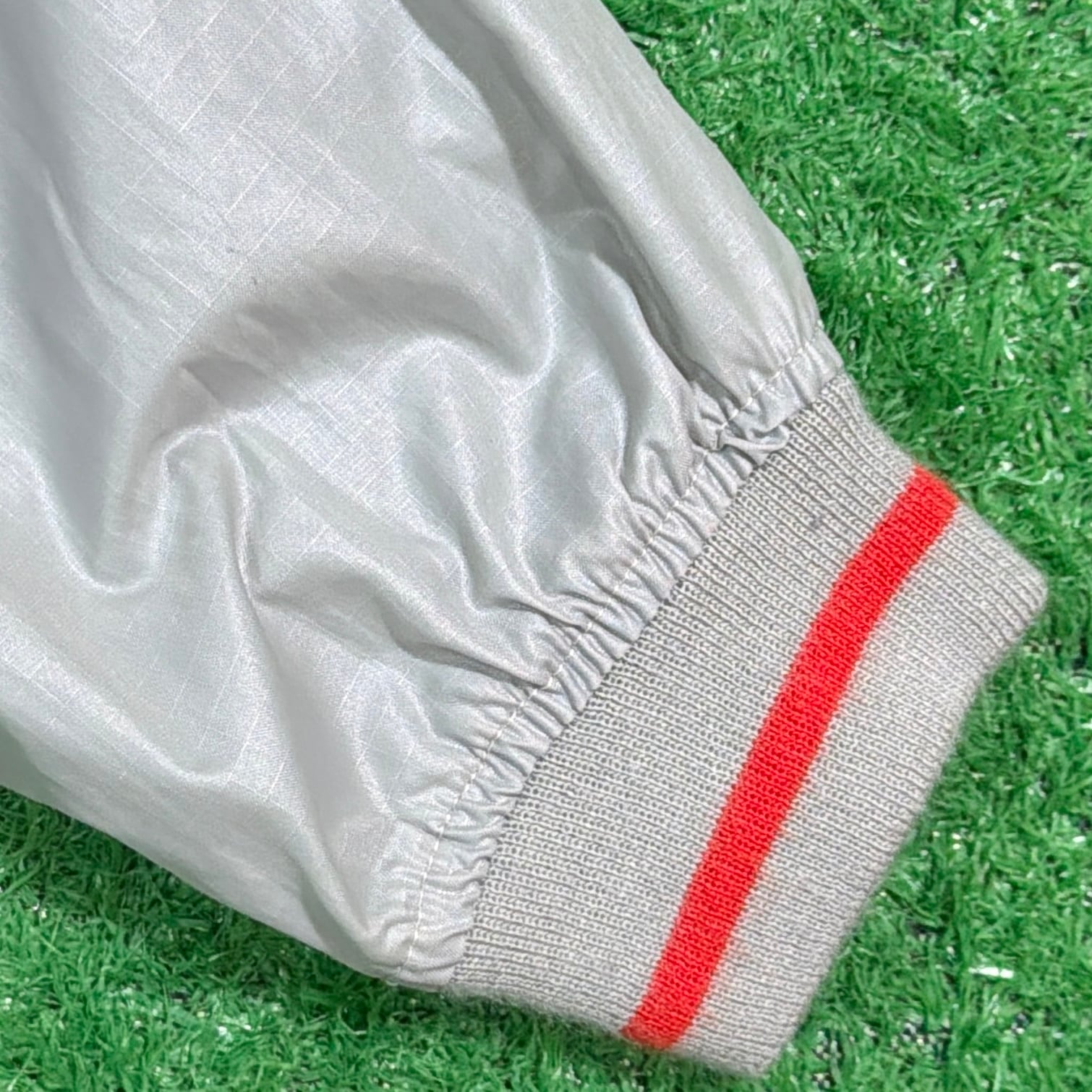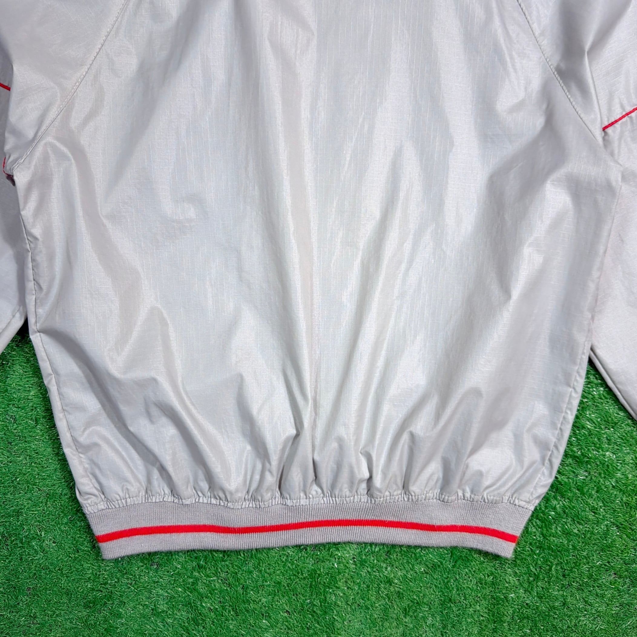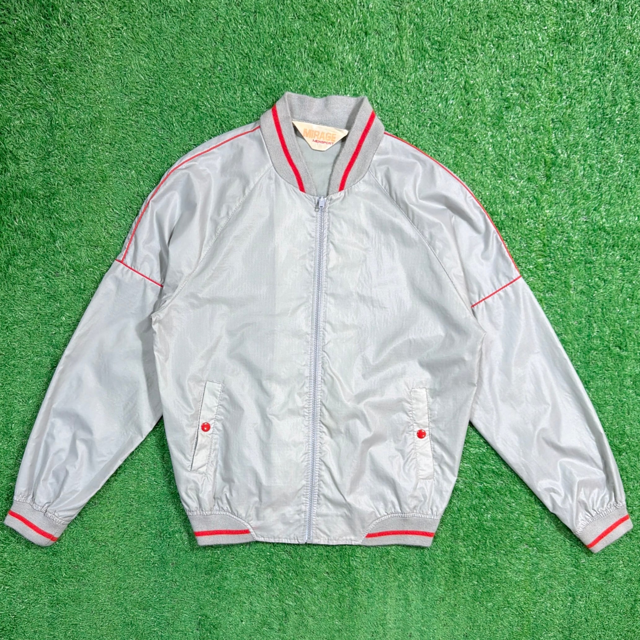 シルバーグレーのボディに、襟・袖・裾のリブラインが映えるレトロなデザイン。軽くシャカっとしたナイロン素材で、裏地のない軽量タイプ。