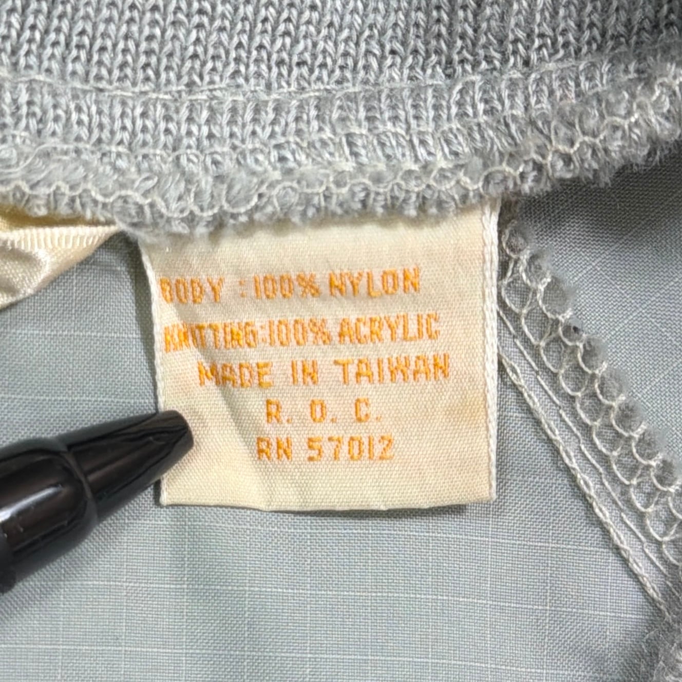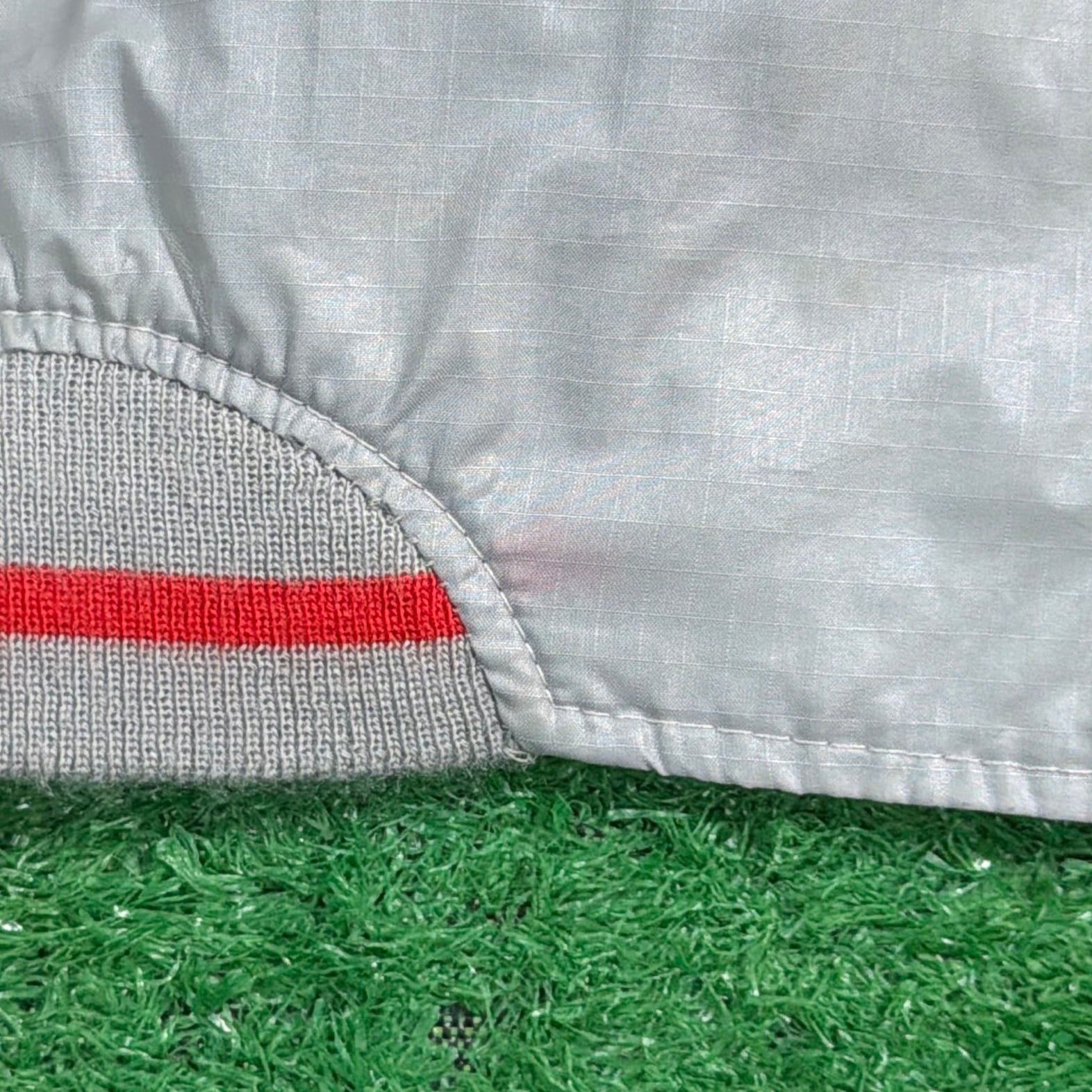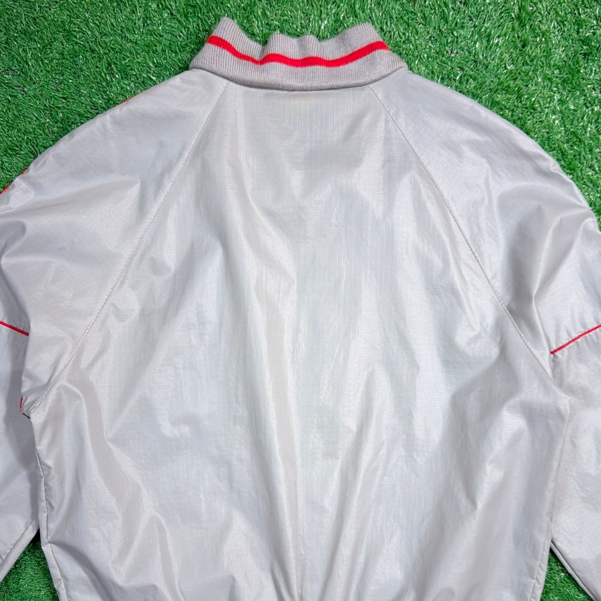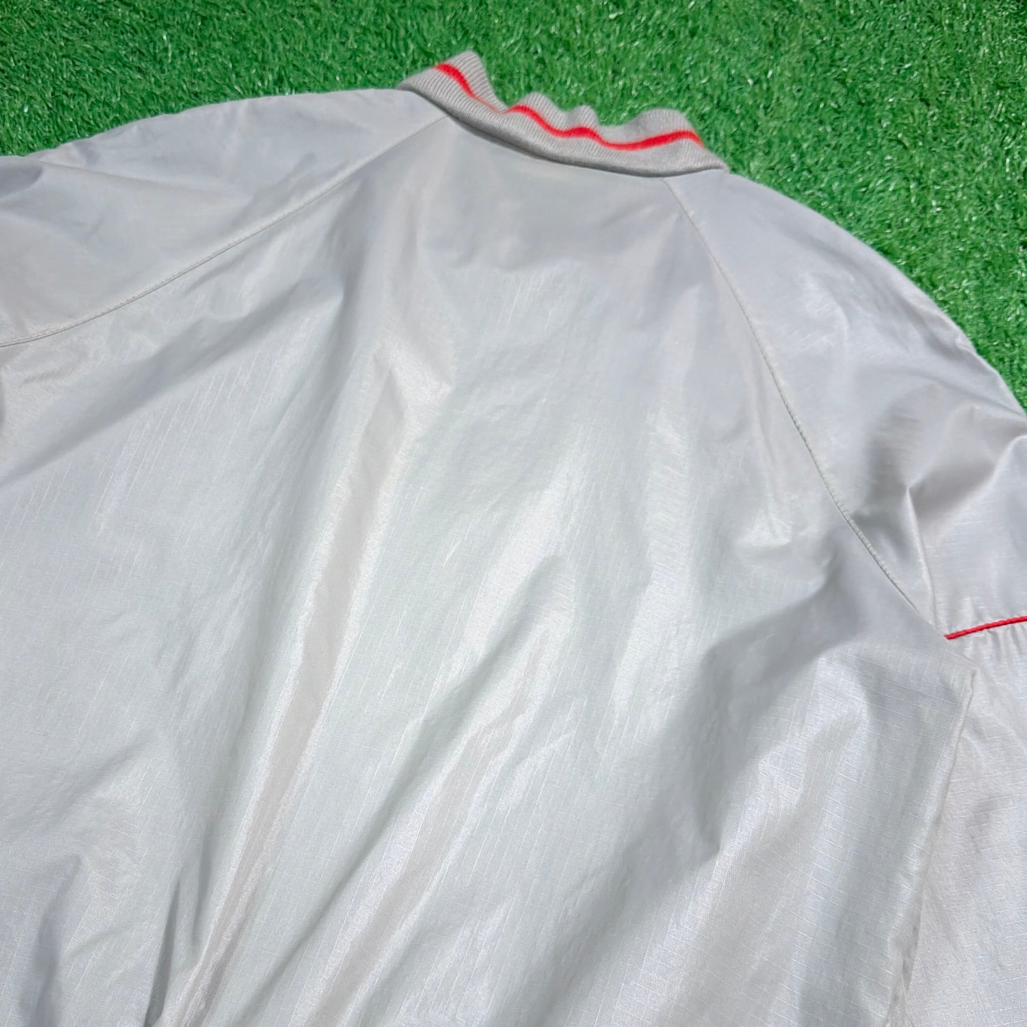 シルバーグレーのボディに、襟・袖・裾のリブラインが映えるレトロなデザイン。軽くシャカっとしたナイロン素材で、裏地のない軽量タイプ。
