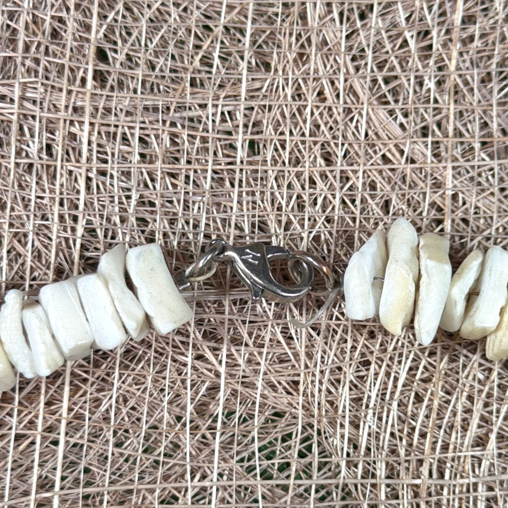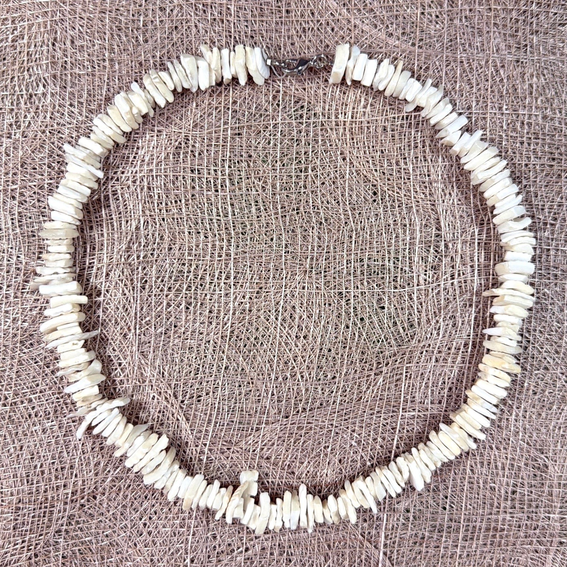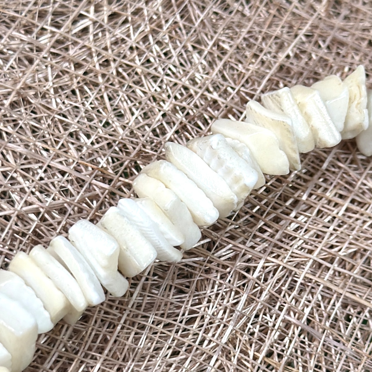 自然な凹凸と光沢をもったホワイトカラーのシェルが連なり、ビーチアクセサリーらしいラフで涼しげな表情が魅力。素肌にはもちろん、Tシャツの上から重ねても雰囲気よく馴染みます。ユニセックスで着用可能なアイテムです。