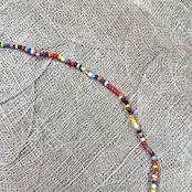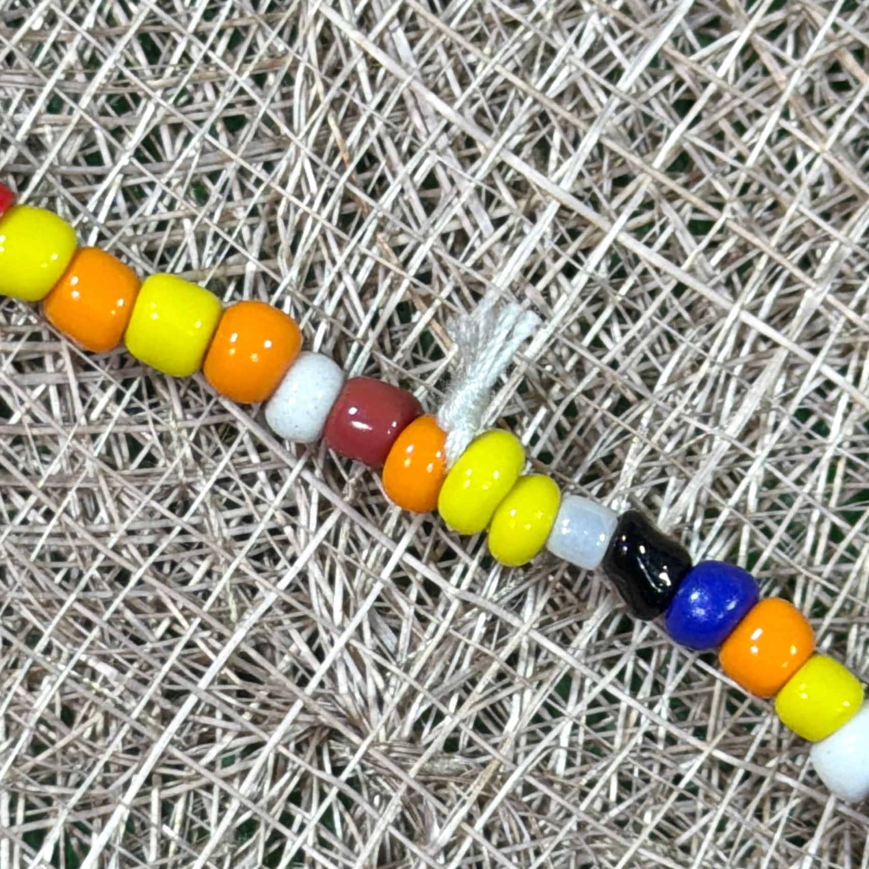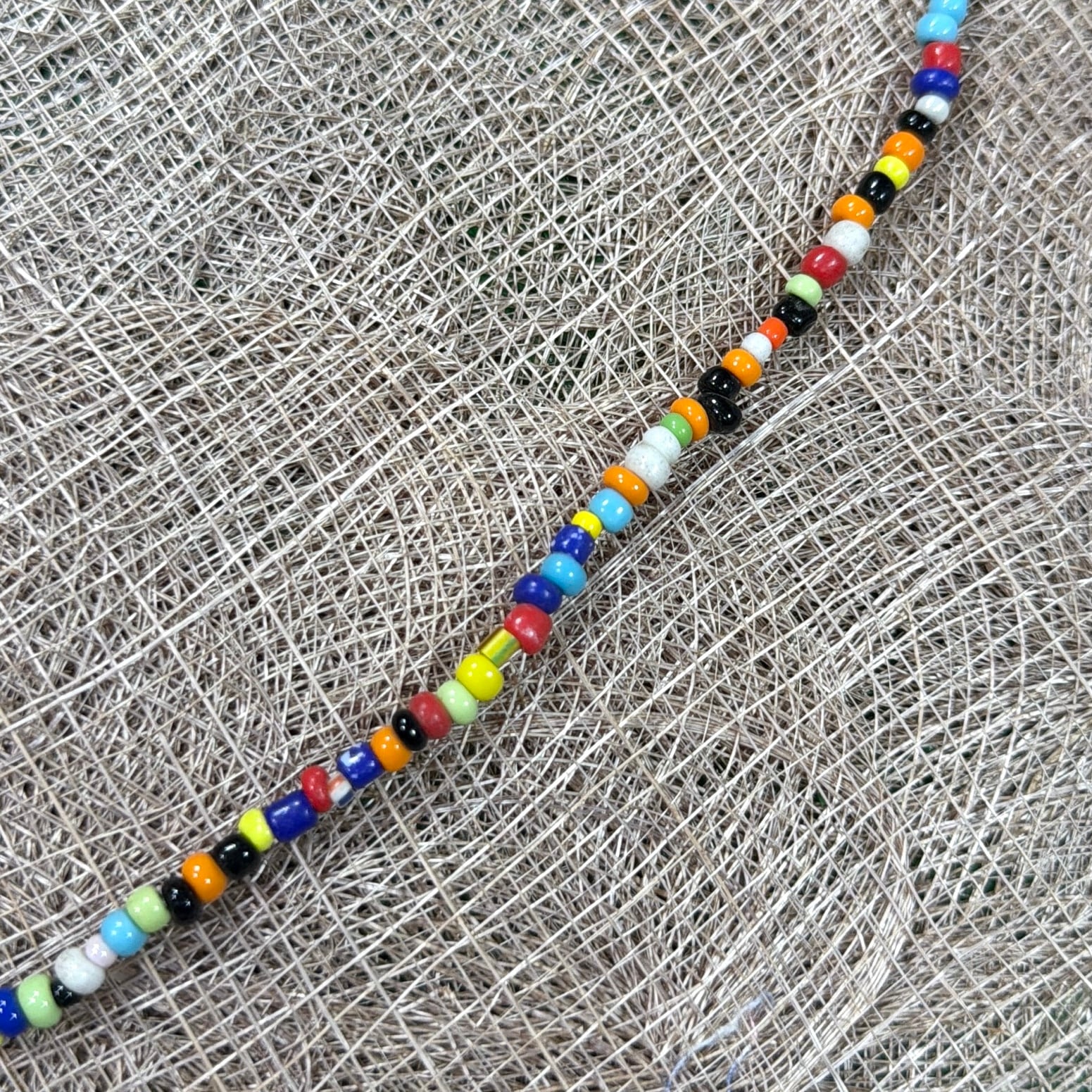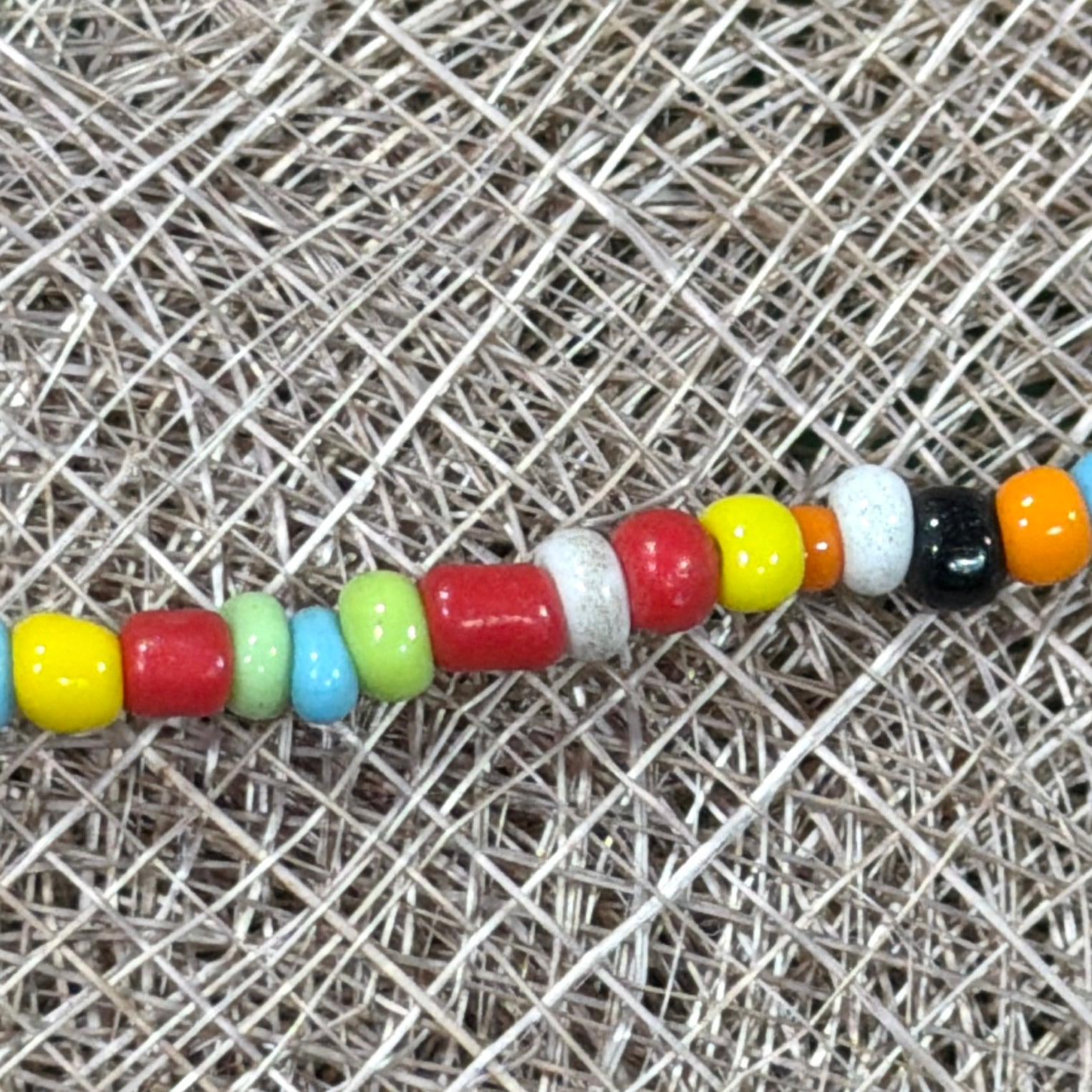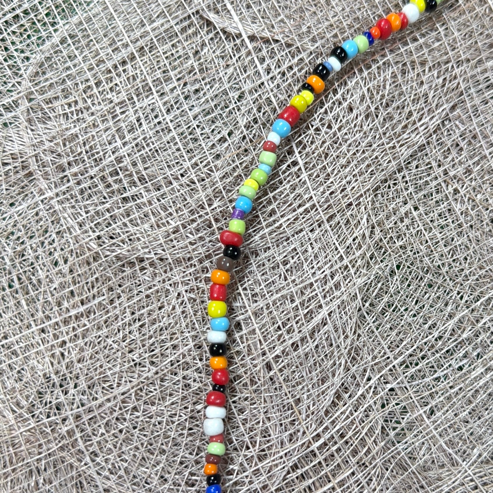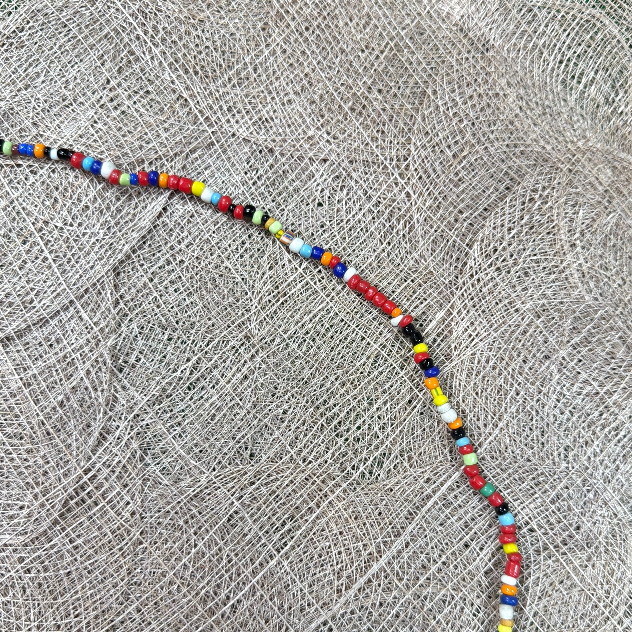細かなビーズが連なり、色彩豊かなデザインが目を引く一点。程よい光沢感とランダムな色の配置が、手仕事の温かみを感じさせます。