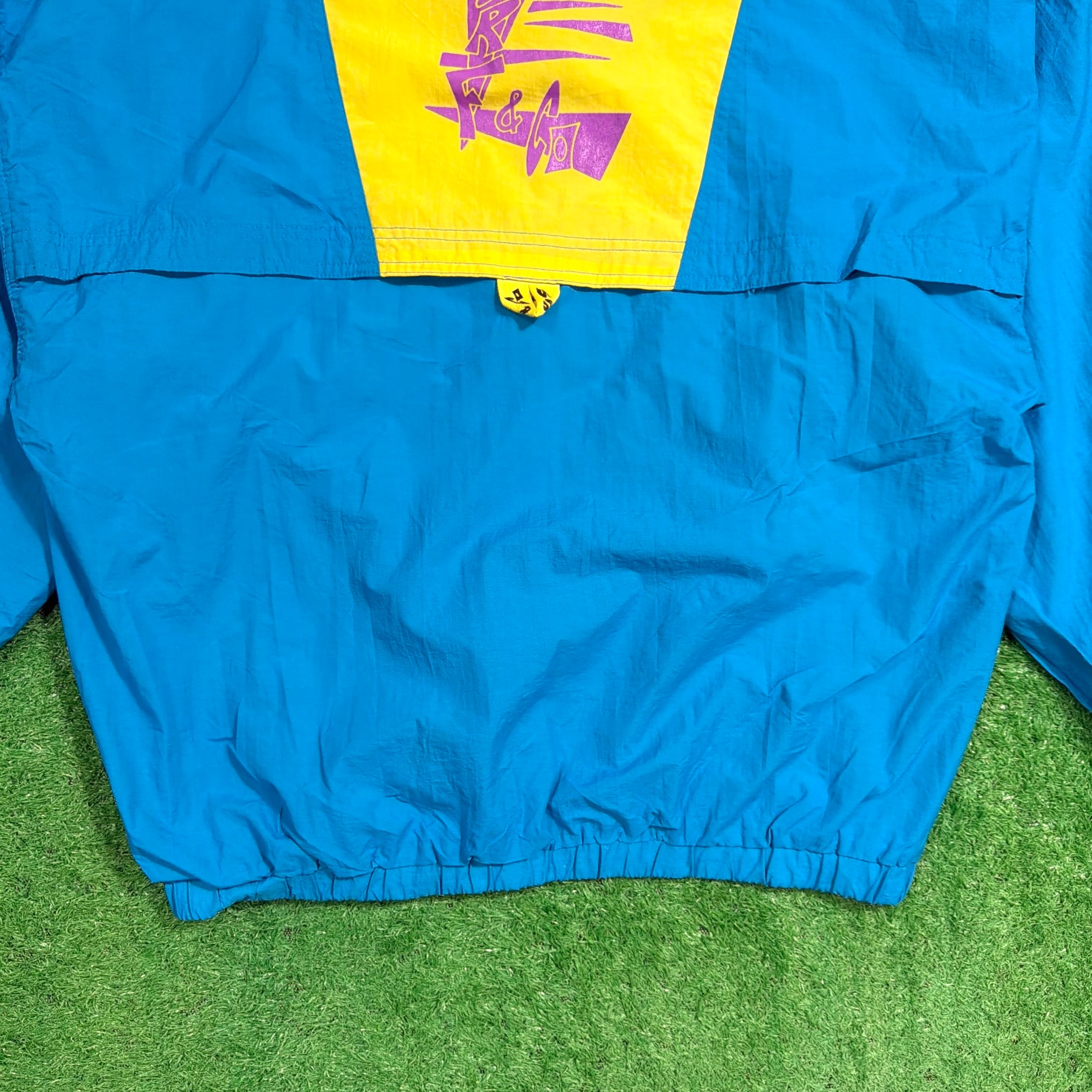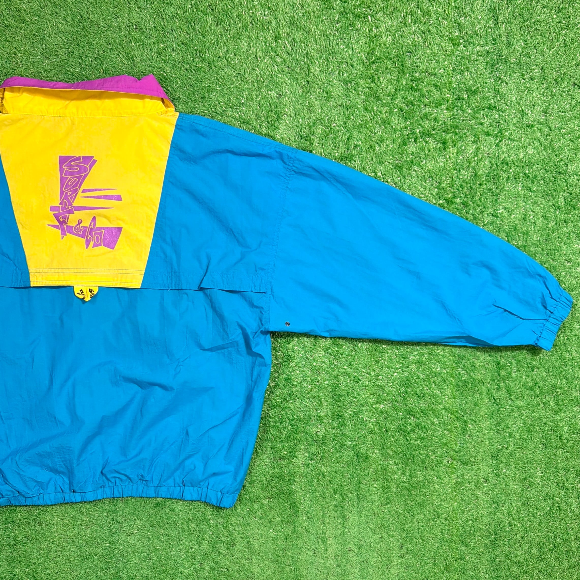 ターコイズブルー・イエロー・パープルの配色が目を惹く一着で、90sのサーフカルチャーやスケータースタイルを感じさせるデザイン。軽くてゴワっとした薄手のナイロン素材で、春や秋のライトアウターとしても活躍します。フロントはハーフジップ仕様、背面には大胆なロゴプリント入り。