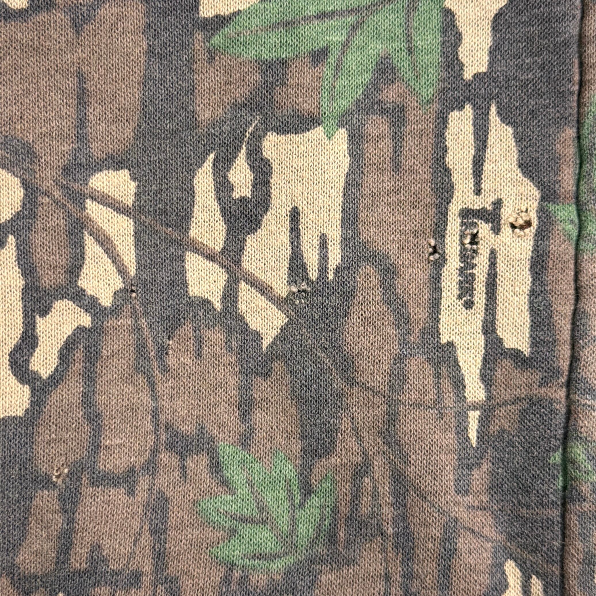 使い込まれた色褪せ・擦れ・小さなダメージが古着特有の良い味として出ています。柔らかくくたっとしたボディで、リアルツリー柄も少し掠れたような風合いになっており、ワーク・アウトドア・ストリートのカルチャーを感じられる1枚です。