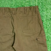 丈夫なコットン素材に、カーキカラーがミリタリーテイストを感じさせる一本です。サイドにはフラップ付きのポケット、バックにもポケットが付き、ベイカーパンツのような実用的なデザインが特徴。裾はやや太めのストレートシルエットで、無骨ながらもタウンユースに馴染むアイテムです。