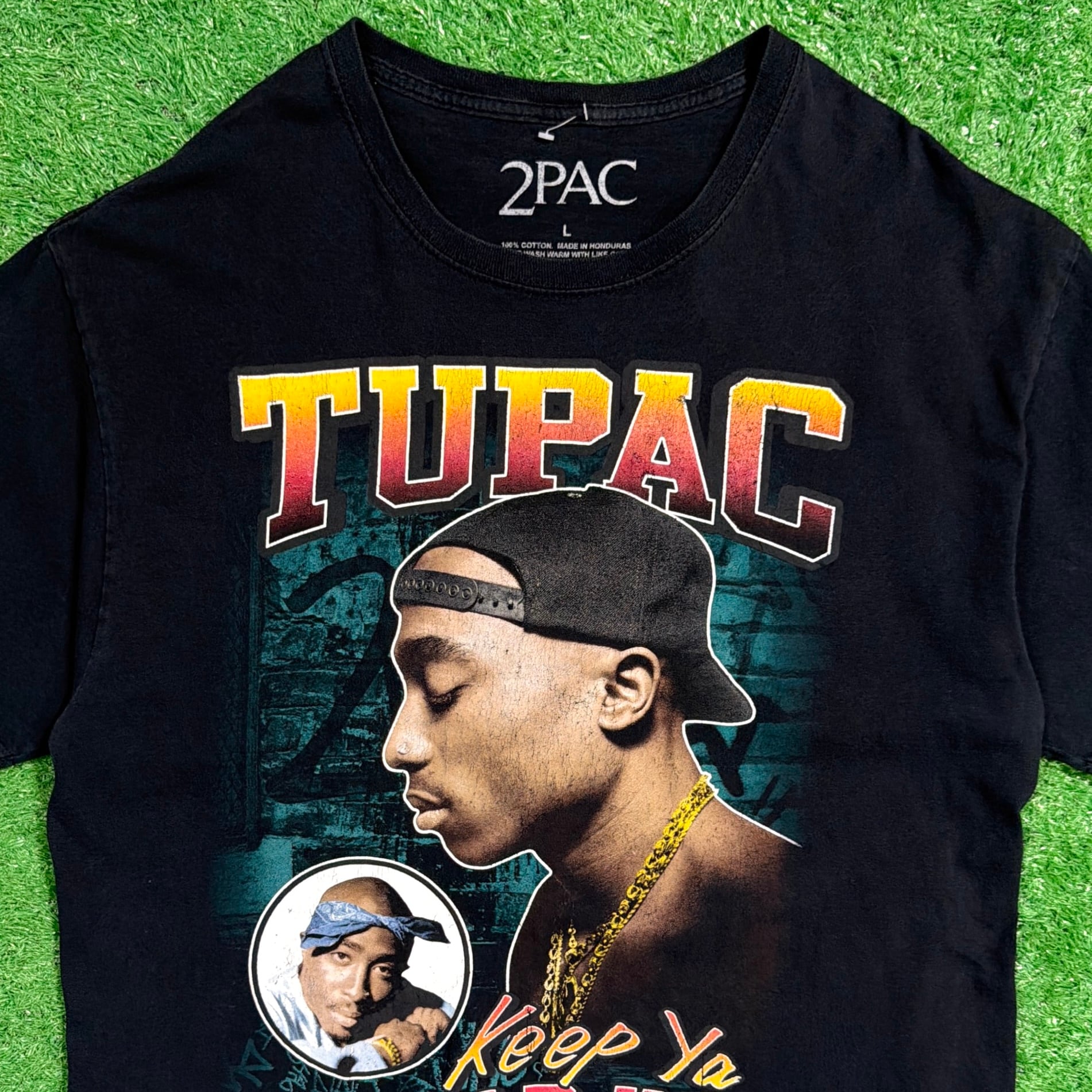 フロントには代表曲「Keep Ya Head Up」にちなむメッセージと、2PACのポートレートが大胆にプリントされたデザイン。カラーリングはクラシックなラップTらしいグラフィックで、ブラックボディとのコントラストが効いた一枚です。