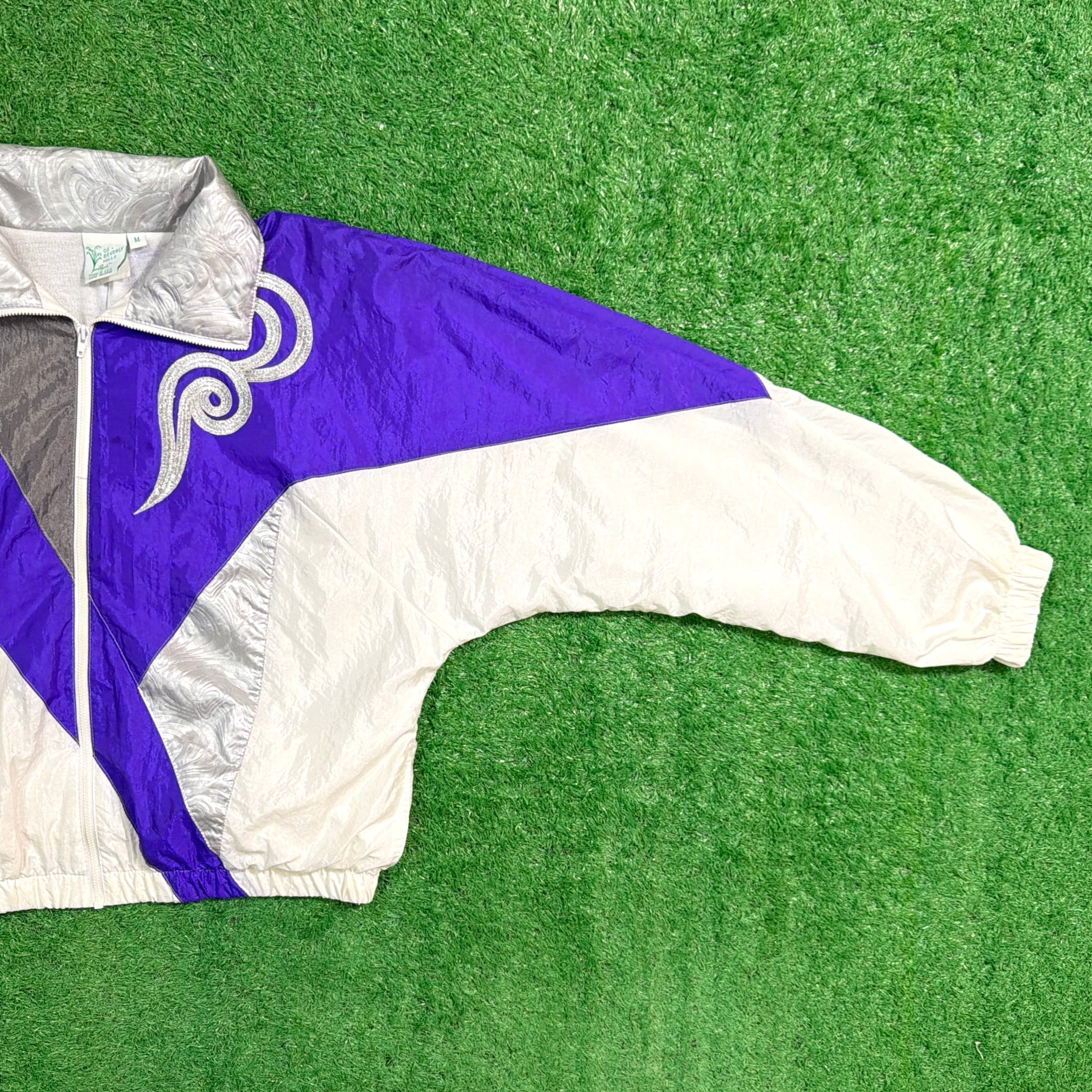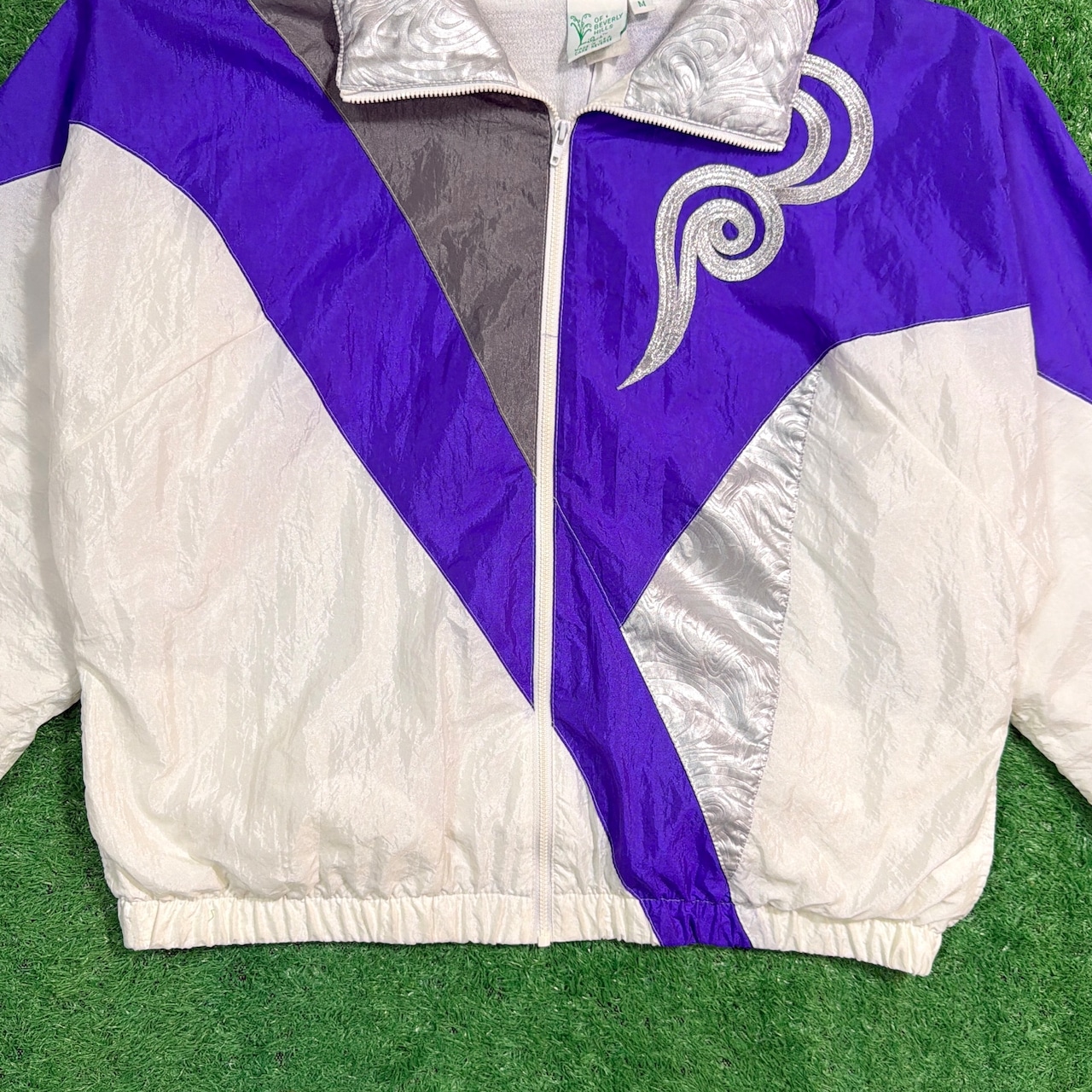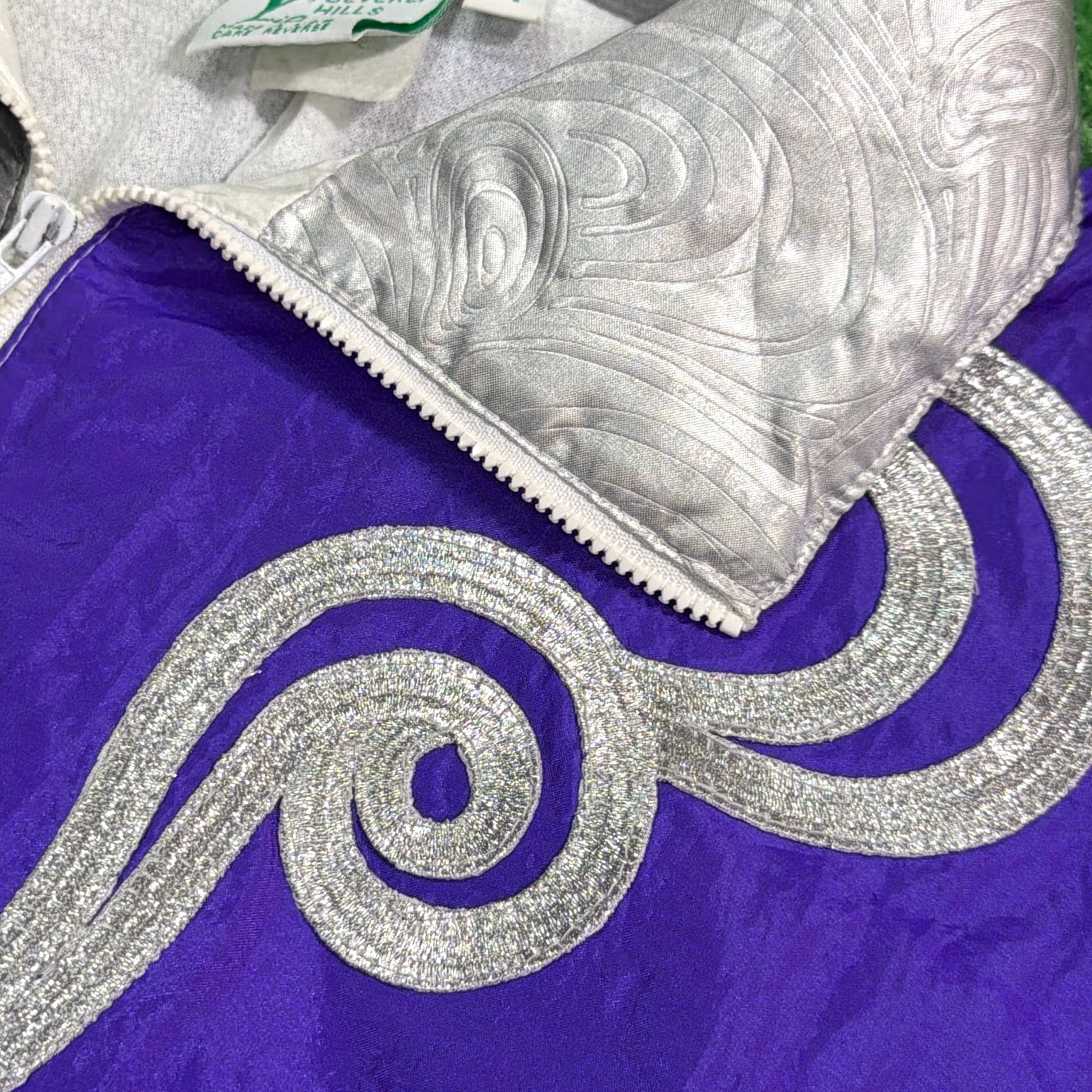 ホワイト×パープルを基調に、胸元の曲線刺繍や切り替えデザインが特徴的な一着。シャカシャカとした軽量ナイロン素材で、程よくハリのある質感です。襟部分の裏地は模様付きで光沢感のシルバー仕様。