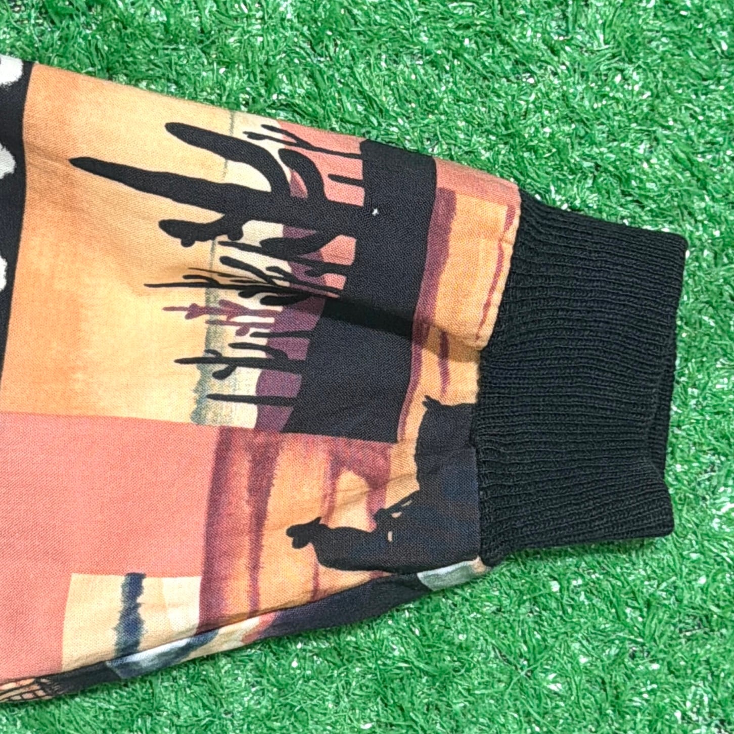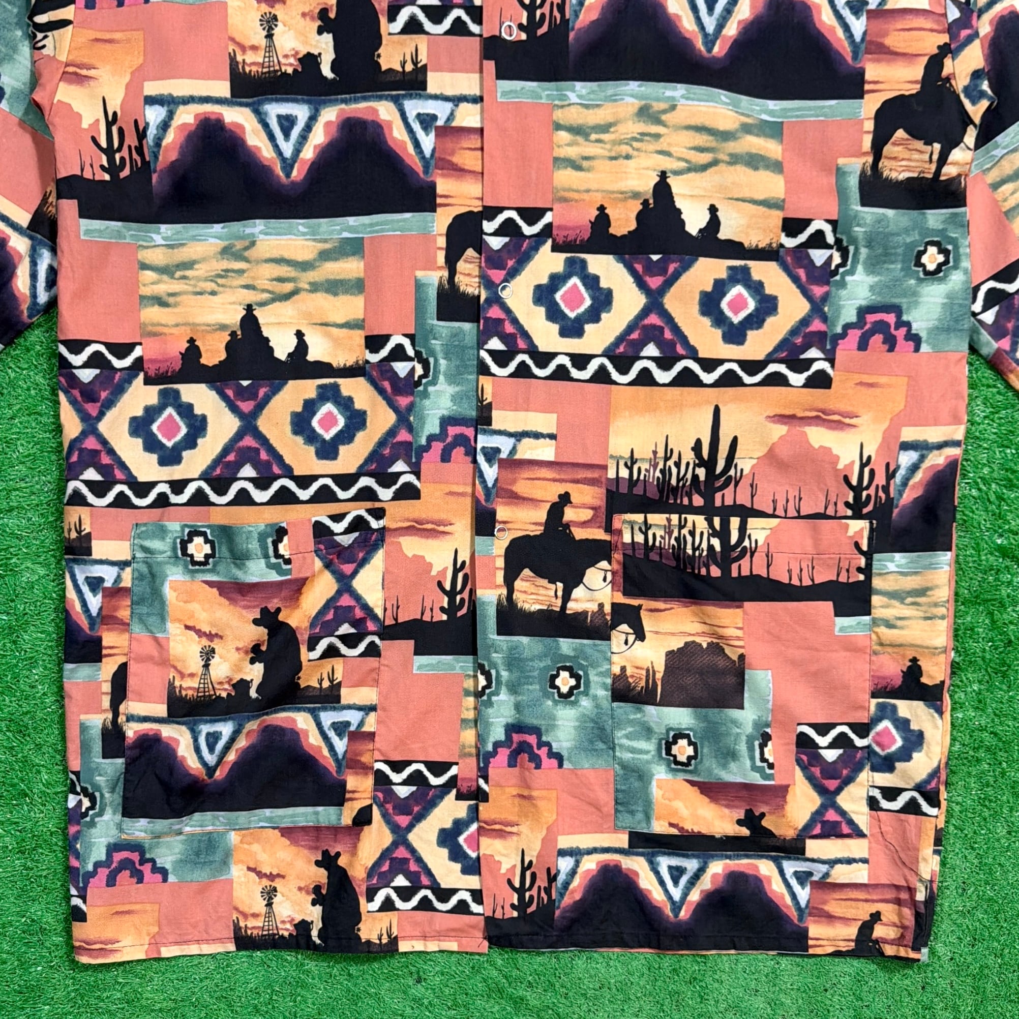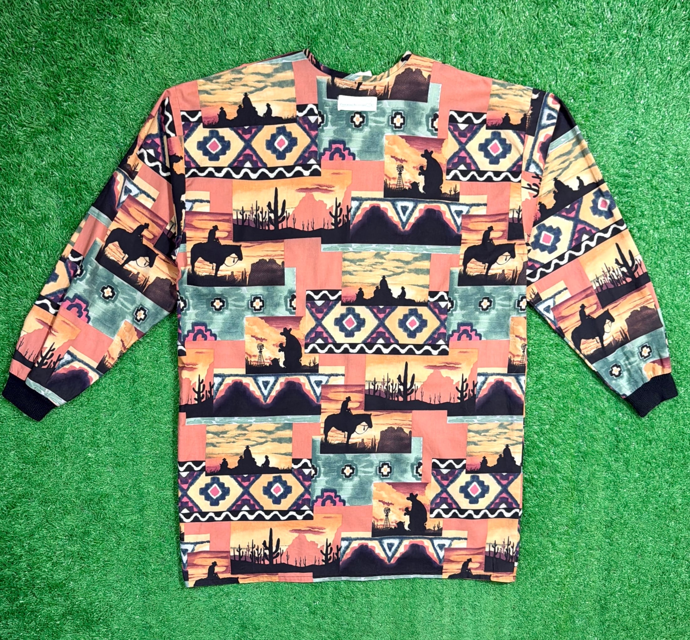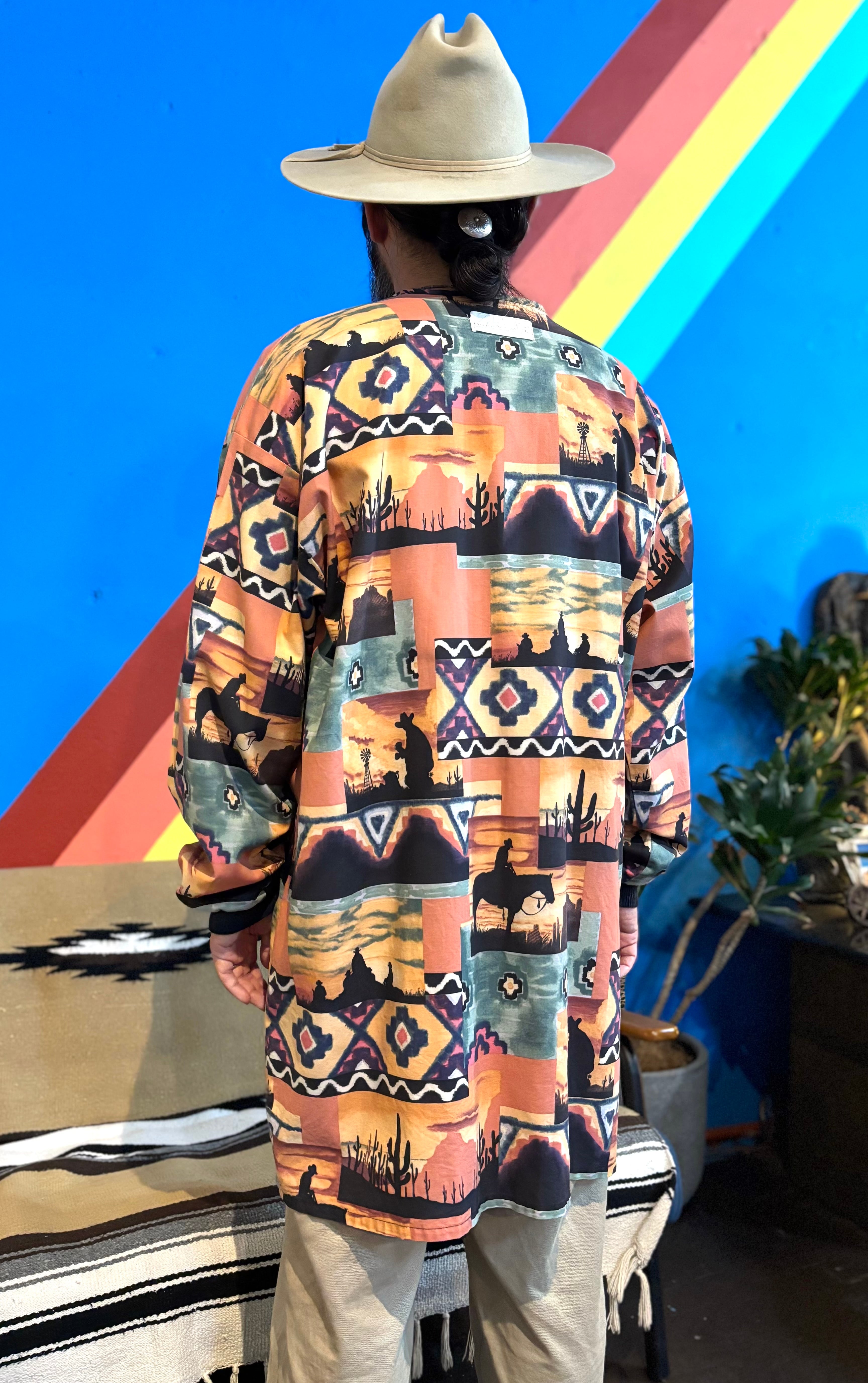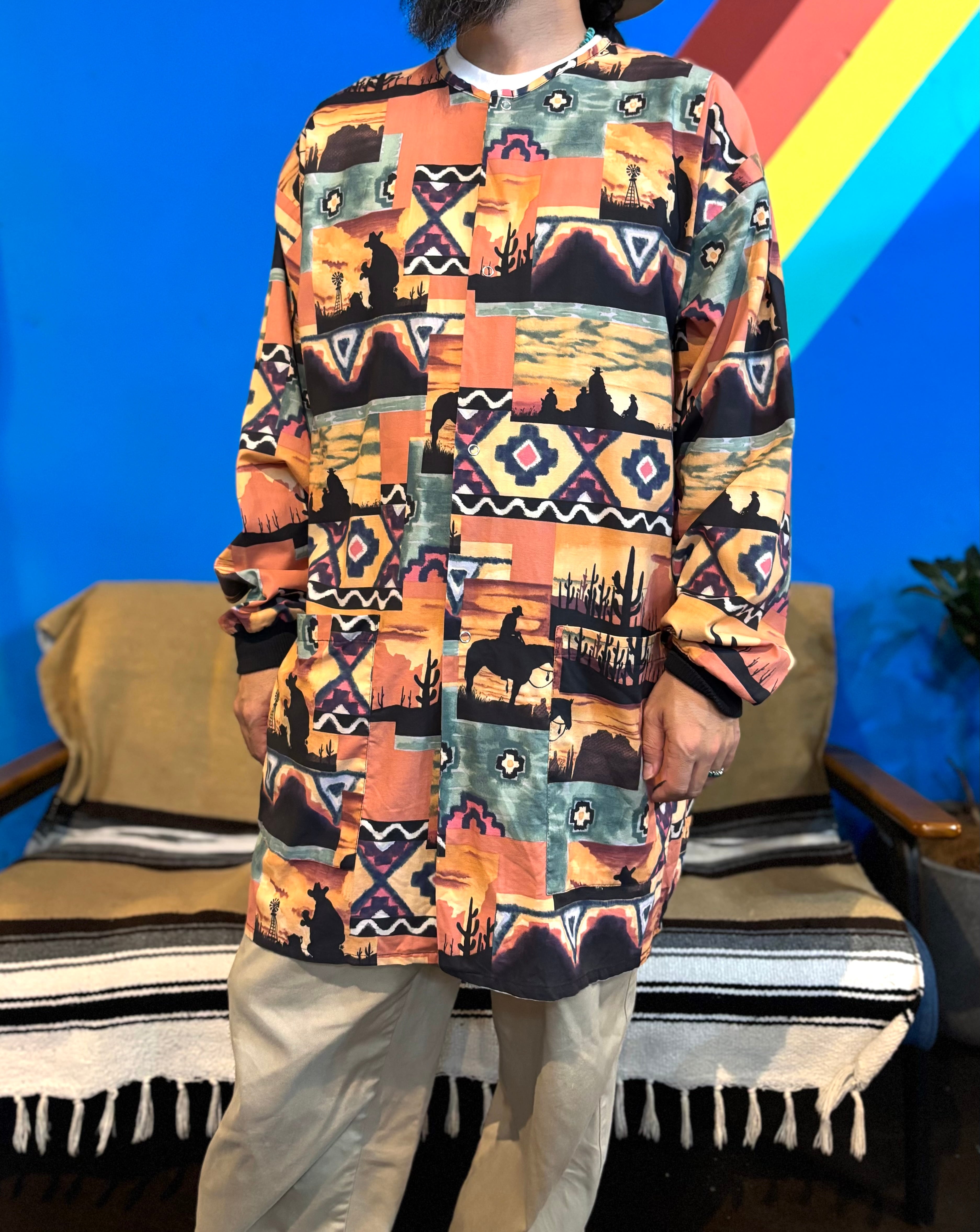 夕焼けの荒野やサボテン、カウボーイのシルエットなど、西部劇のような風景が全面に描かれたインパクトのある1着。ネイティブ柄やオルテガ調の幾何学模様も組み合わさり、ウェスタンカルチャーを感じられる独特のデザインです。