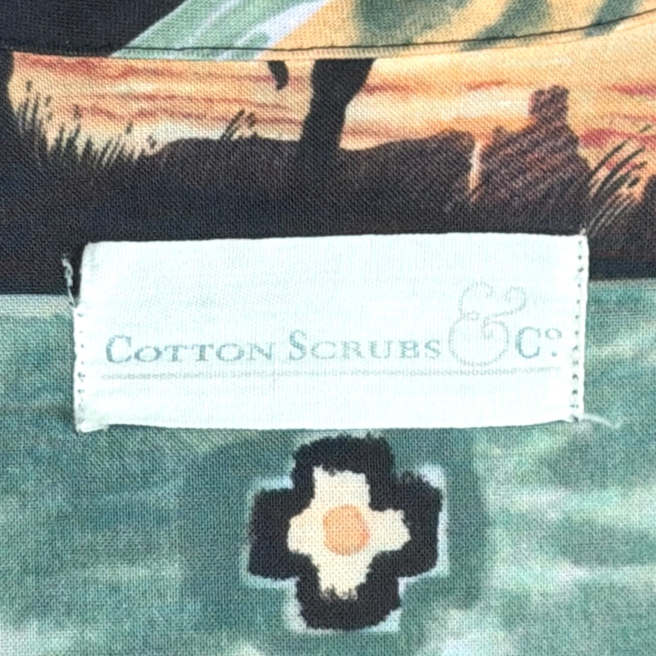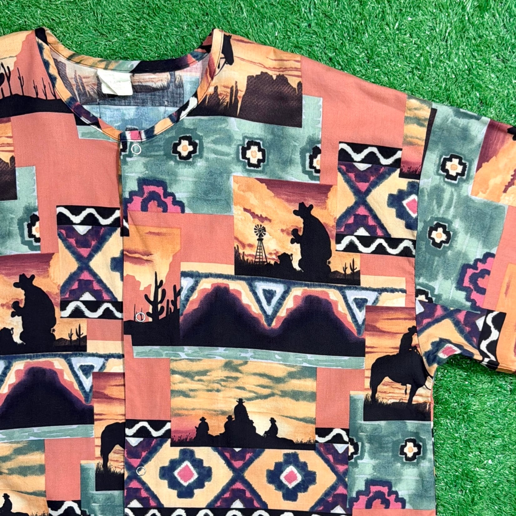 1990~2000年代ごろのアメリカ製、カウボーイモチーフのノーカラー スクラブシャツです。