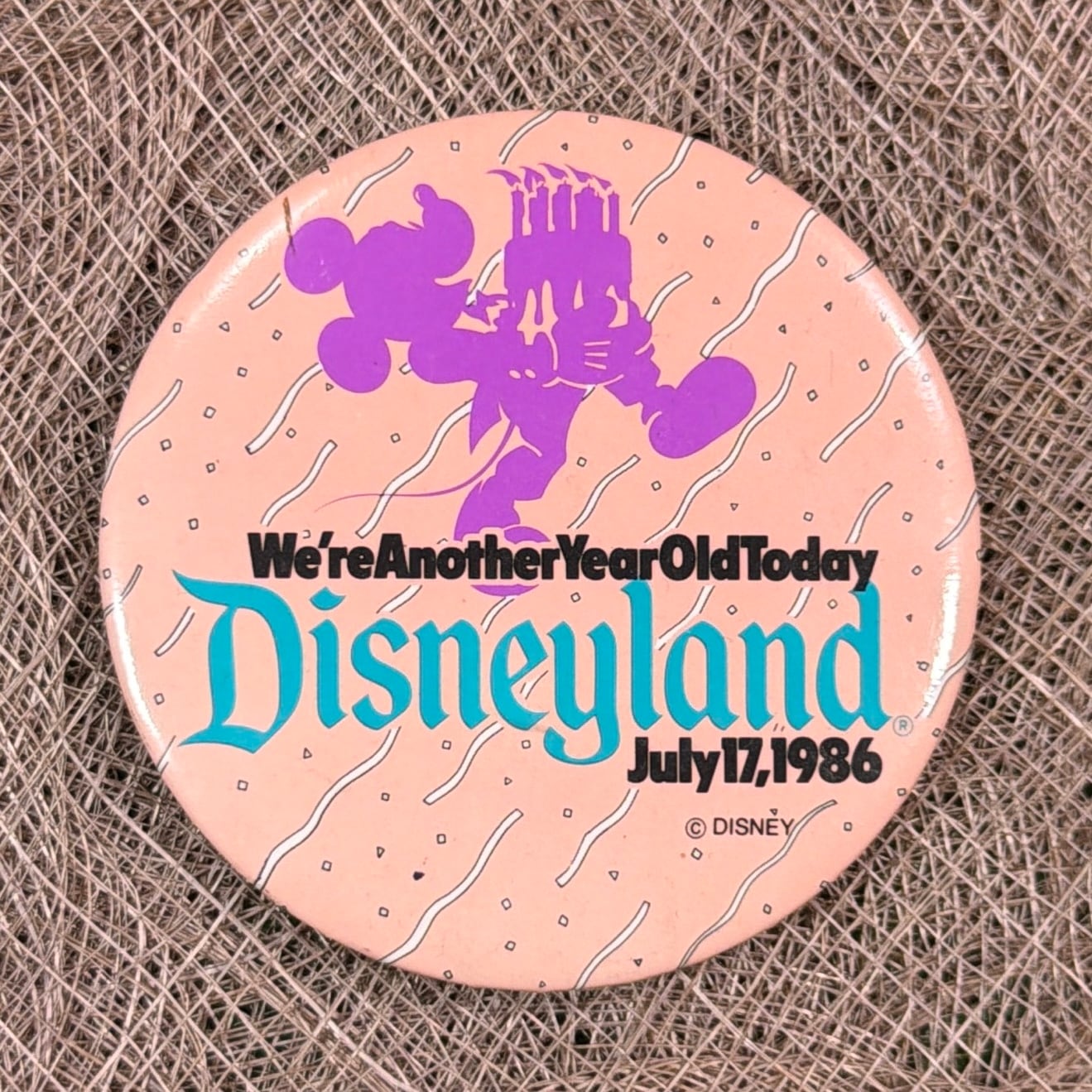 1986年7月17日にカリフォルニア・アナハイムのDisneylandで配布された、アニバーサリー記念のミッキー缶バッジです。「We’re Another Year Old Today」というメッセージと、バースデーケーキを運ぶミッキーのシルエットがデザインされた、来園者向けの記念アイテム。