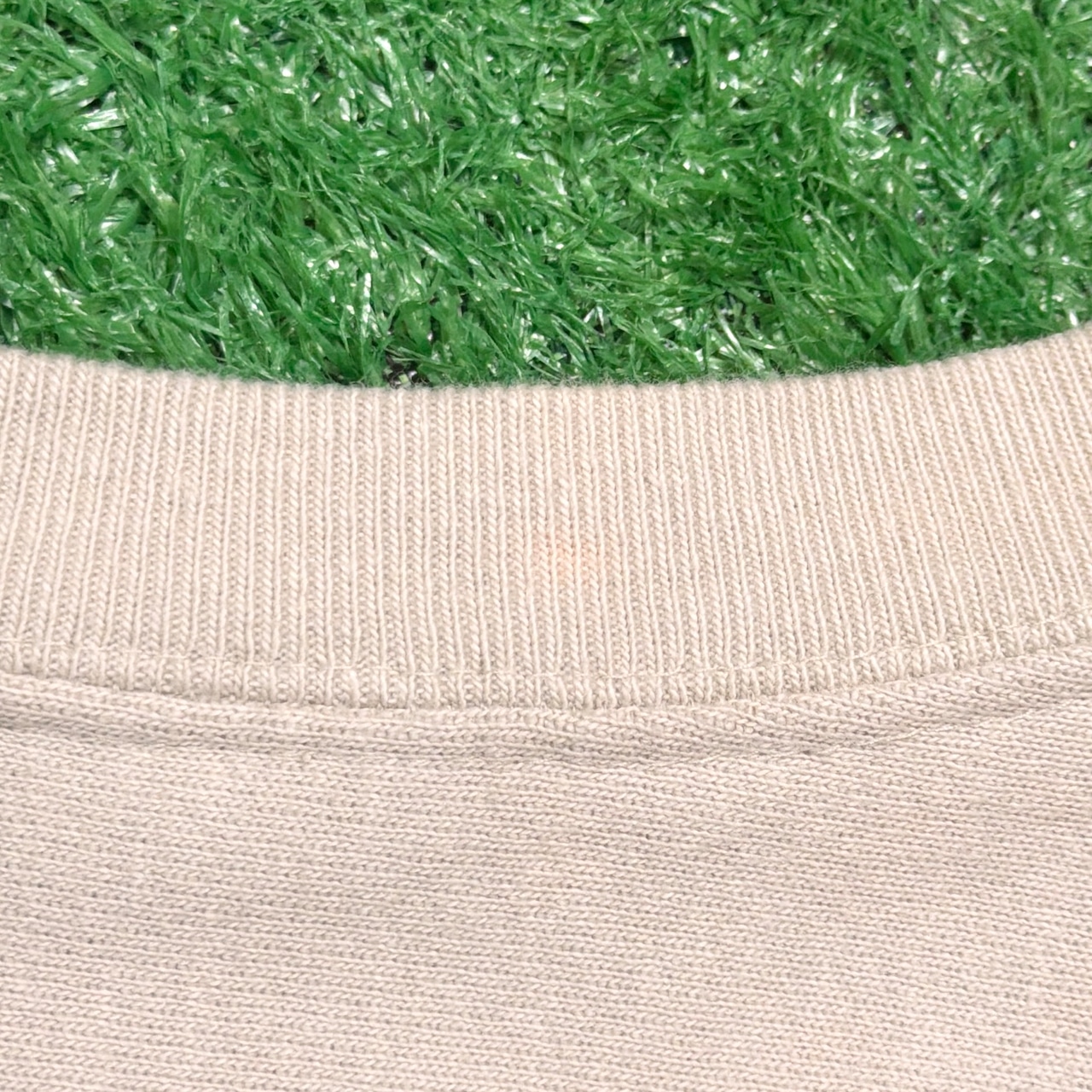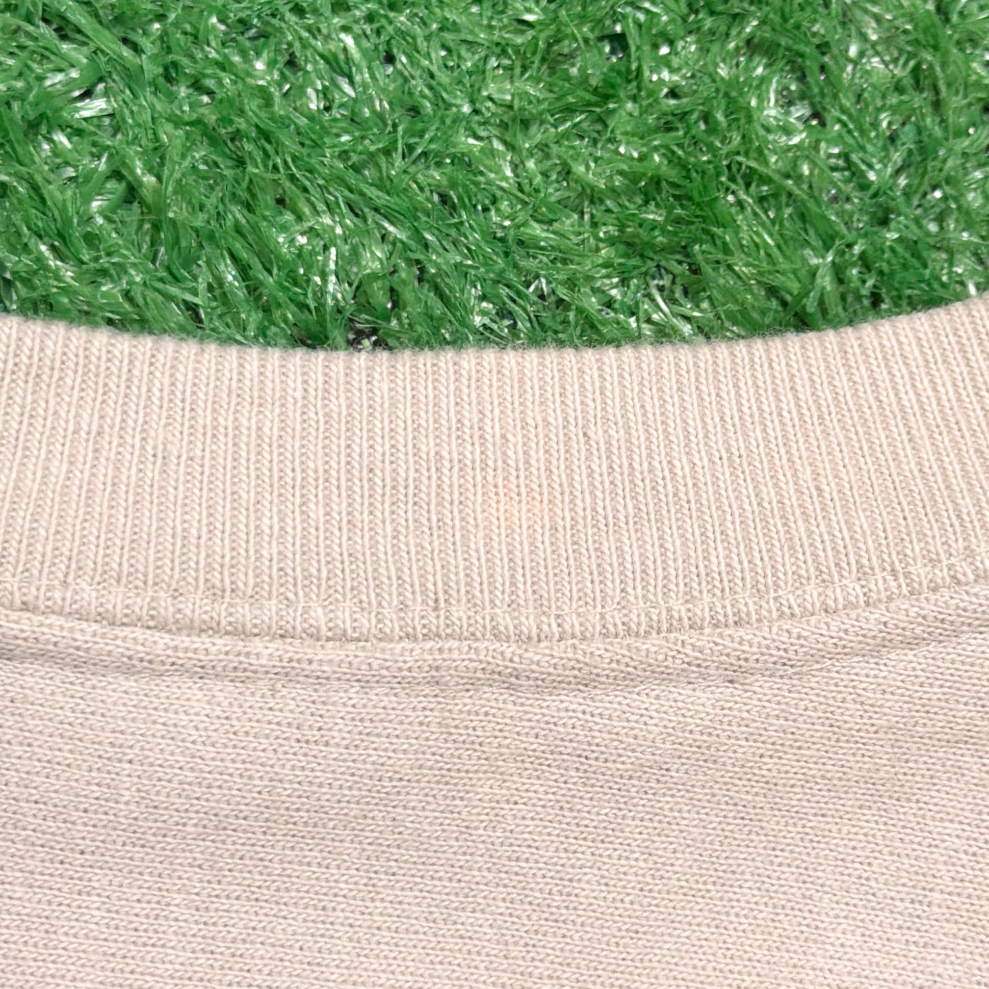 柔らかなクリームベージュカラーが落ち着いた印象で、胸元と袖口に入った小さなCロゴ刺繍がアクセント。襟元の色落ちや、ところどころに見られる汚れも古着らしい味わいとして楽しめる一着です。肉厚でしっかりとしたリバースウィーブ特有の生地感が、長く着込むほどに馴染んでいきます。